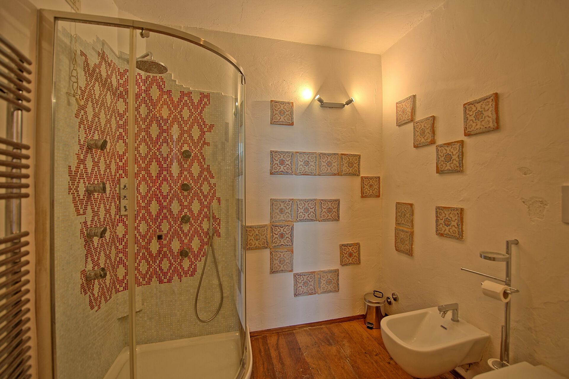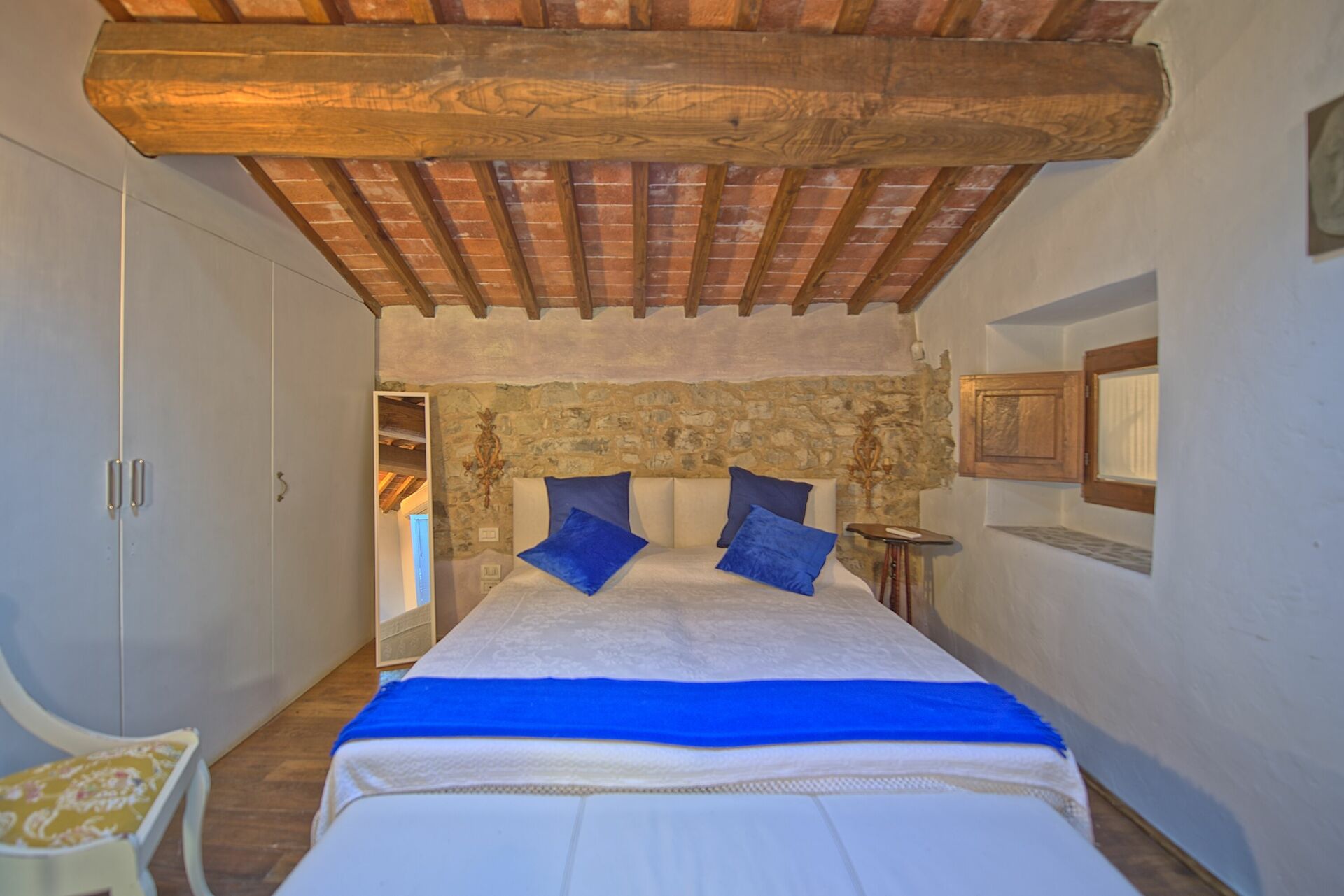 Eerste verdieping: Een wenteltrap leidt vanuit de woonkamer naar de hoofdslaapkamer, die uitkijkt op de ruimte beneden. Deze kamer is voorzien van airconditioning en een privébadkamer met een ligbad. De tweede tweepersoonsslaapkamer is toegankelijk via de hoofdslaapkamer of rechtstreeks van buitenaf. Wanneer de dubbele deuren tussen beide kamers gesloten zijn, zijn ze volledig onafhankelijk van elkaar. Deze tweede slaapkamer beschikt tevens over een tweepersoonsslaapbank, een kleine kitchenette met een tafeltje en een compacte badkamer met toilet en wastafel.