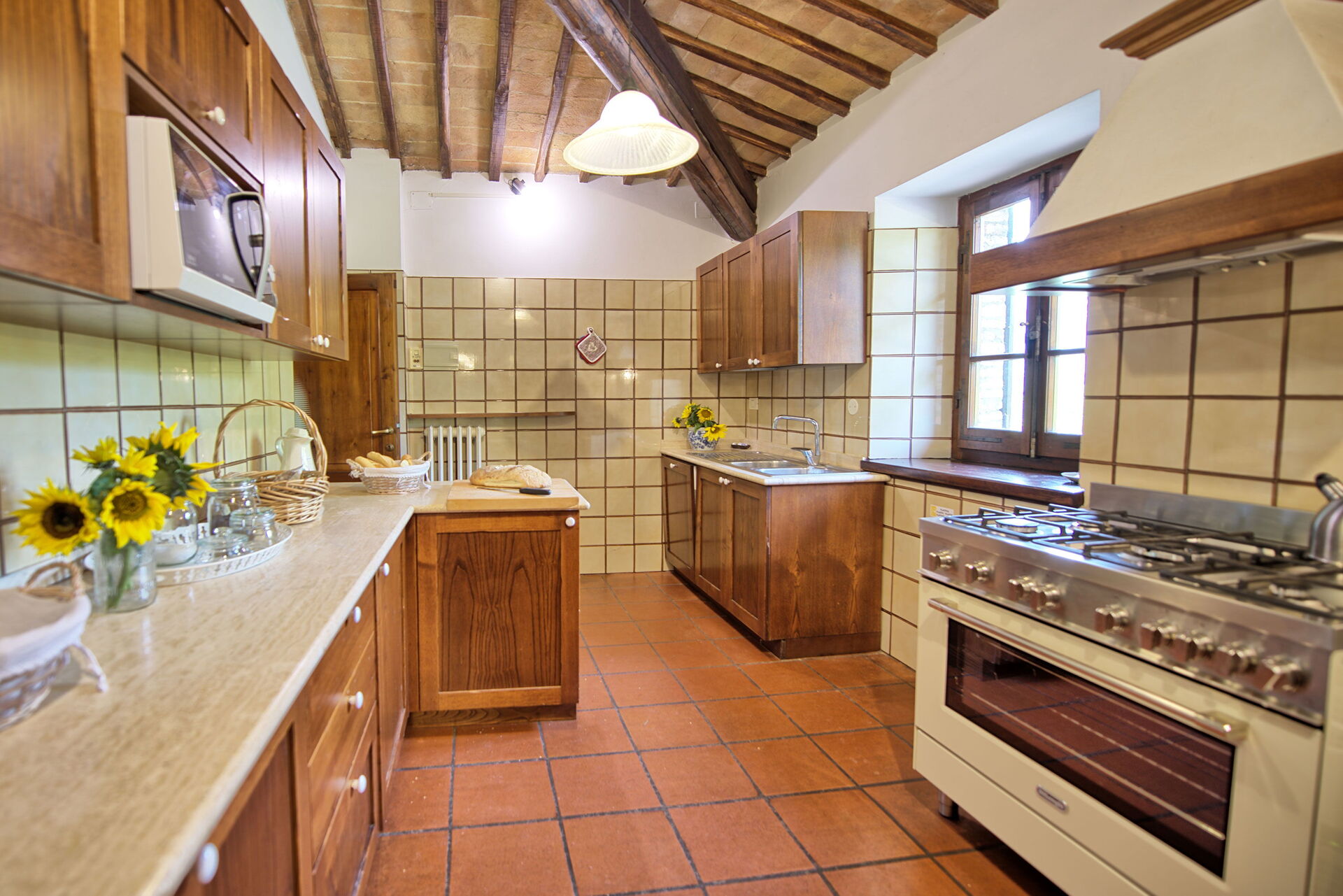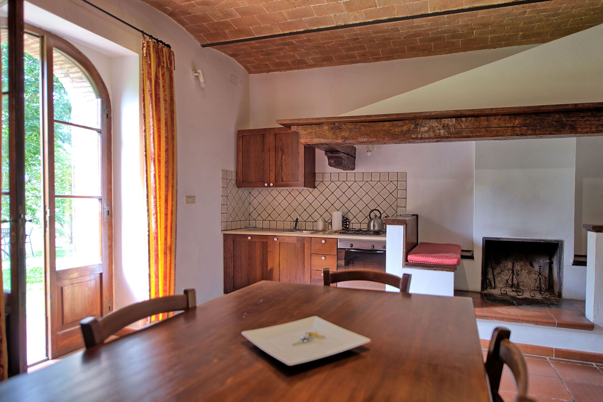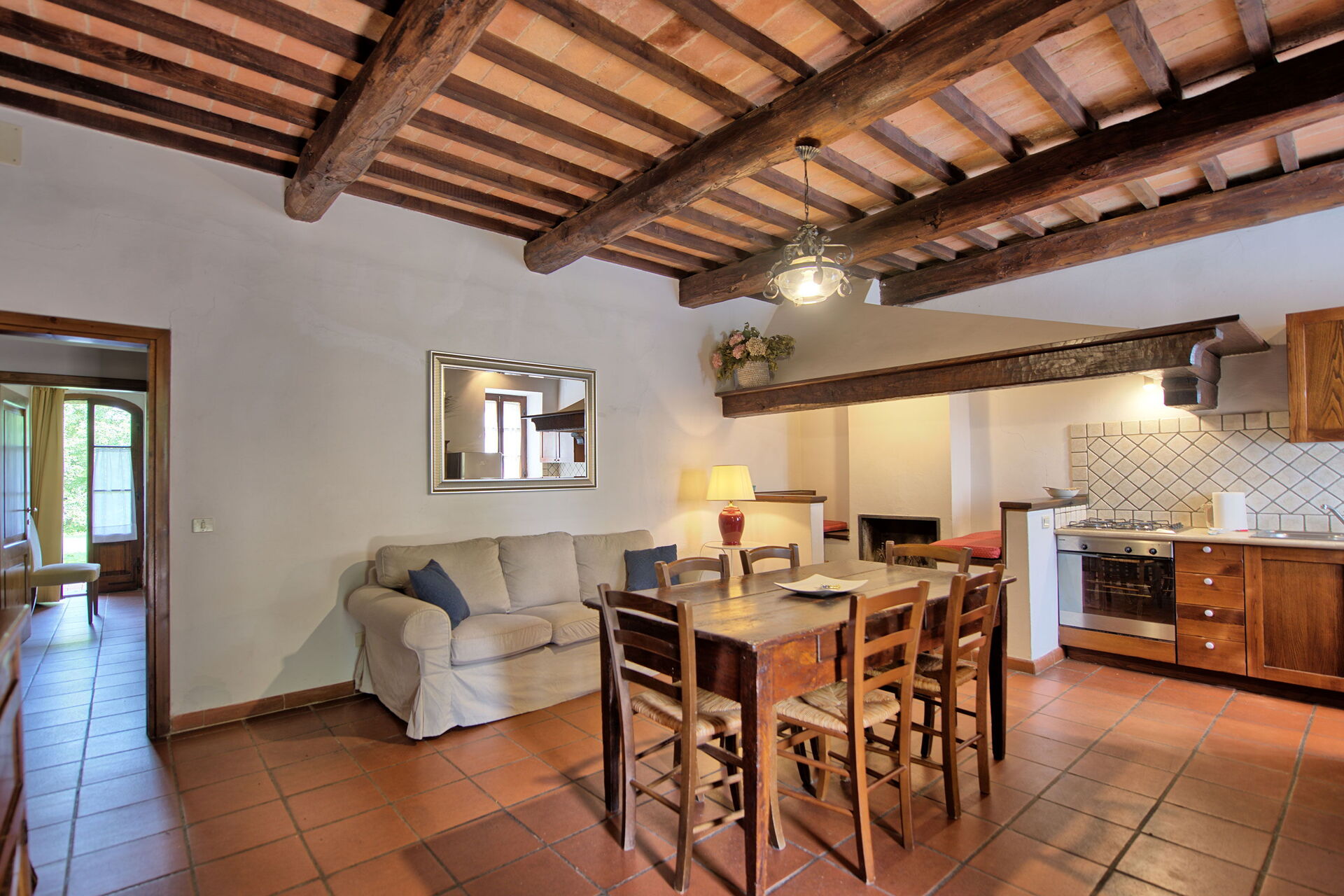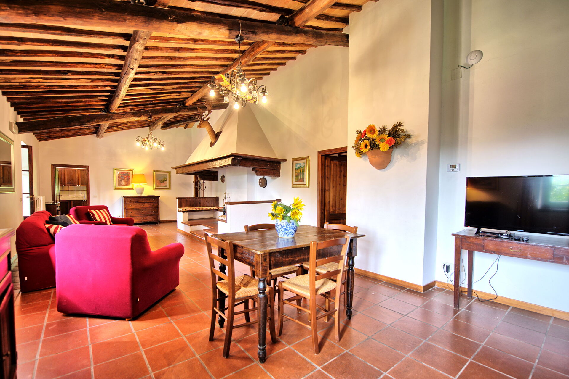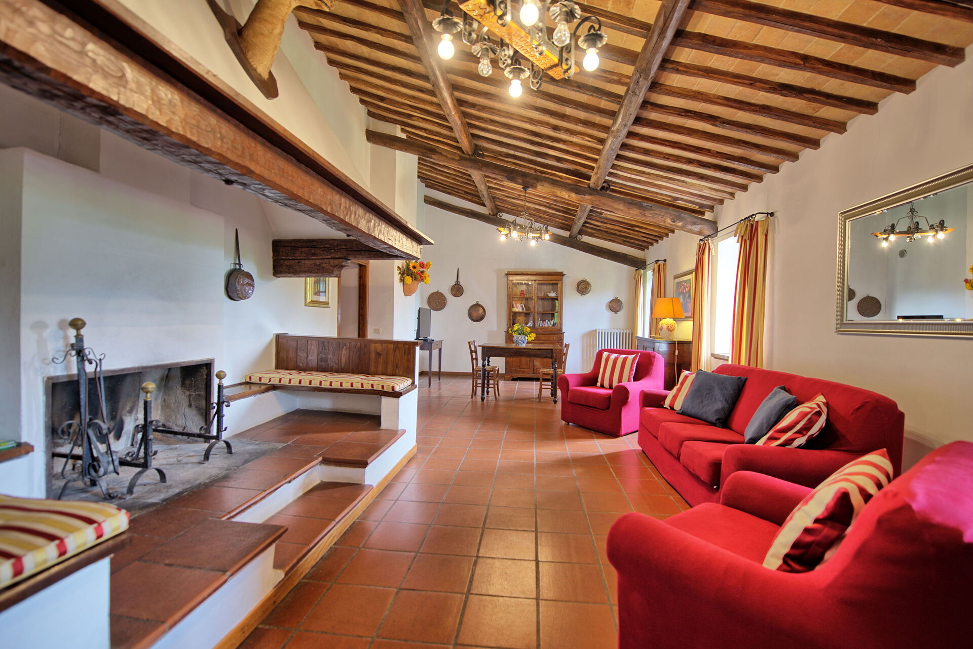 Het stenen huis biedt een prachtig 360° uitzicht op het Toscaanse platteland. Het is zorgvuldig gerenoveerd met behoud van originele details zoals grote open haarden, terracotta vloeren en houten balkenplafonds.