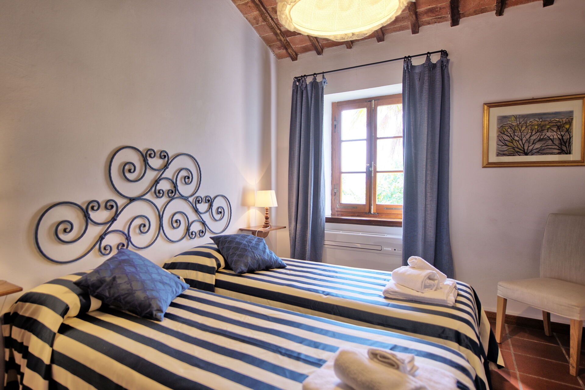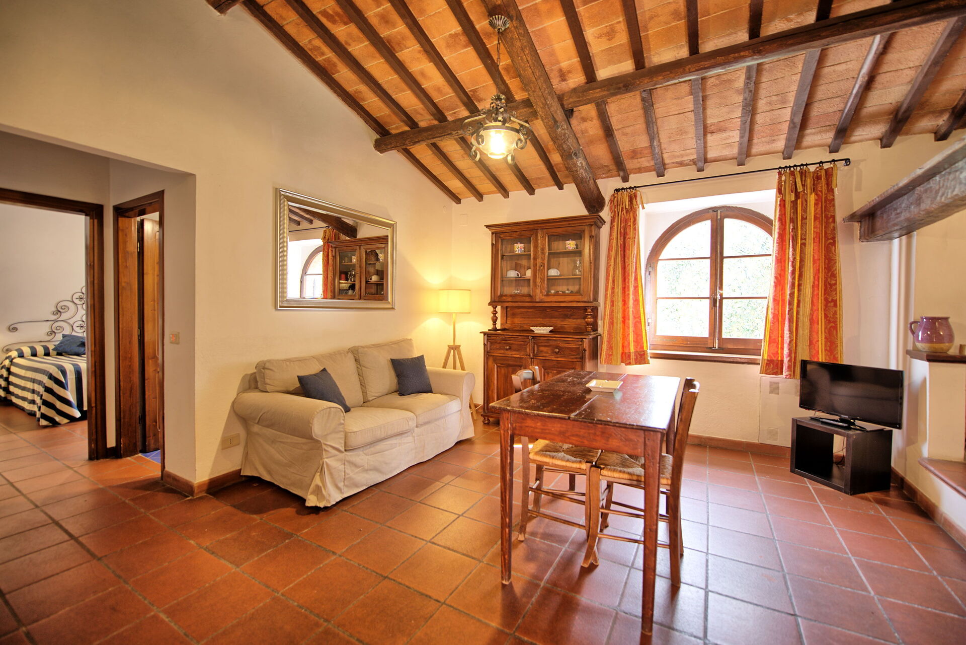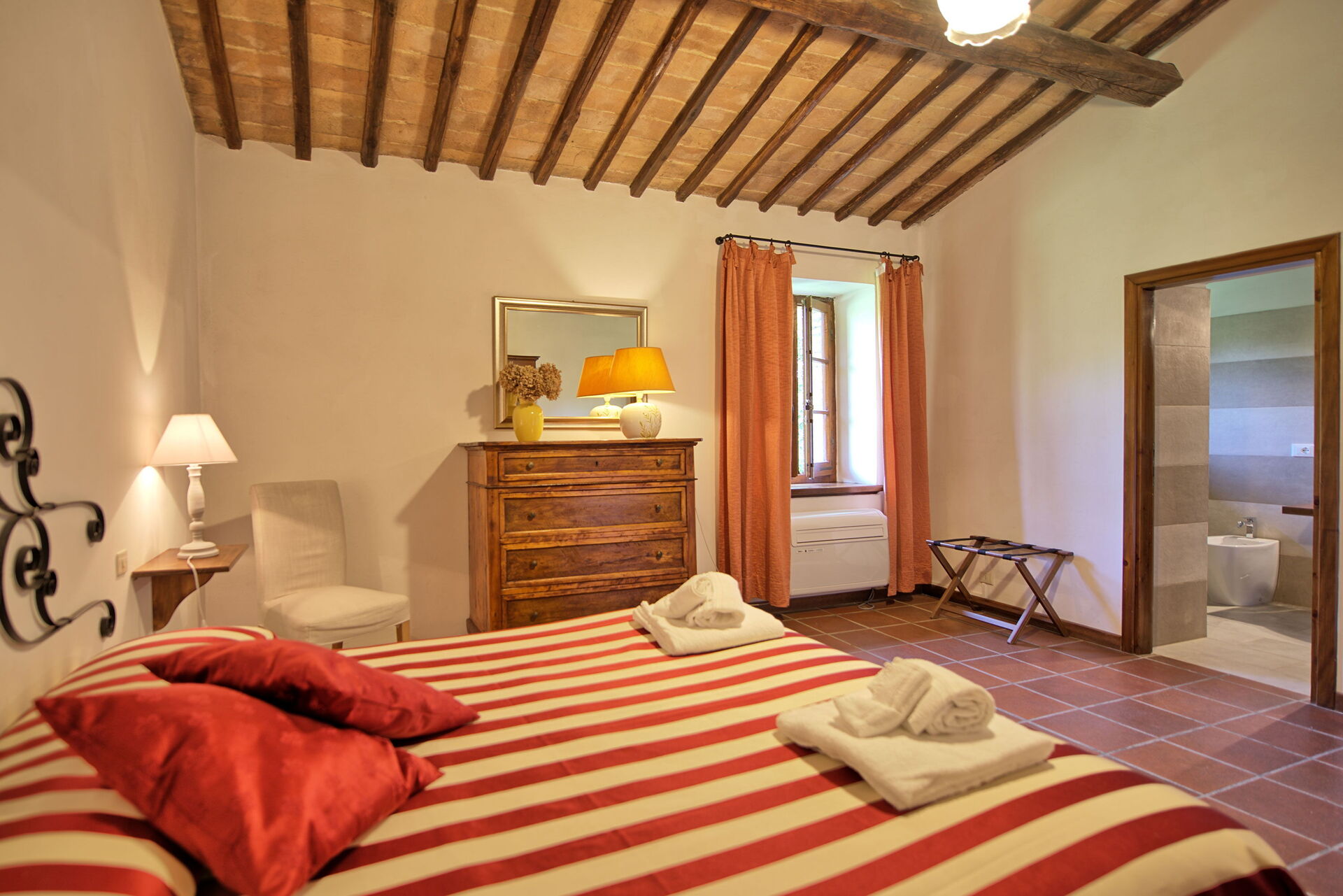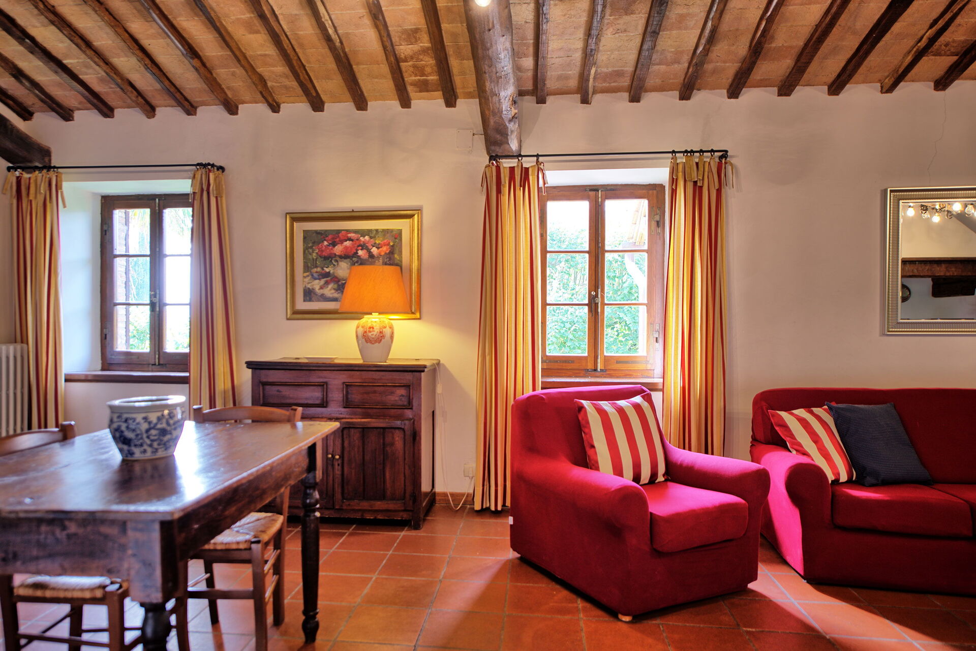 Het stenen huis biedt een prachtig 360° uitzicht op het Toscaanse platteland. Het is zorgvuldig gerenoveerd met behoud van originele details zoals grote open haarden, terracotta vloeren en houten balkenplafonds.