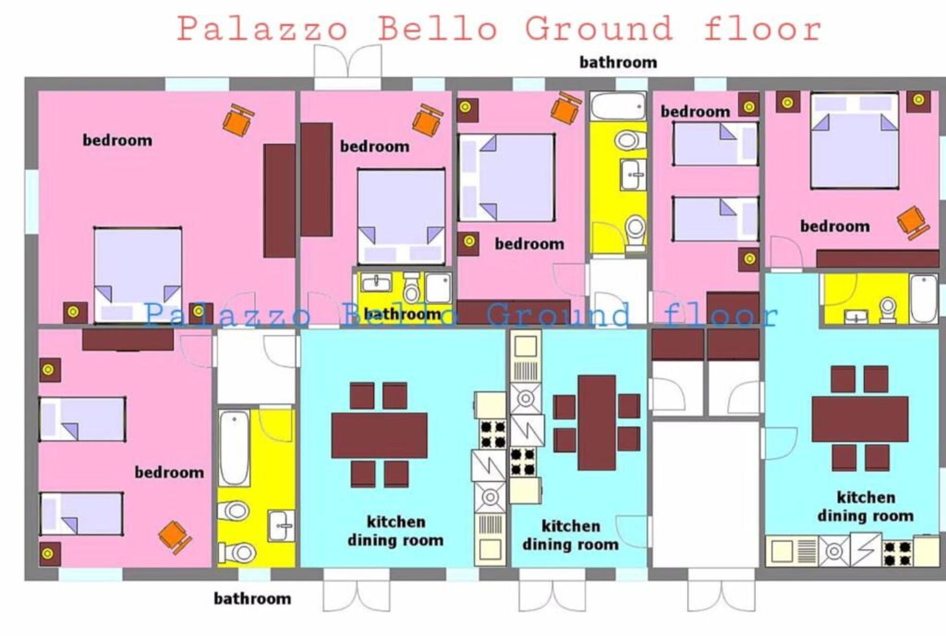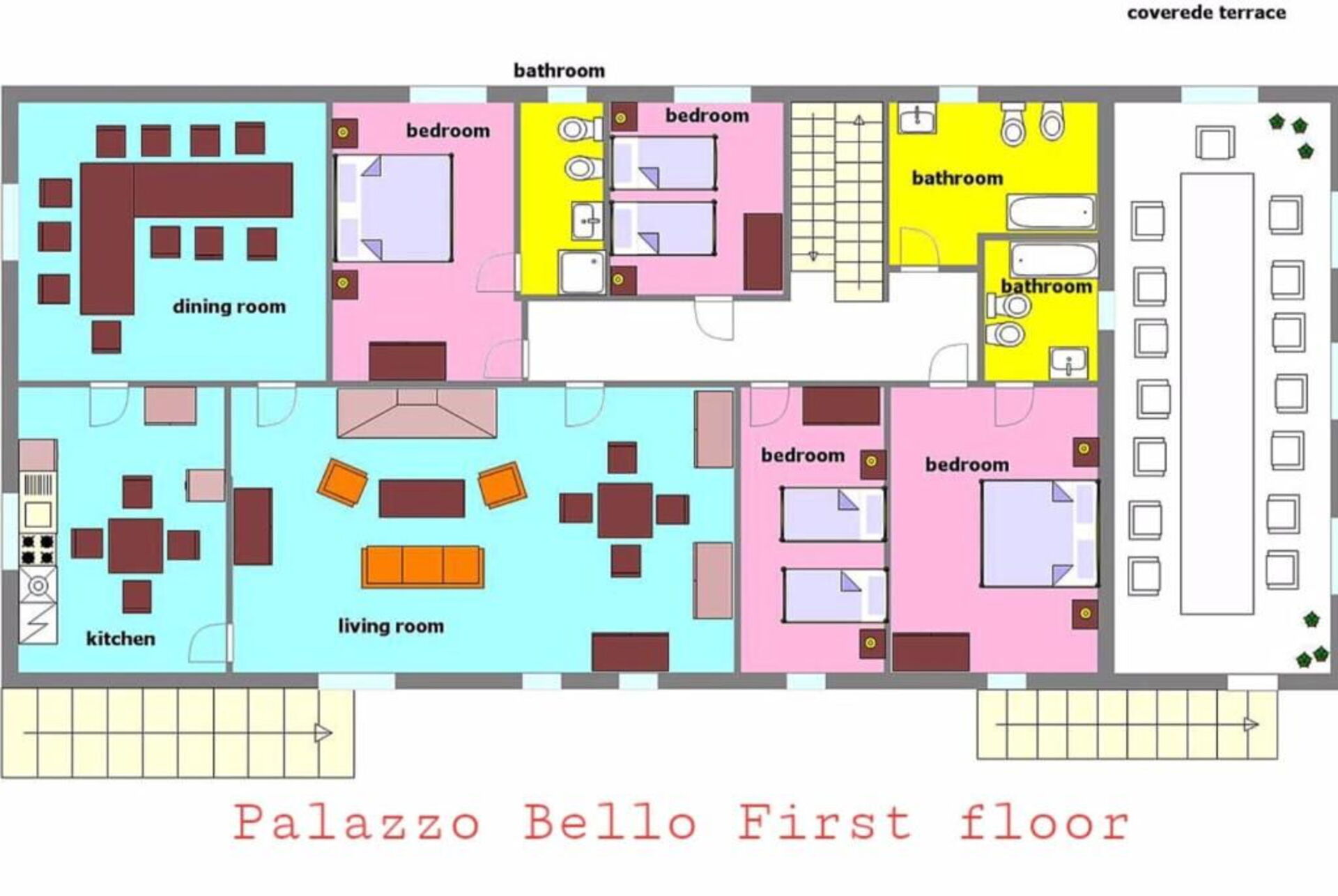 Het pand is perfect voor grote groepen die samen een vakantie willen doorbrengen zonder in te boeten aan privacy: Palazzo Bello is verdeeld in 4 appartementen en biedt in totaal 10 slaapkamers om comfortabel plaats te bieden aan maximaal 20 personen. Op de eerste verdieping is er een grote hal waar de hele groep samen kan komen en samen kan eten. Er is ook een grote buitenveranda die gasten buiten kan huisvesten.