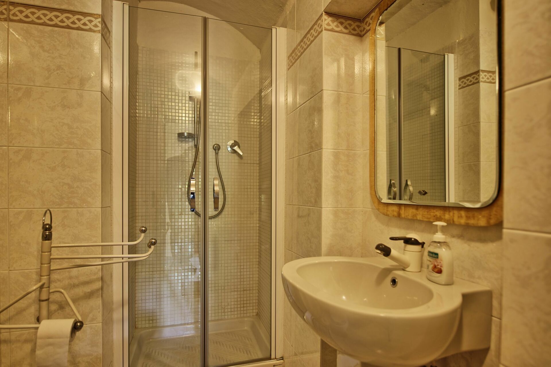 Een slaapkamer met eveneens een fresco plafondschildering en een tweepersoonsbed, 2 slaapkamers (met fresco plafondschilderingen) en tweepersoonsbedden (ook als 2 losse bedden te gebruiken), 1 slaapkamer met 2 eenpersoonsbedden en 2 badkamers; een met een douche en een met een bad.