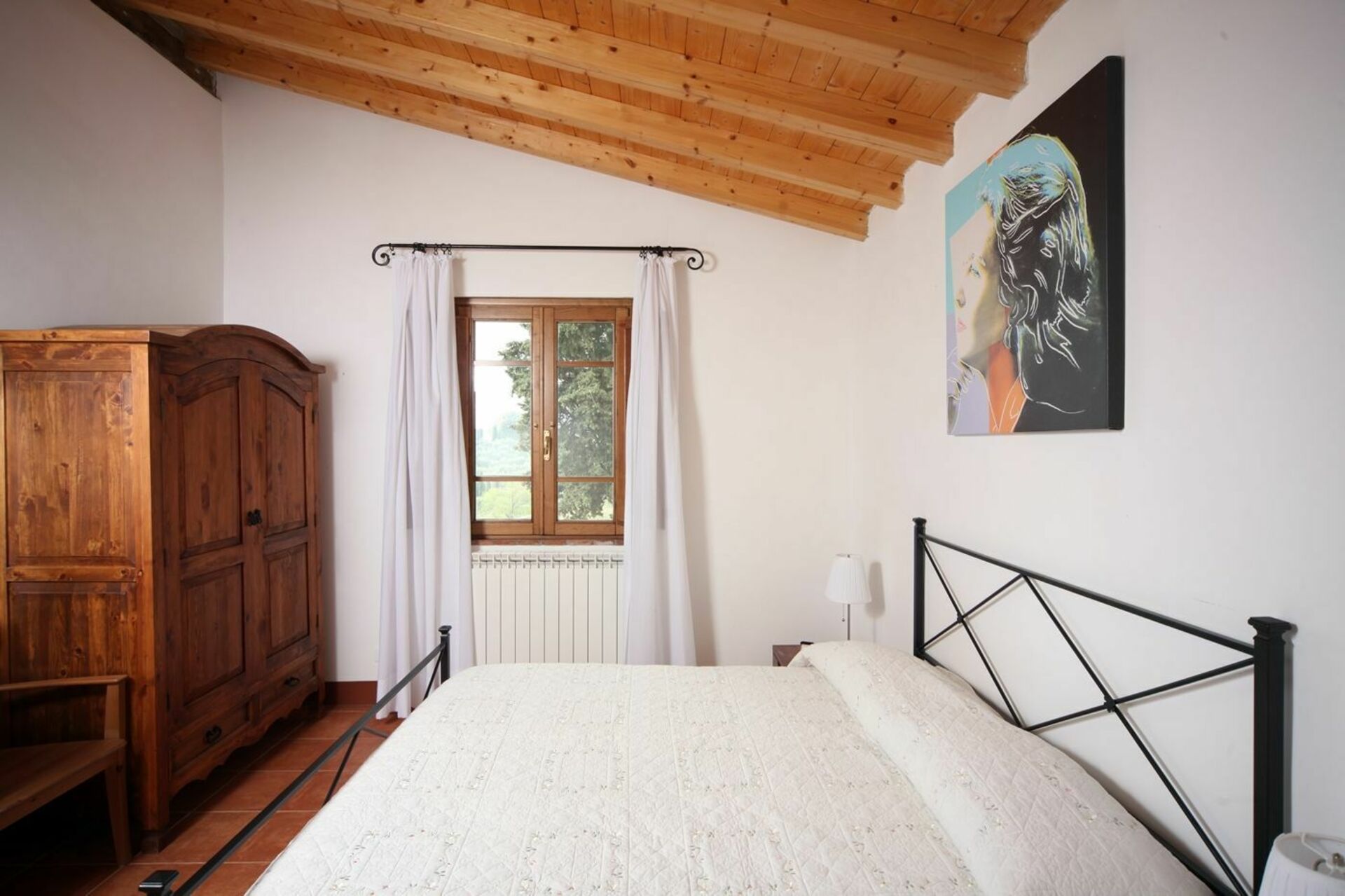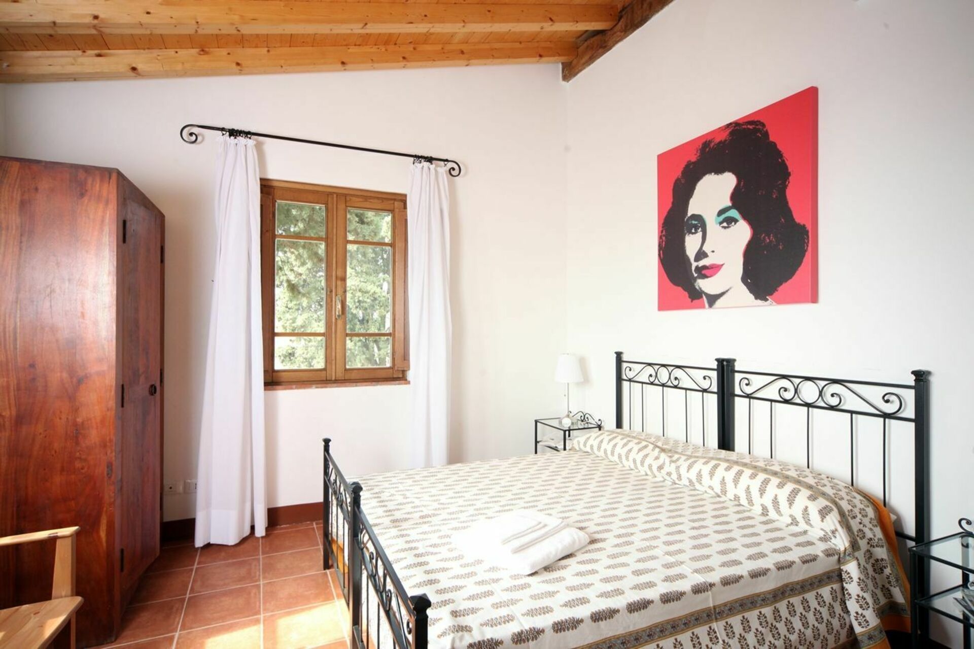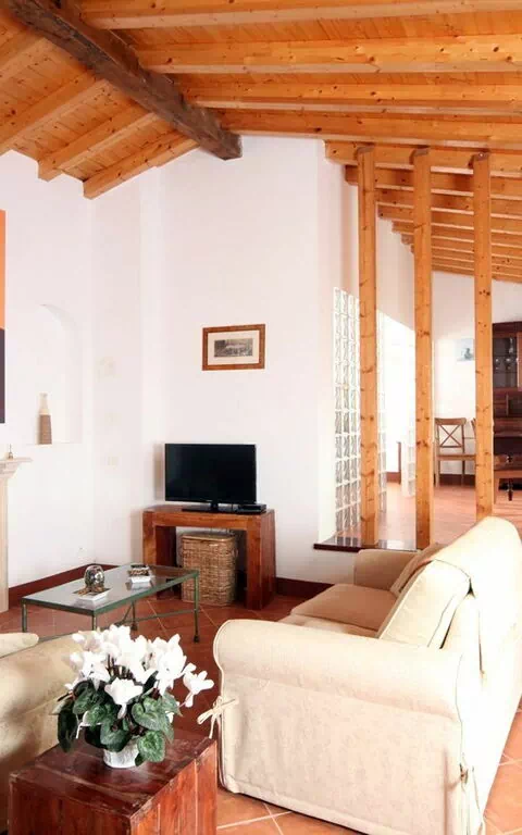De woonkamer is ingericht met een slaapbank voor twee personen, een open haard en tv. De inrichting is een mix van moderne en geërfde kenmerken die prachtig contrasteren met houten plafonds en terracotta vloeren.