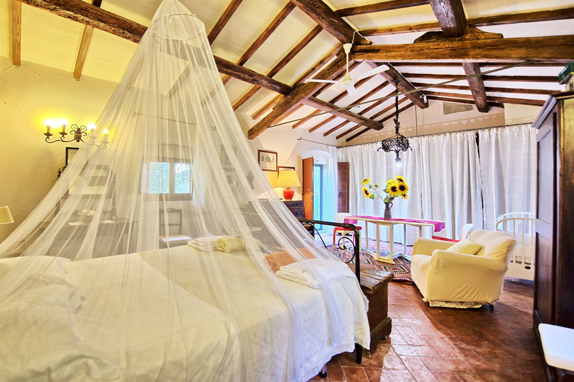 The furnishings are romantic and antique, if a little rickety. The two kitchens are equipped with all the necessary utensils for self-catering.