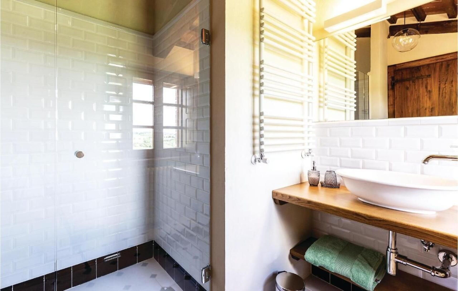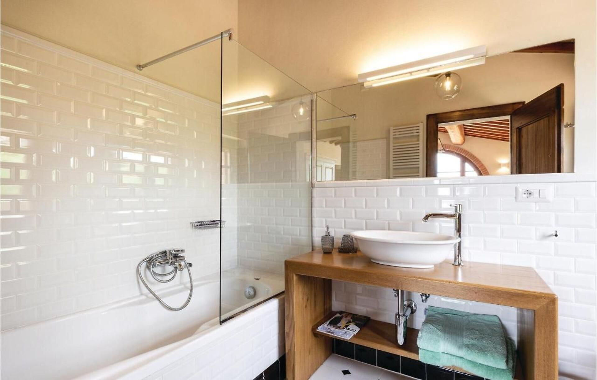 Ground floor: large open plan living area, partitioned into various areas by arches: living room with fireplace, dining room, kitchen (cook top, oven, refrigerator, freezer, dishwasher, microwave, toaster, espresso coffee maker, American coffee maker), wc, double bedroom (bed dimensions: 160 x 190 cm) with a private bathroom with shower, bedroom with double bed (bed dimensions: 160 x 190 cm) and a single sofa bed (suitable for children up to 12 years old), with a private bathroom with shower.