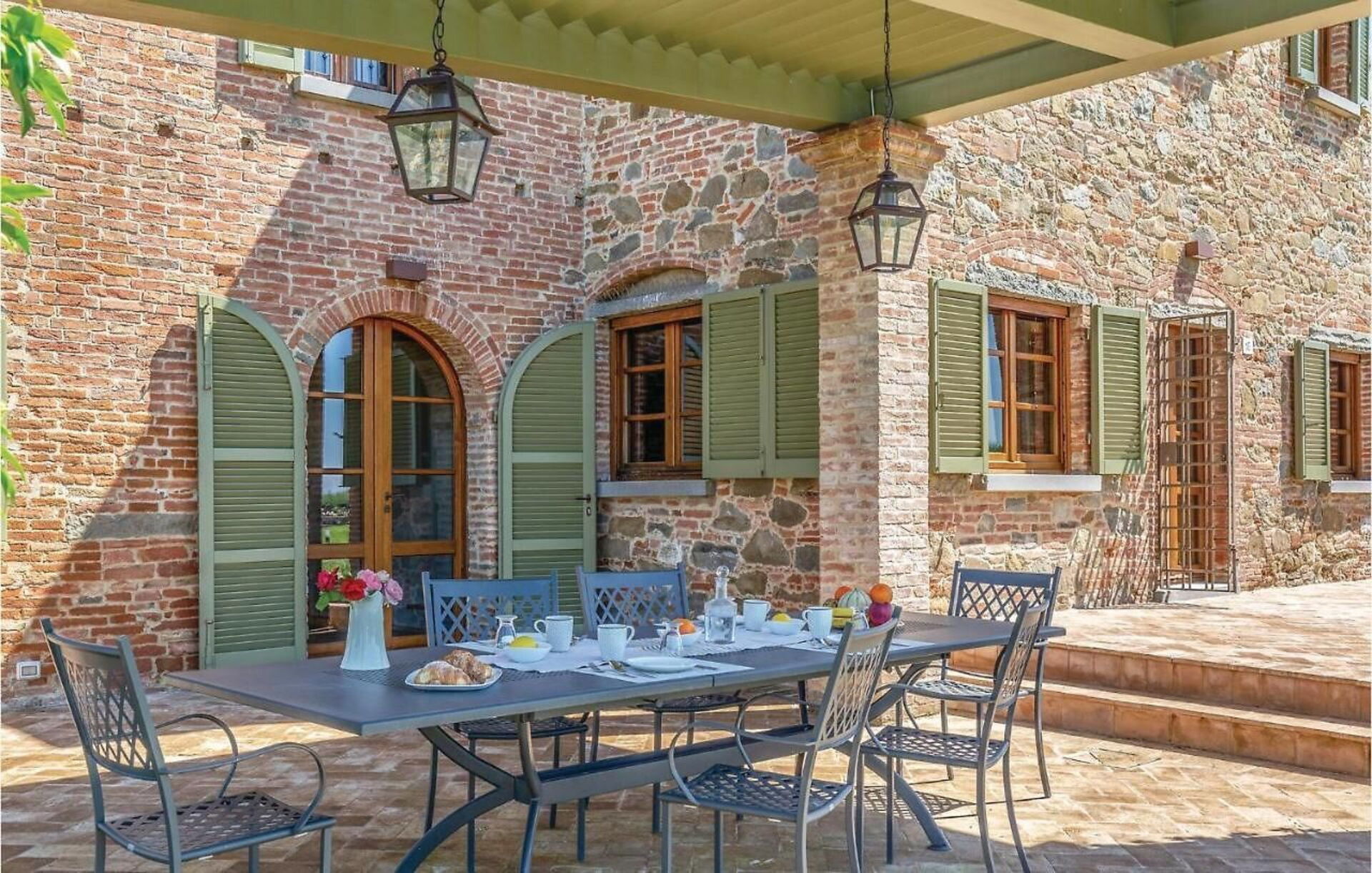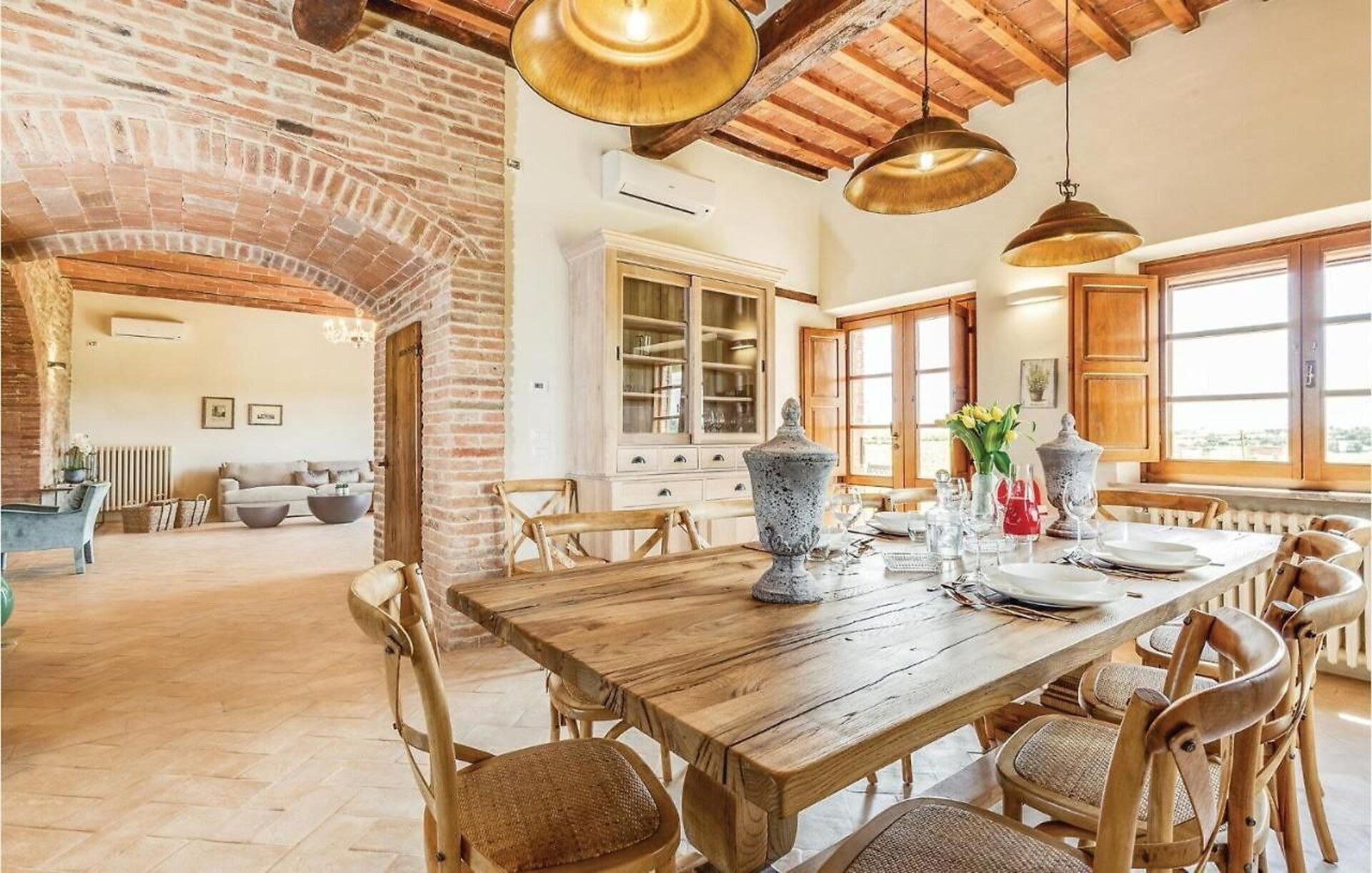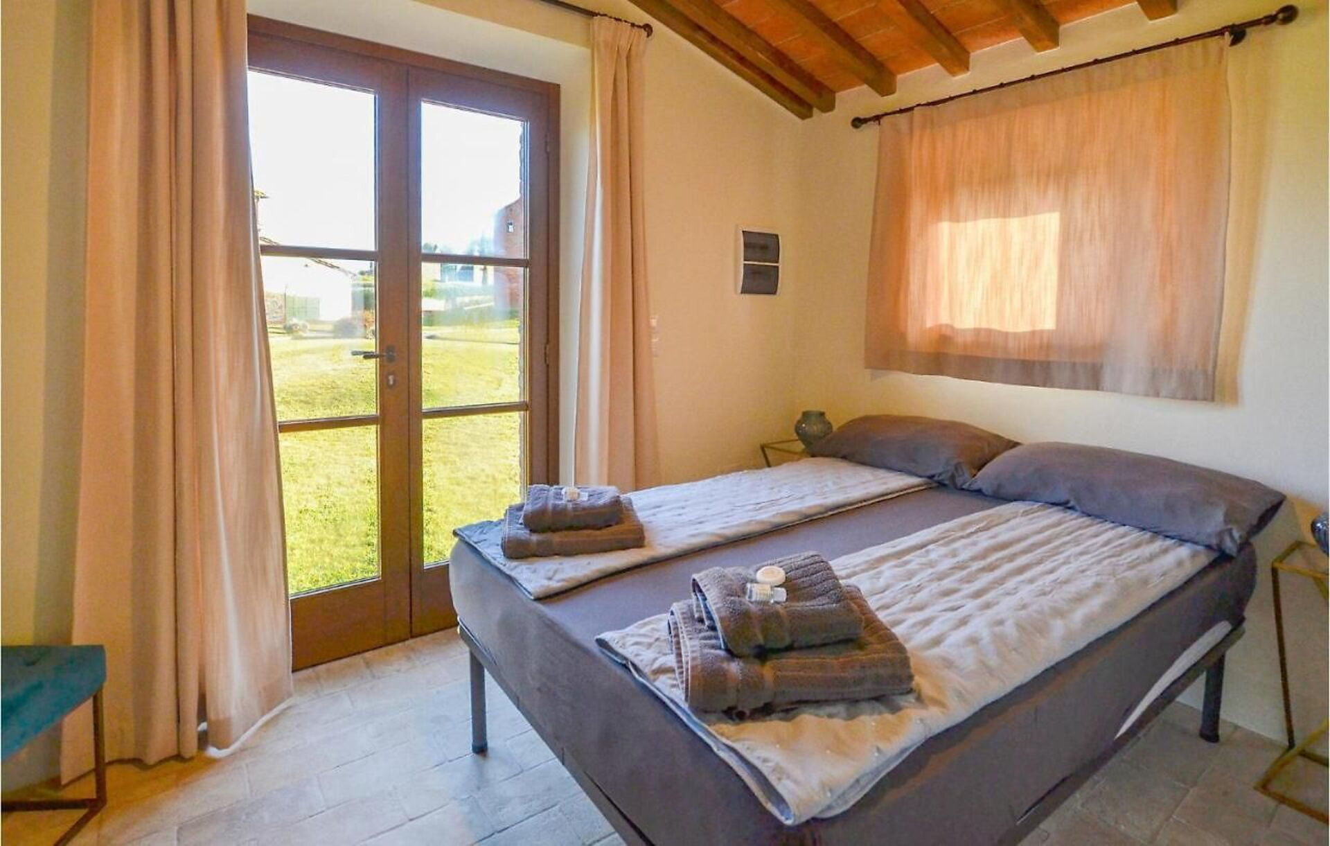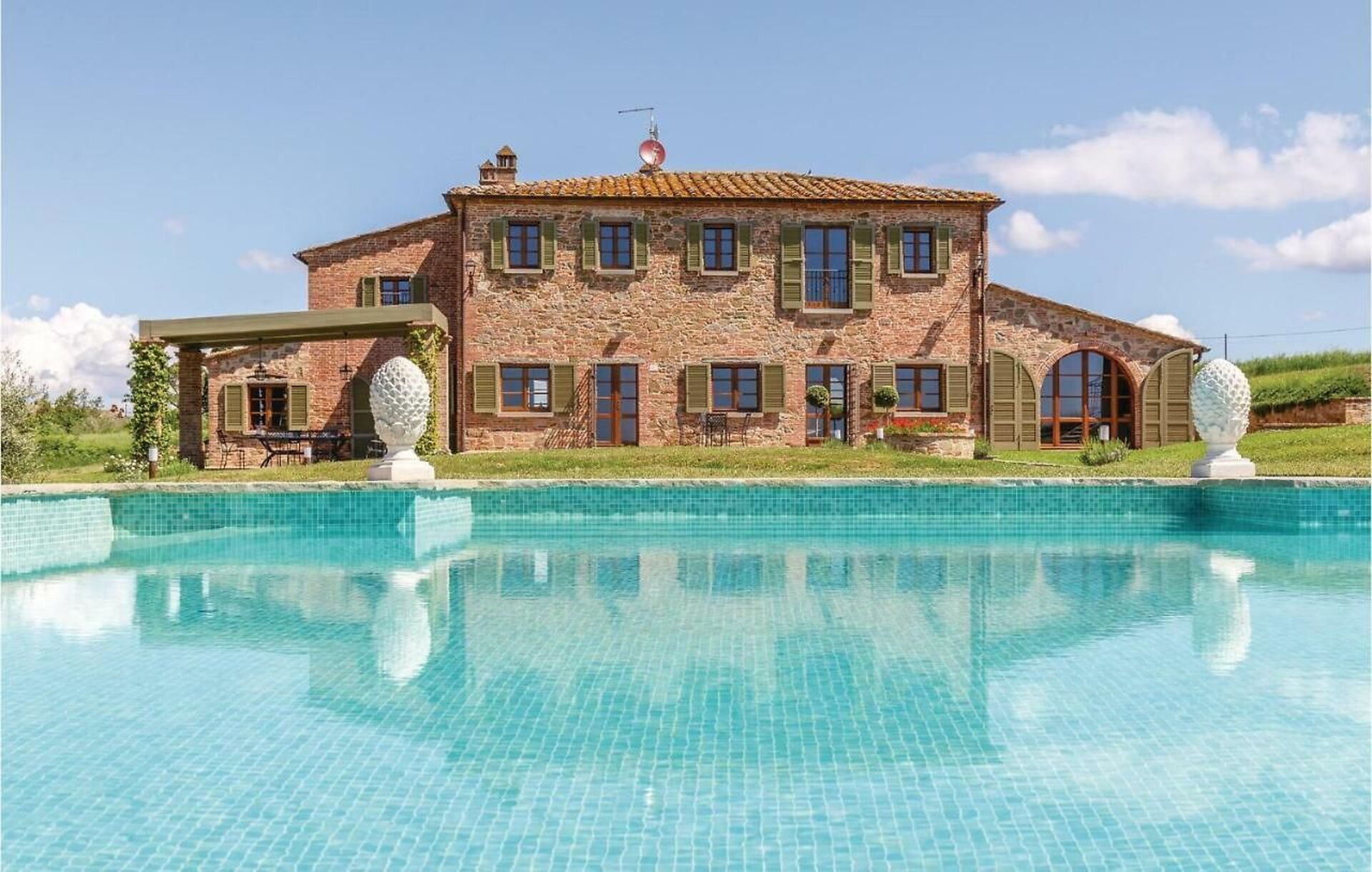 Outside on the grounds, there is a large, well tended garden with a stunning private pool and a sunbathing terrace with panoramic views: the perfect place to relax in the sun or cool off on sunny summer days, while enjoying the gorgeous Tuscan landscape. On the elegant terracotta terrace there is a lovely covered dining area with a table, chairs and barbecue for comfortable outdoor meals.