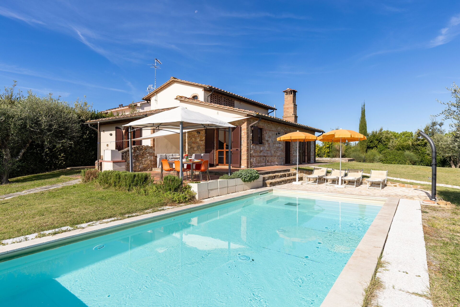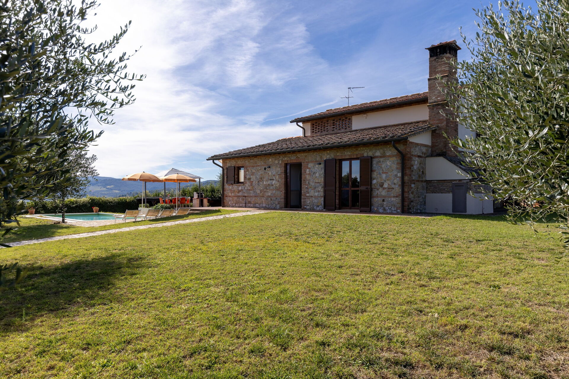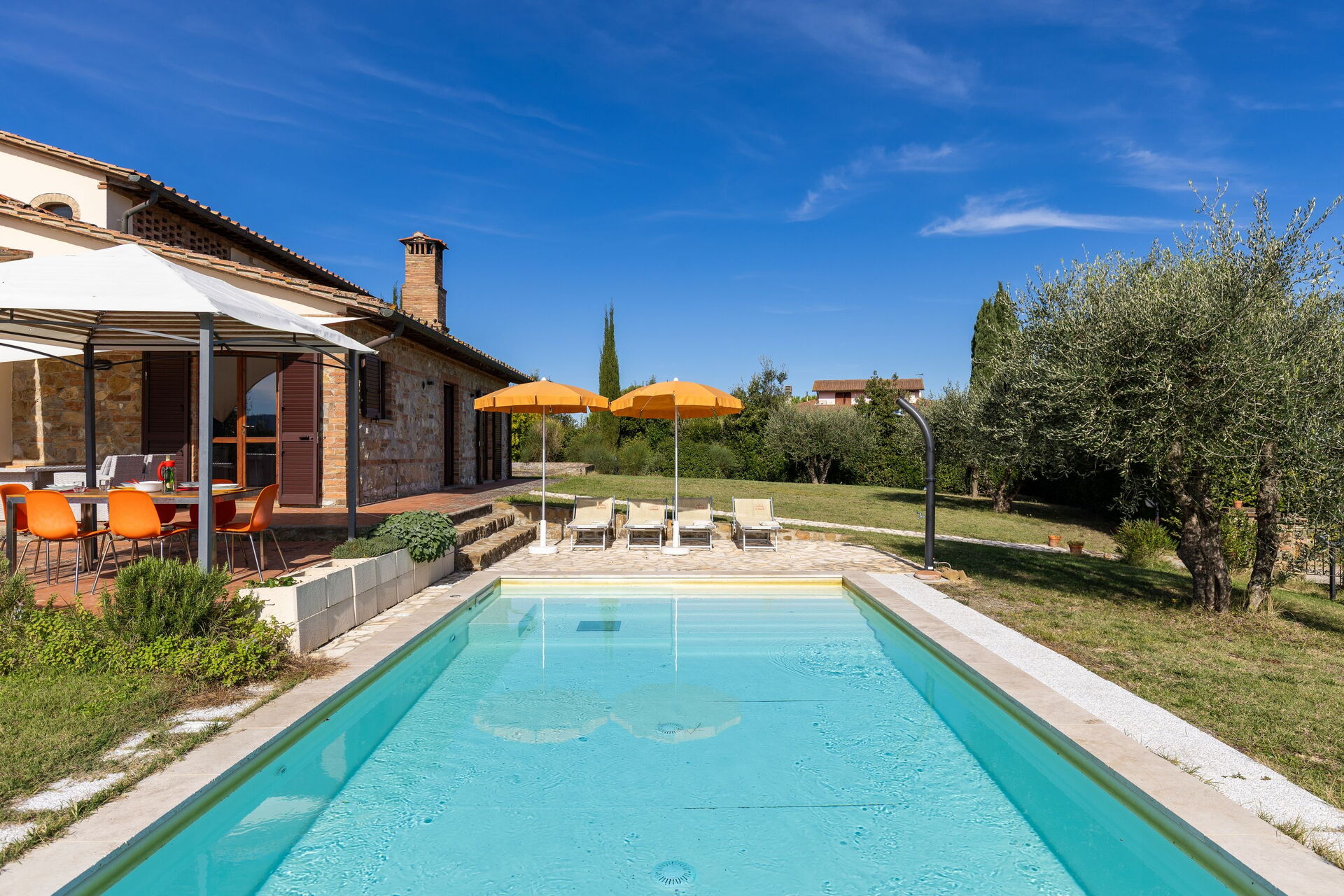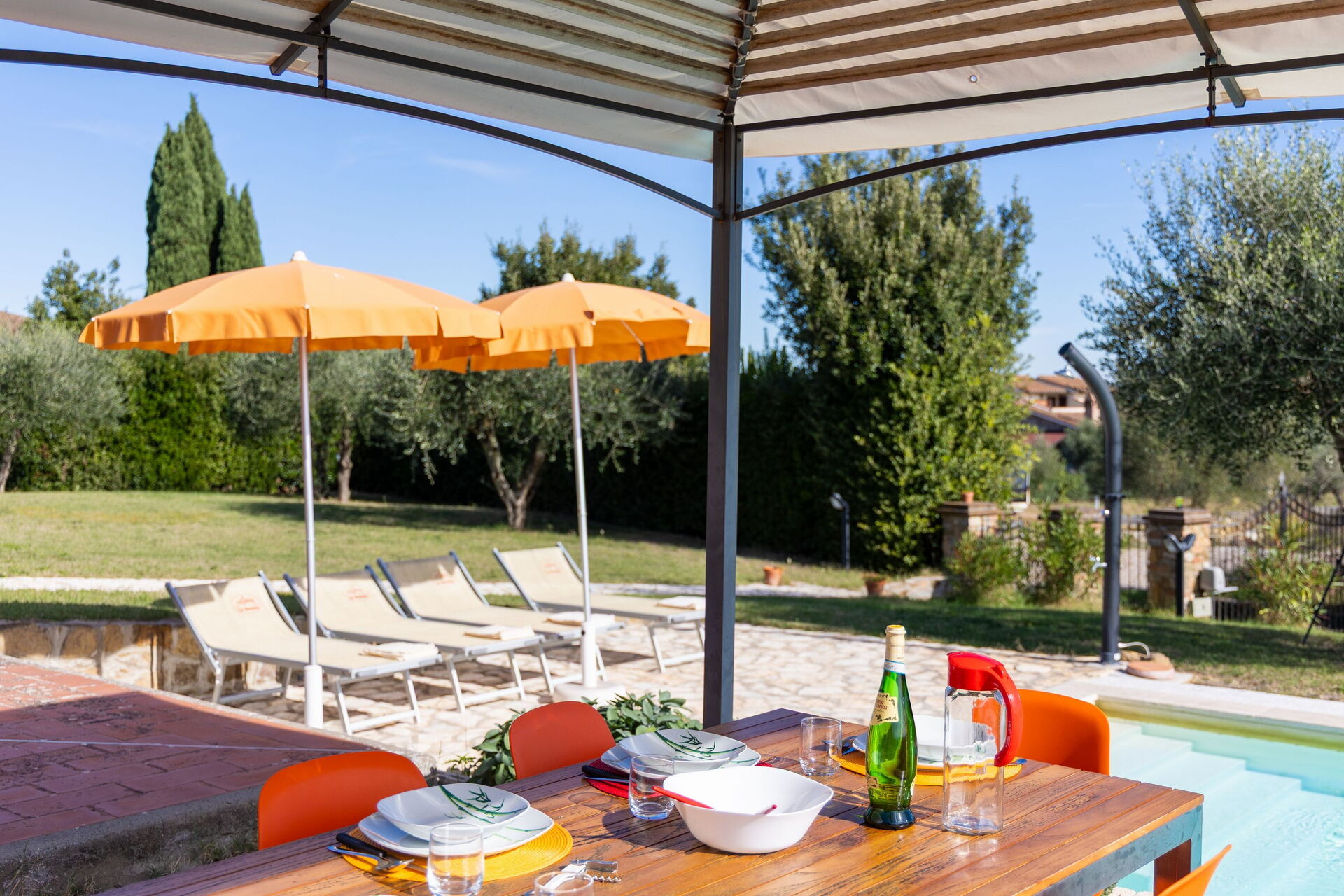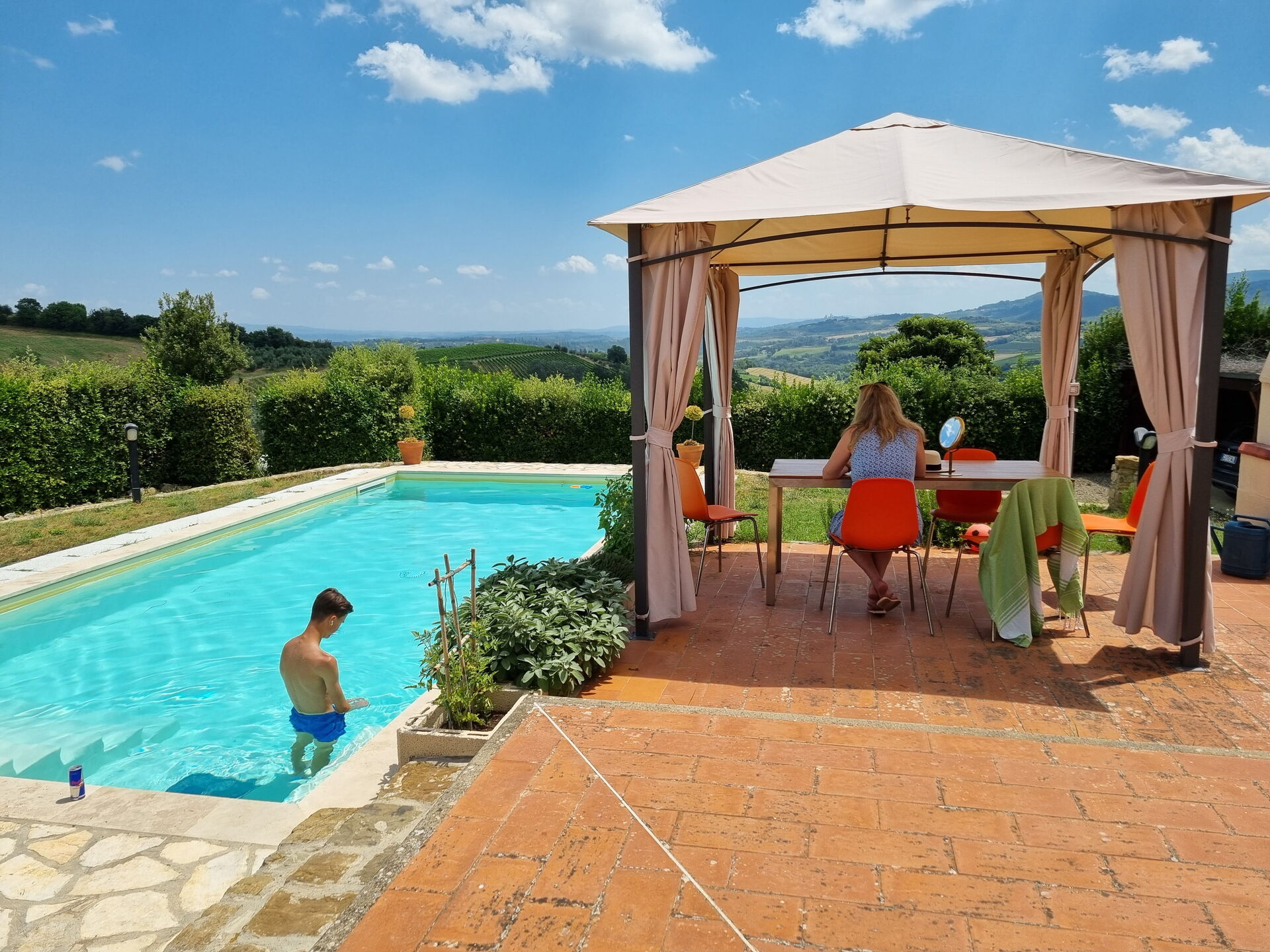 Buiten kunnen gasten genieten van een tuin en een gloednieuw zwembad (met Romeinse treden en een relaxdeel met geiser). Het kijkt uit over het landschap en de beroemde torens van San Gimignano. In de buurt van de keuken van de villa, tussen de villa en het zwembad is er een ruimte ingericht met een tuinhuisje, tafel, stoelen en barbecue.