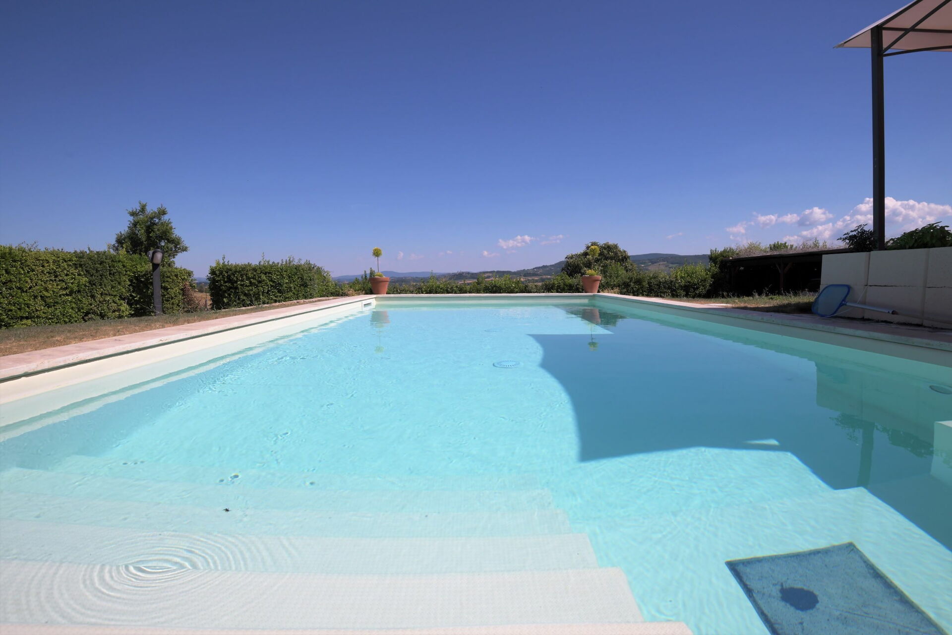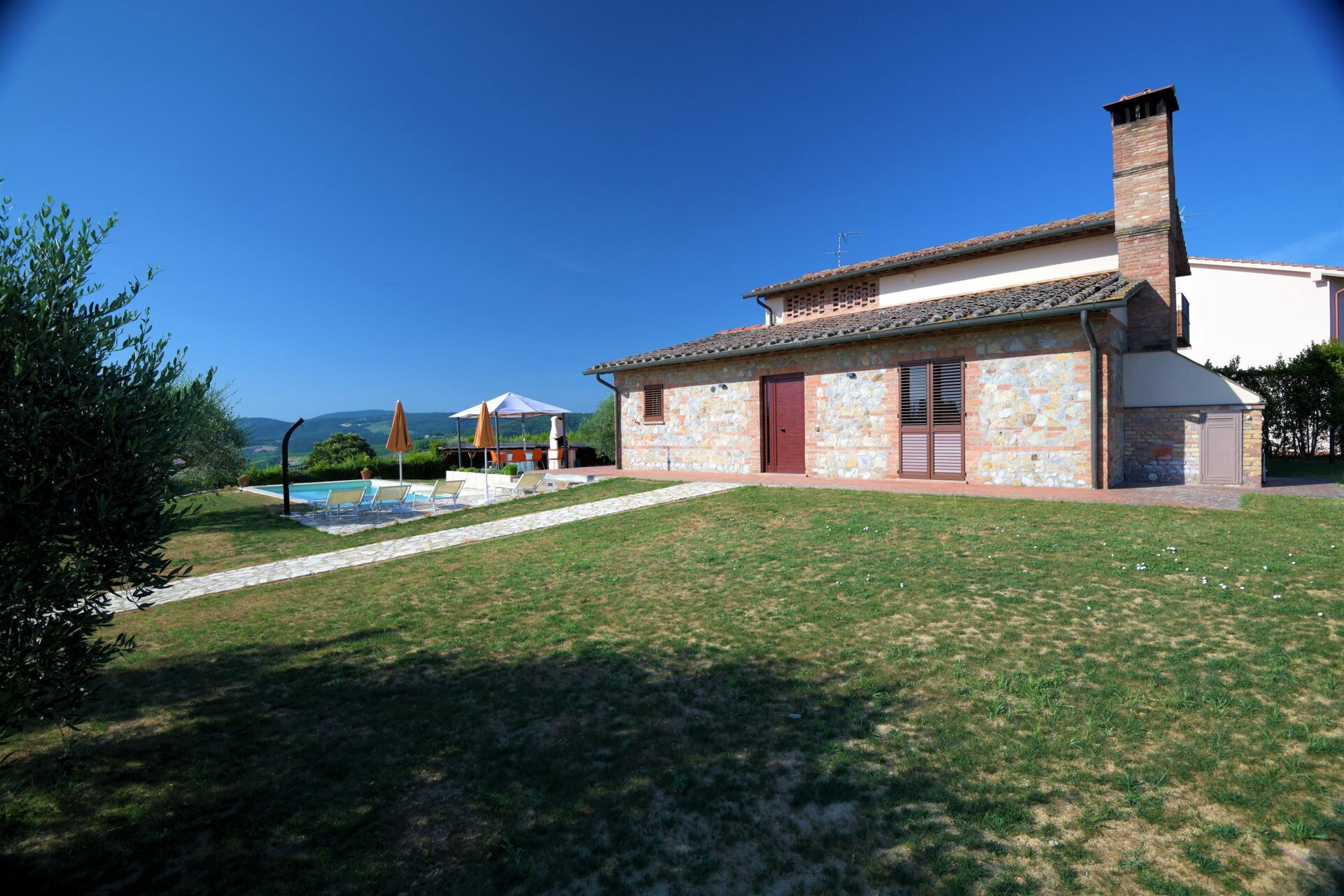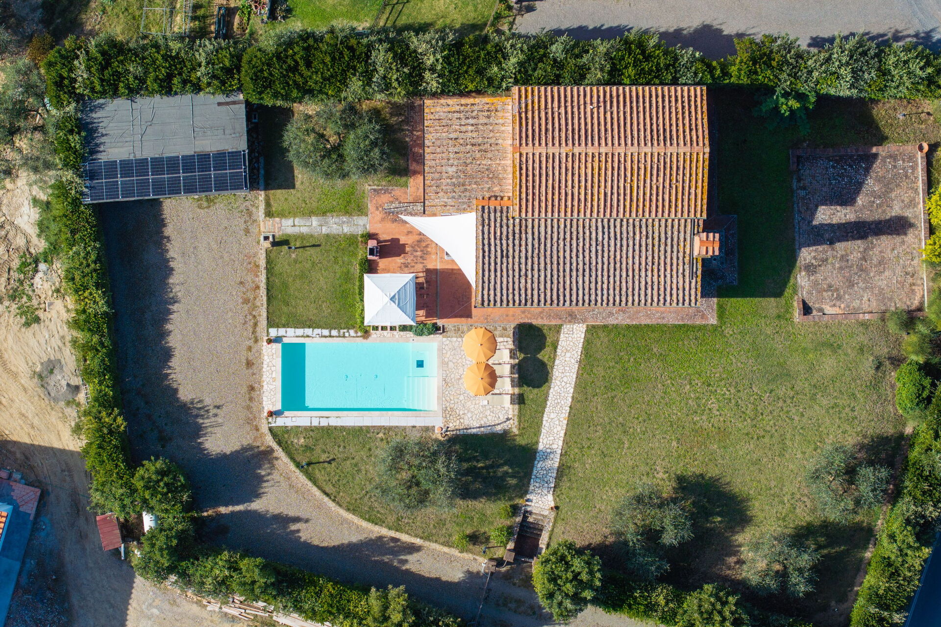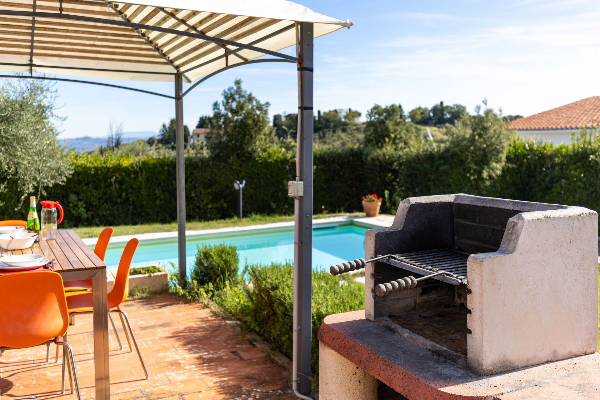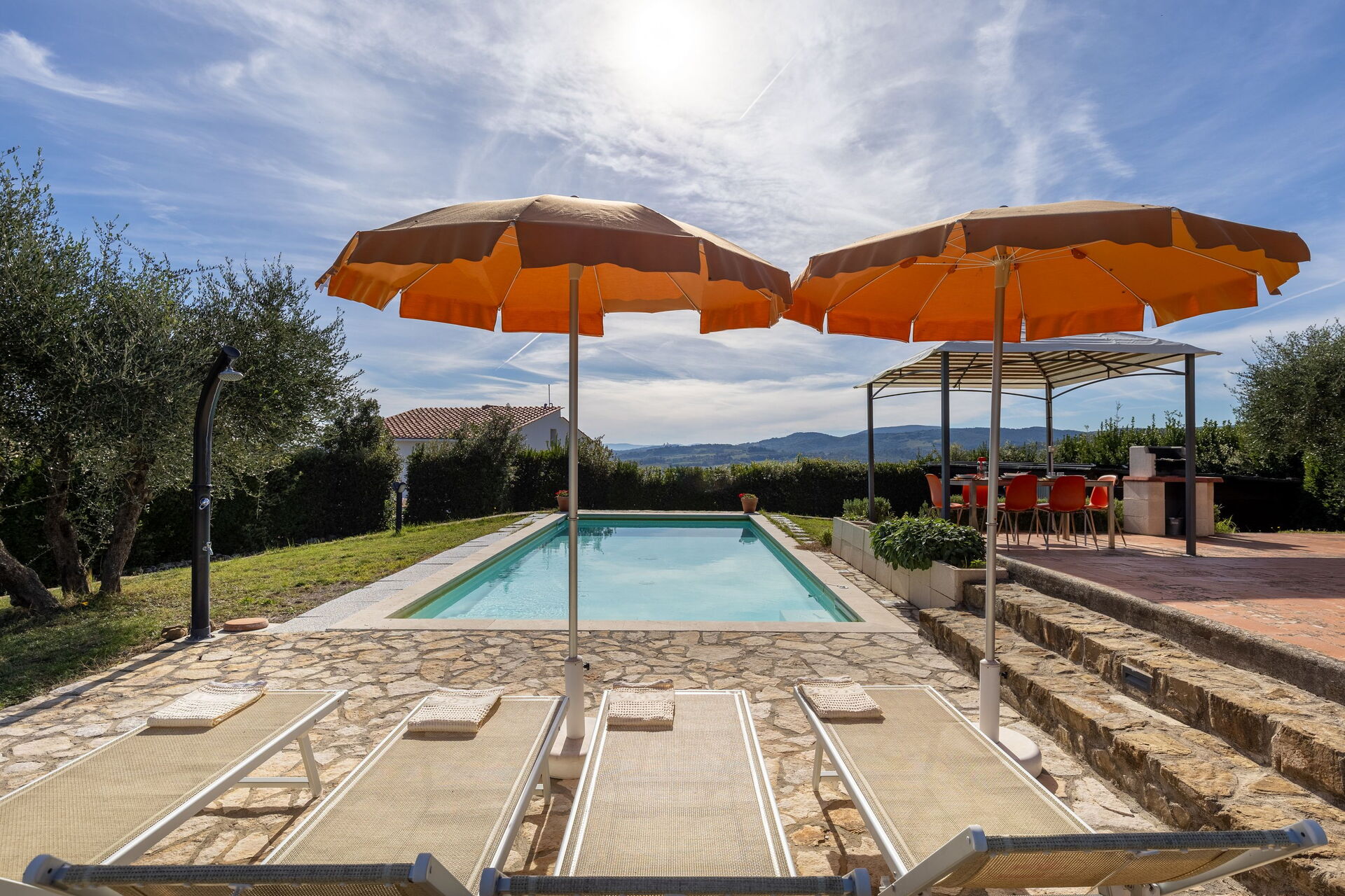 Buiten kunnen gasten genieten van een tuin en een gloednieuw zwembad (met Romeinse treden en een relaxdeel met geiser). Het kijkt uit over het landschap en de beroemde torens van San Gimignano. In de buurt van de keuken van de villa, tussen de villa en het zwembad is er een ruimte ingericht met een tuinhuisje, tafel, stoelen en barbecue.