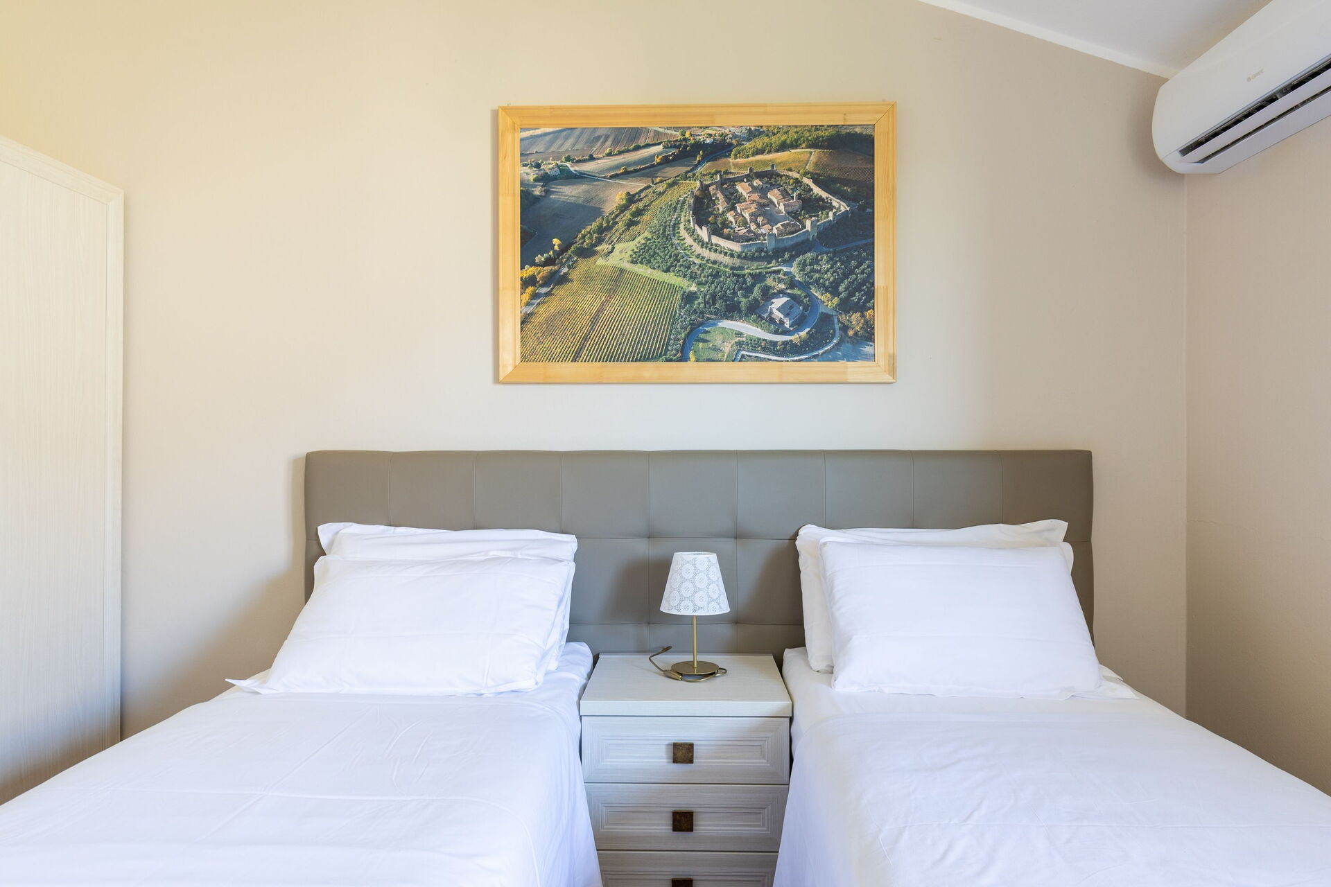 Eerste verdieping: slaapkamer met tweepersoonsbed (airconditioning); slaapkamer met 2 eenpersoonsbedden (airconditioning, bedden kunnen op aanvraag worden samengevoegd); badkamer met douche.