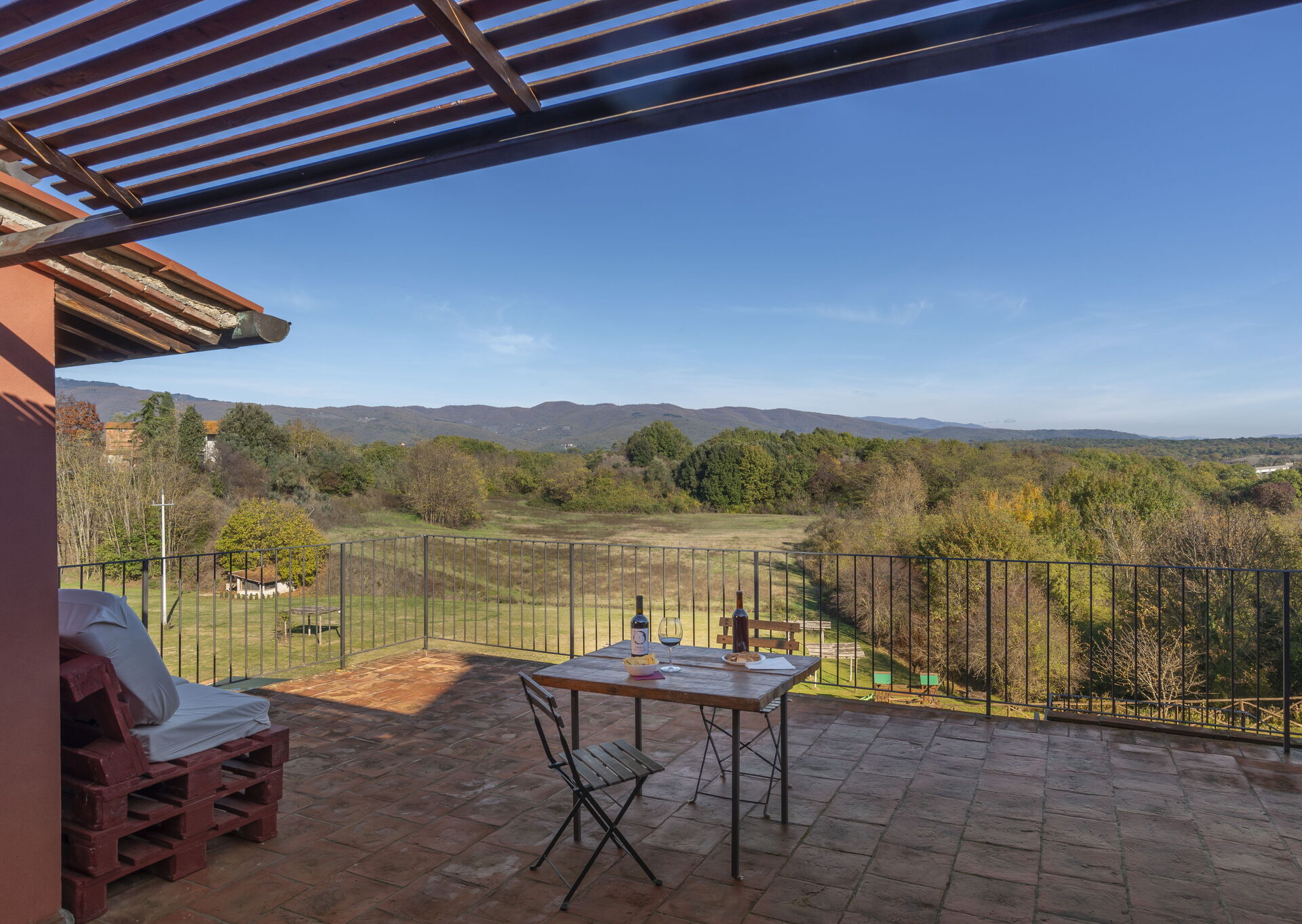 Terras ingericht met tafel en stoelen.