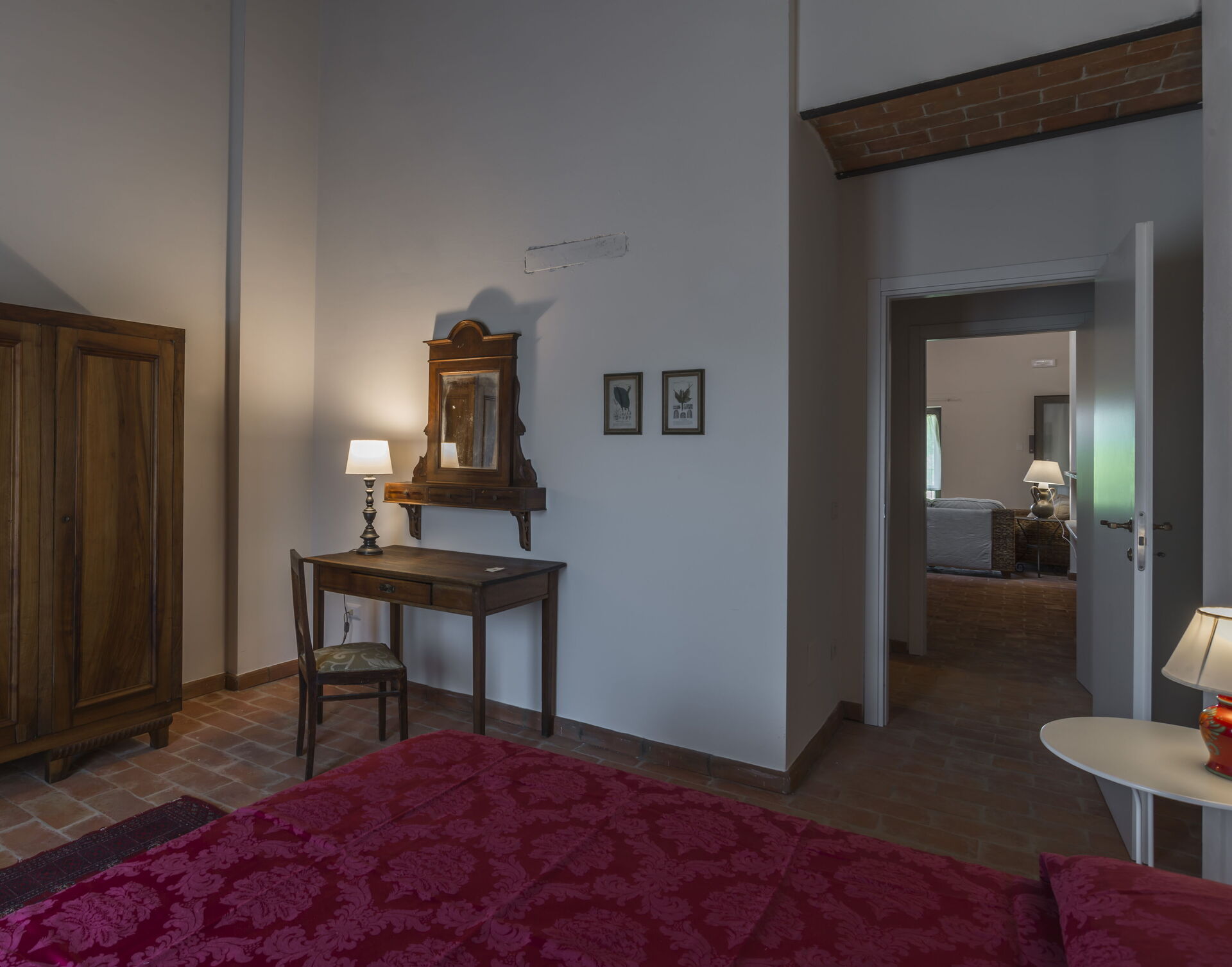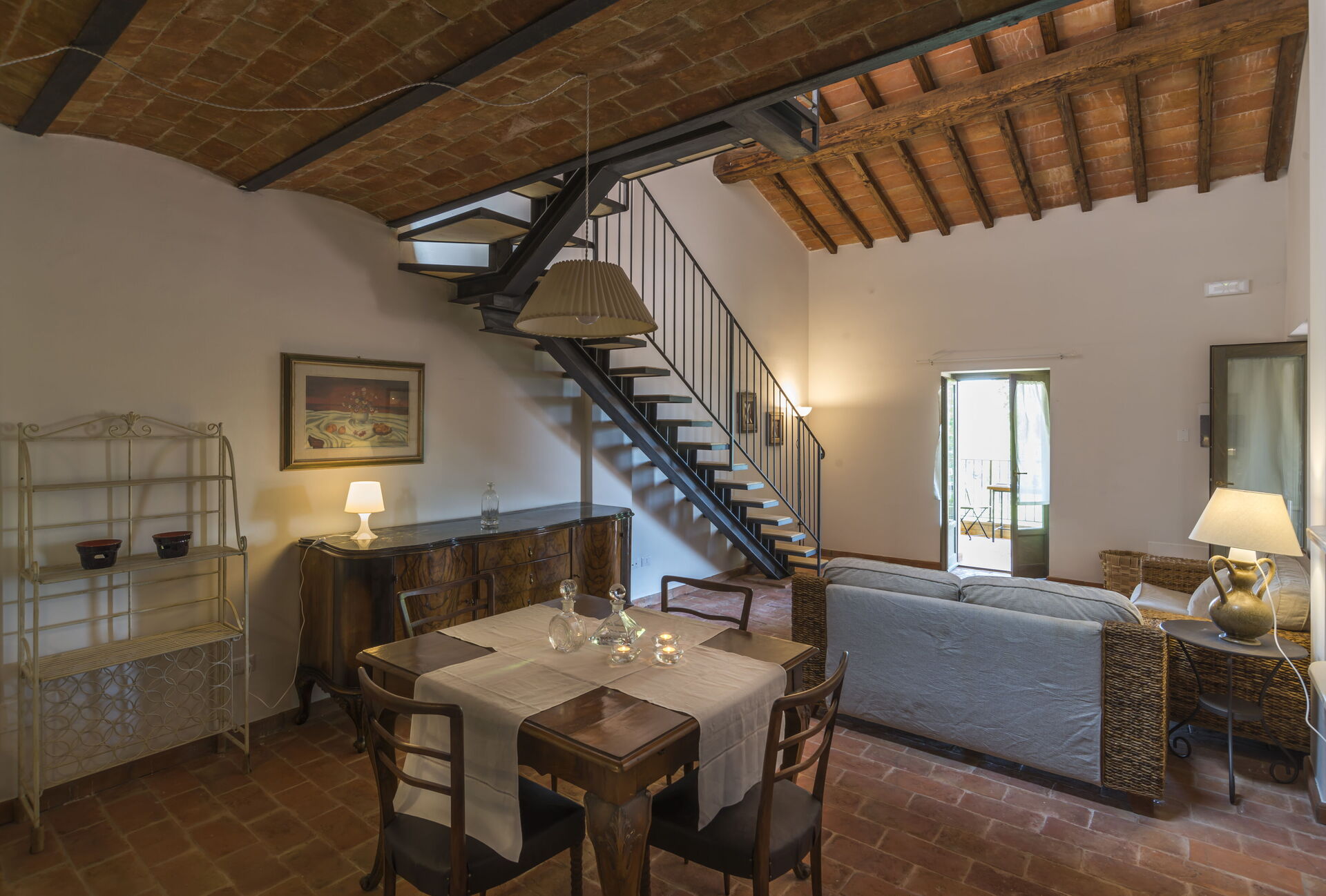 Eerste verdieping: ruime woonkamer met een woonkamer (met een extra slaapbank voor twee personen op aanvraag), en toegang tot een vide met een slaapkamer met 4 eenpersoonsbedden en een badkamer met douche; eethoek met keuken (vaatwasser, oven, koelkast, inductiekookplaat, magnetron, koffiezetapparaat, ventilator), slaapkamer met tweepersoonsbed, badkamer met douche.
