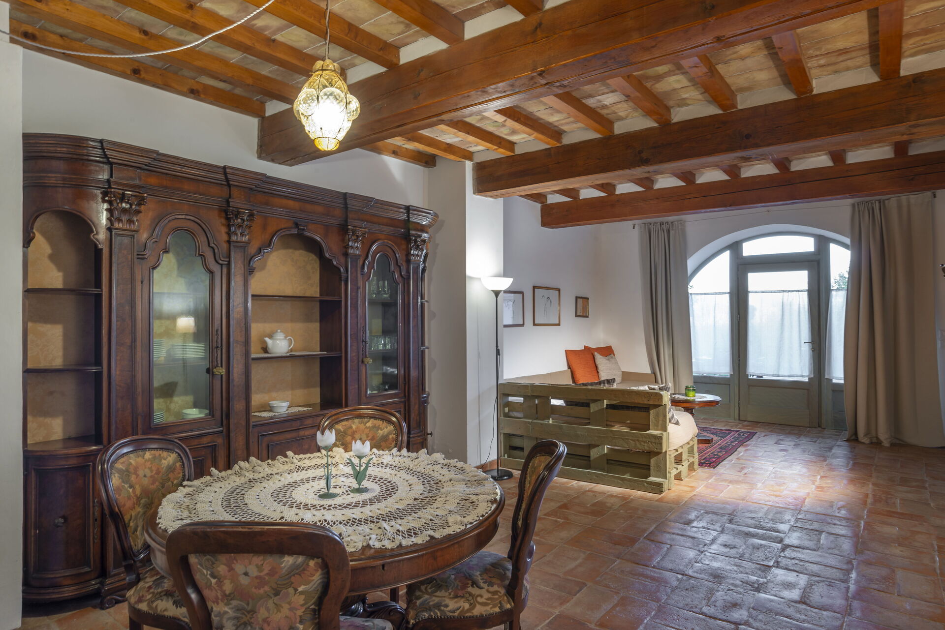 Begane grond: woongedeelte met woonkamer (met 2 extra eenpersoonsslaapbanken op aanvraag beschikbaar) en eetgedeelte met keuken (vaatwasser, oven, koelkast, inductiekookplaat, magnetron, koffiezetapparaat, ventilator), slaapkamer met tweepersoonsbed, badkamer met douche.