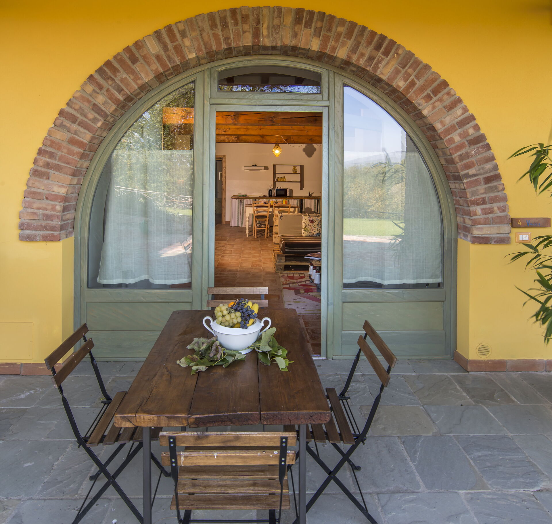 Privé, gemeubileerde buitenruimte met tafel en stoelen.