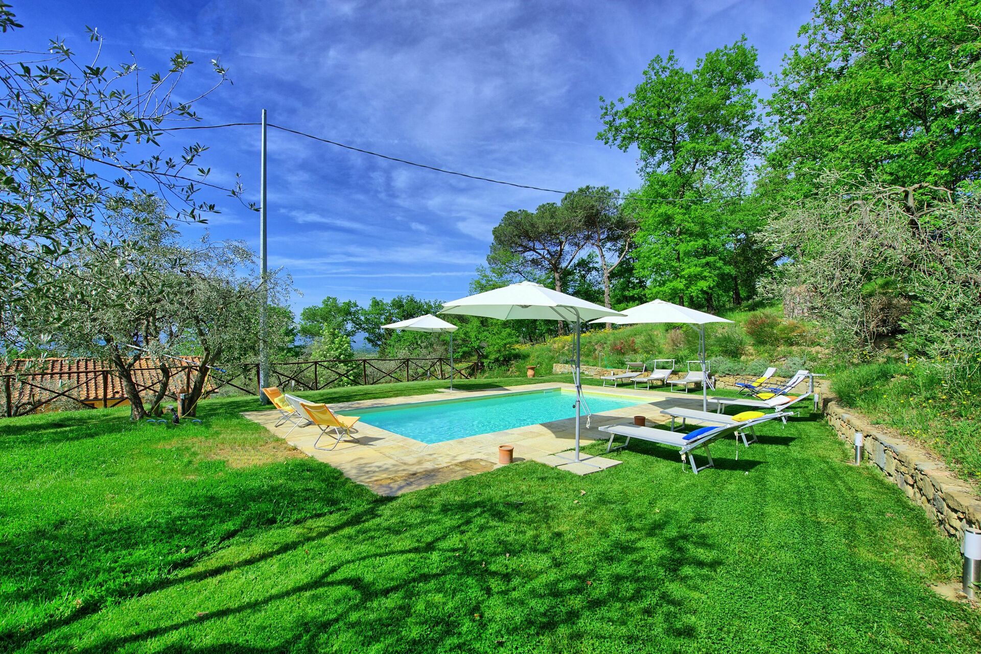 Great house with sleeping rooms with fans, enough bathrooms. Perfect for 3 families with different areas. Big garden, nice patio and good swimmingpool. Pool was very cold, which was a good thing and was cleaned every night. Sometimes the dogs from the owner were barking at night, but they got used to us. Very nice owner, speaks only italian.
