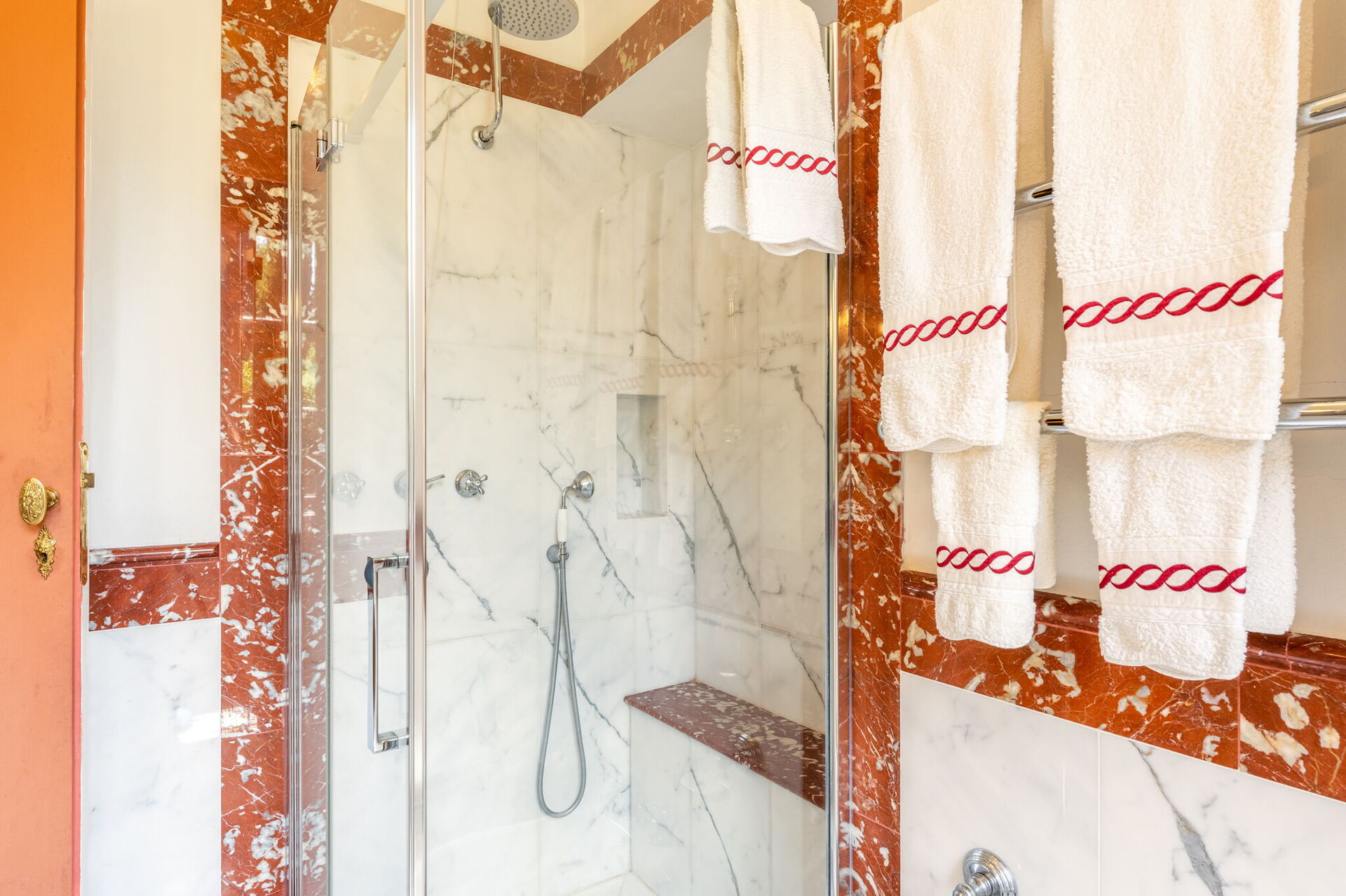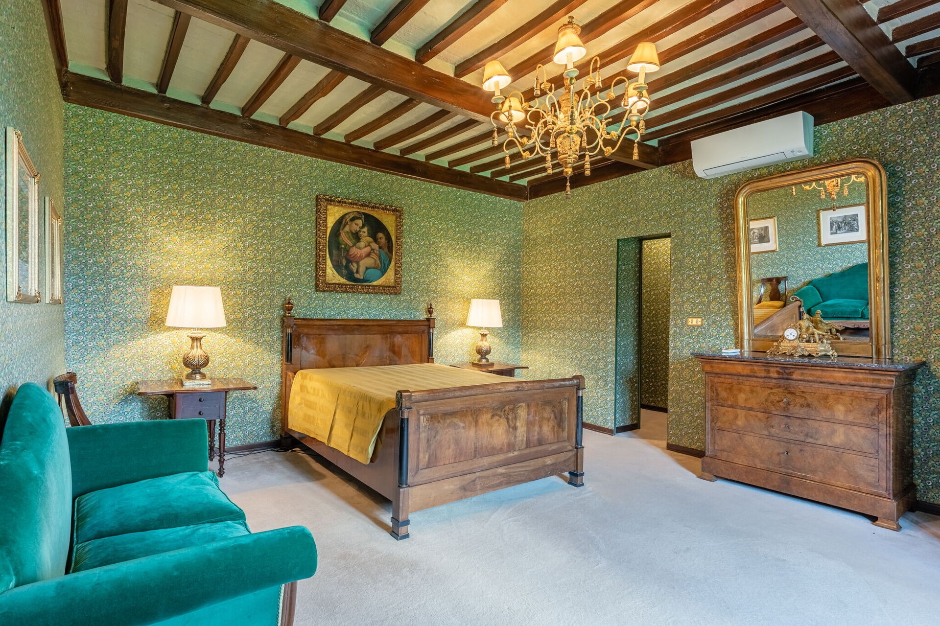 Boven is er een slaapkamer met twee aparte bedden (de bedden kunnen niet als één groot bed worden opgemaakt vanwege de antieke frames) met een eigen badkamer. Verderop in een gang is er een kleine slaapkamer met tweepersoonsbed en een eigen badkamer die uiteindelijk gedeeld word met een kleine kleedkamer die ermee verbonden is en die op verzoek en tegen betaling ter plekke kan worden veranderd in een eenpersoonsslaapkamer .