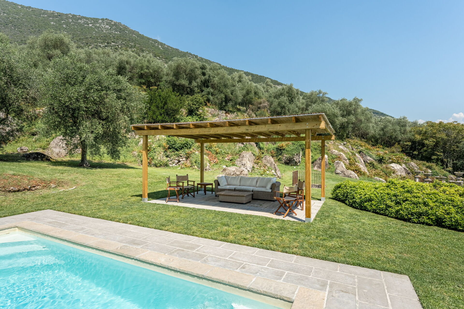 Een droomzwembad wordt omringd door een sensationeel groen decor van heuvels, bergen en uitgestrekte privétuinen die zorgvuldig worden onderhouden en omringd met olijfbomen.