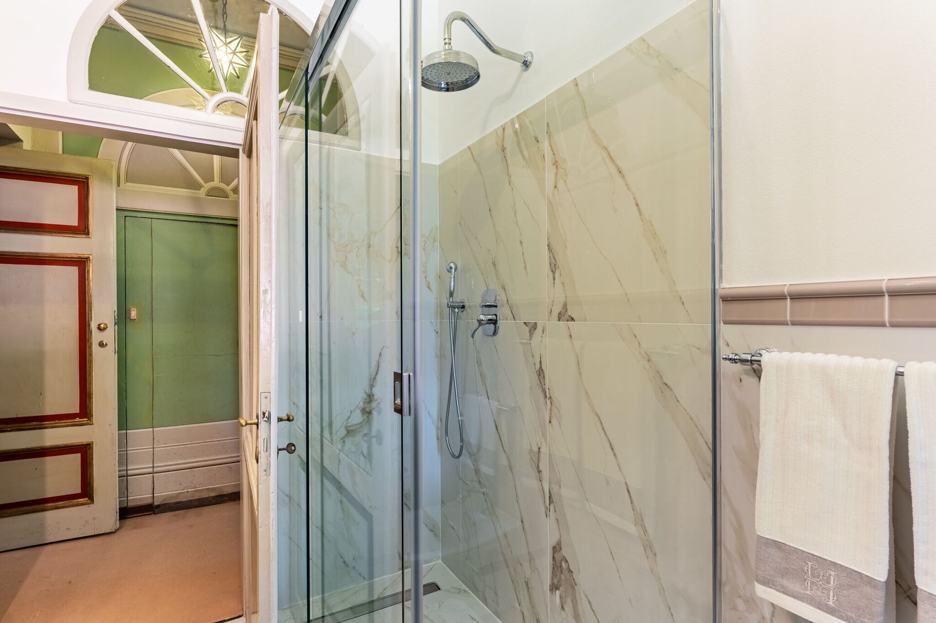 De zeer elegante ontvangsthal is verbonden met twee grote en gezellige woonkamers die karakter en charme uitstralen. Achter een van deze woonkamers bevindt zich een luxe eetkamer met een tafel voor 10/12 personen. De eerste twee slaapkamers en twee badkamers bevinden zich op deze verdieping van het huis.