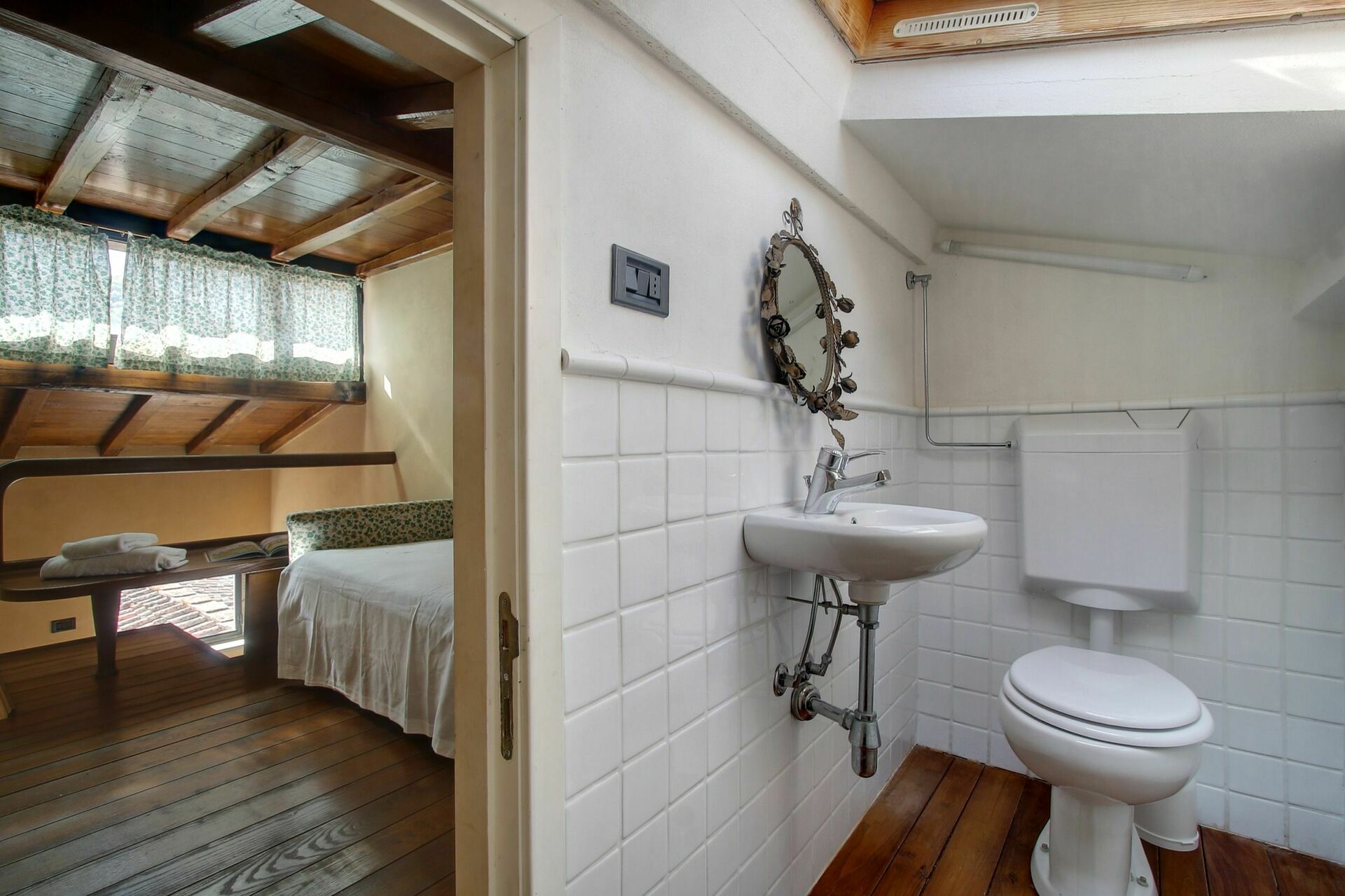 Zolder: kleine slaapkamer met een eenpersoonsbed en kleine WC met wastafel.