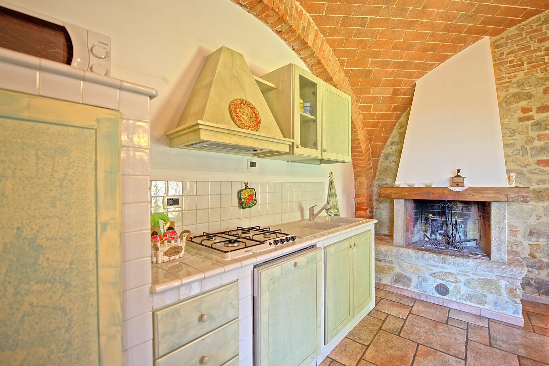 Begane grond: ingang naar de woonkamer (TV) met open haard, eethoek en keukenhoek (vaatwasser, vriezer, magnetron), slaapkamer met tweepersoonsbed, badkamer met douche, slaapkamer met een eenpersoonsbed, badkamer met douche (geen bidet).