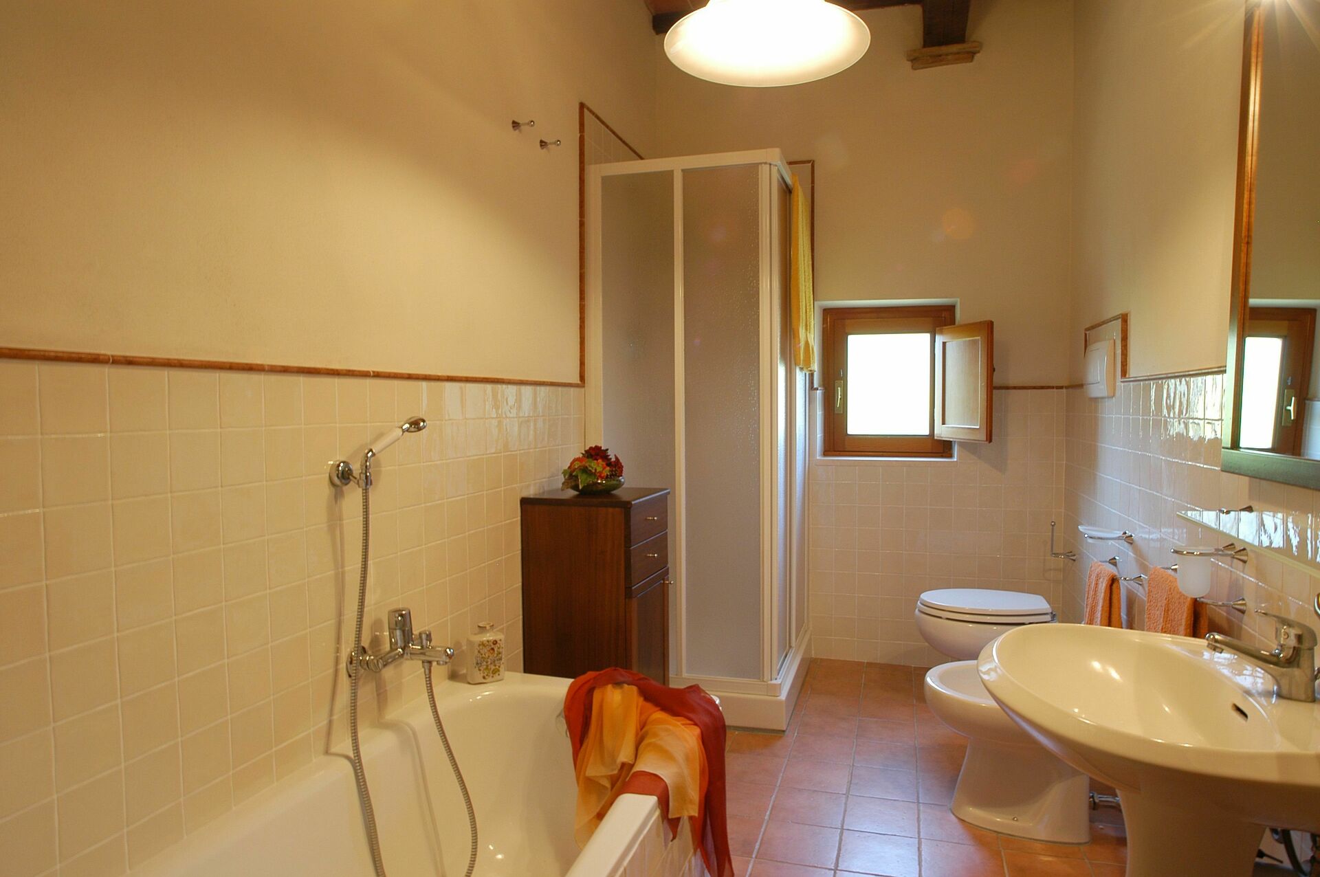 Eerste verdieping: slaapkamer met tweepersoonsbed met eigen badkamer (ligbad en douche).