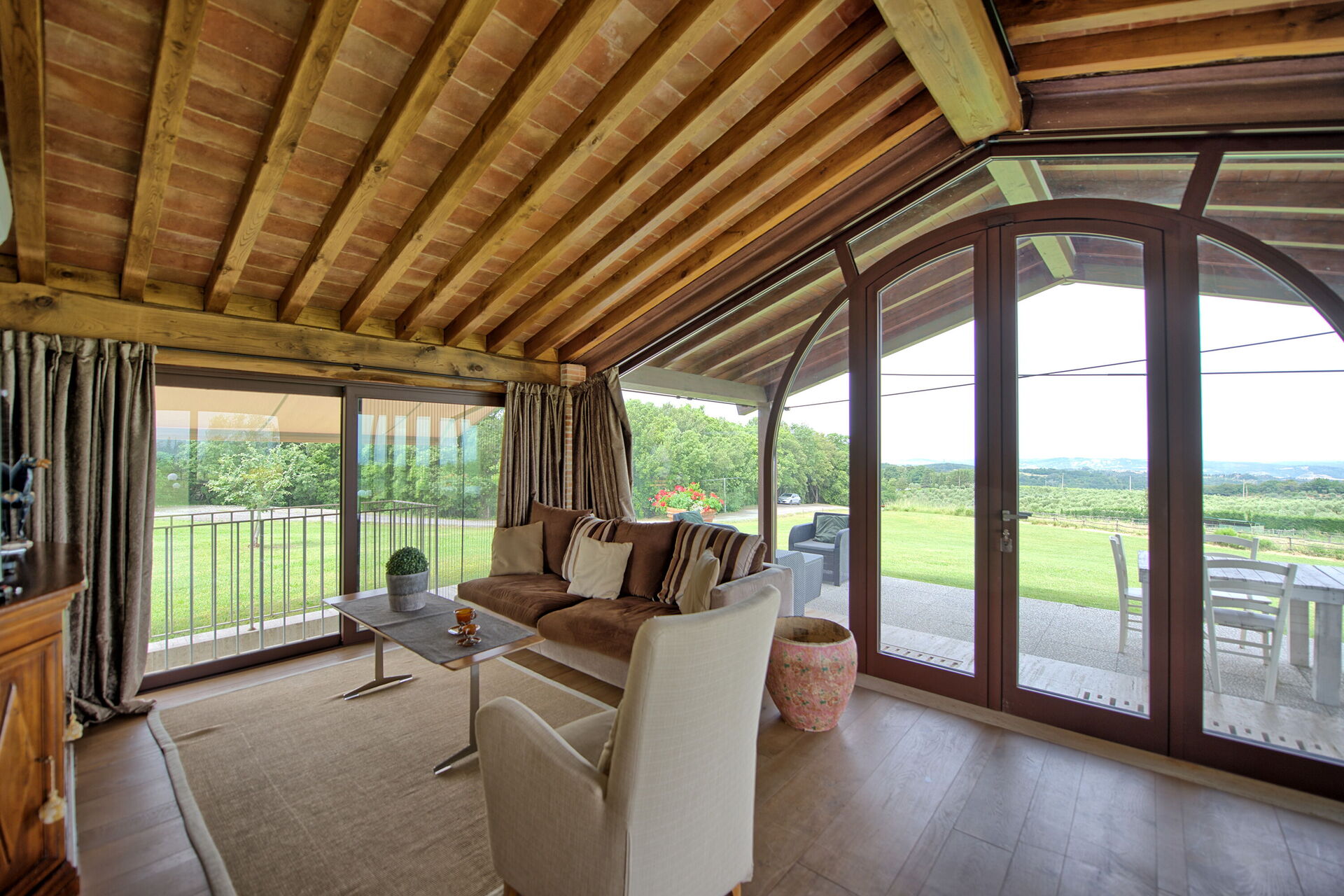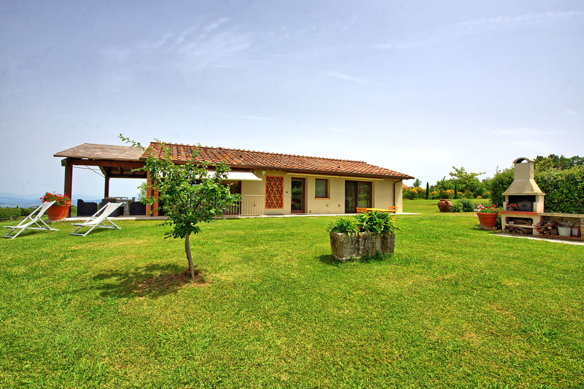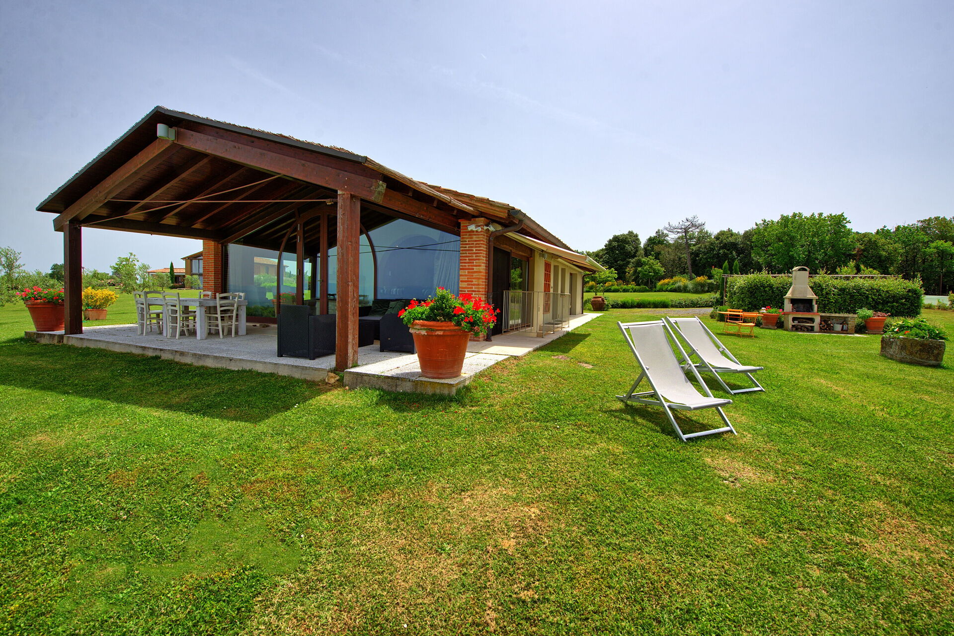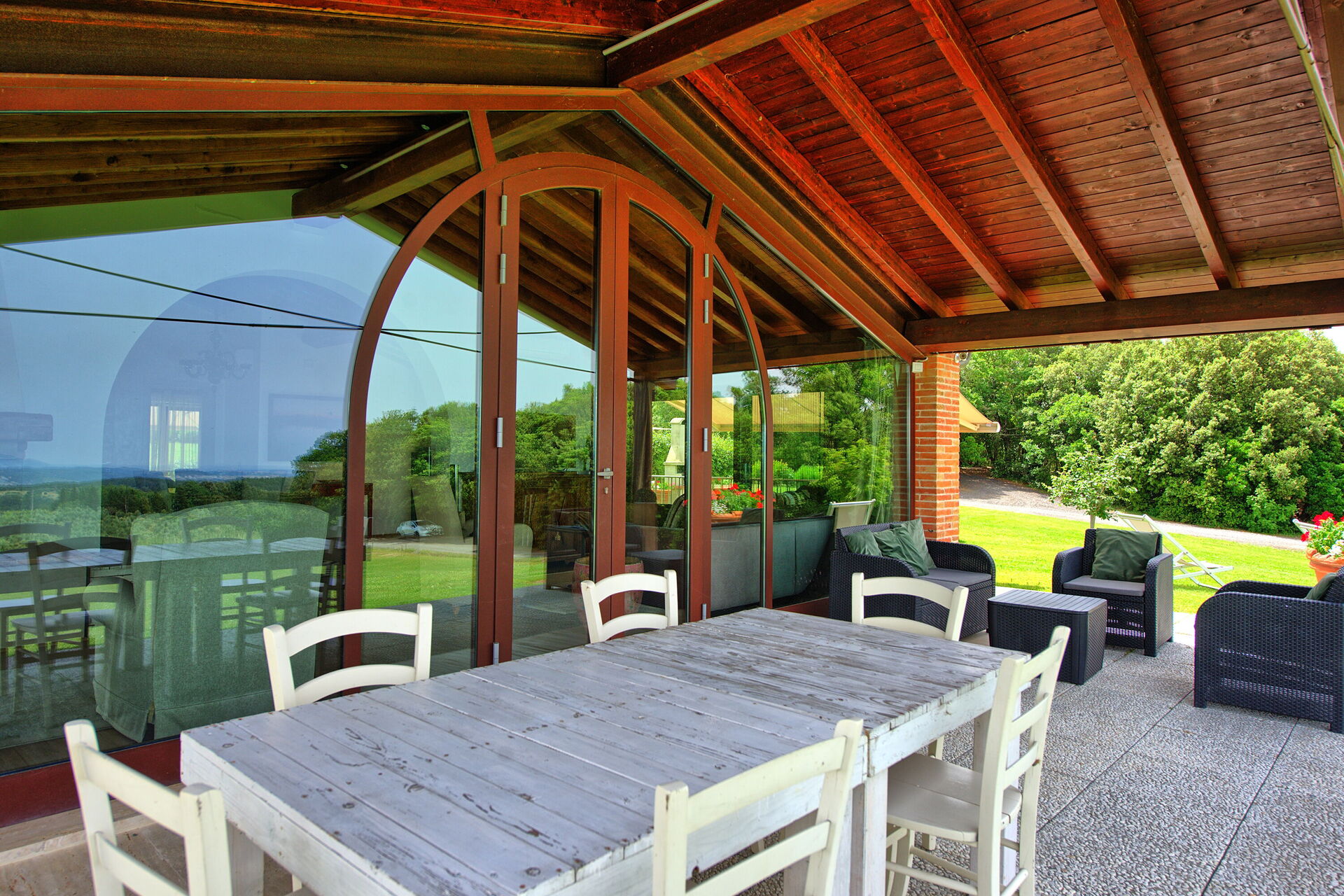 Vanuit de woonkamer is er toegang tot een panoramische veranda ingericht met tafel en stoelen om buiten te eten; barbecue en grote tuin.