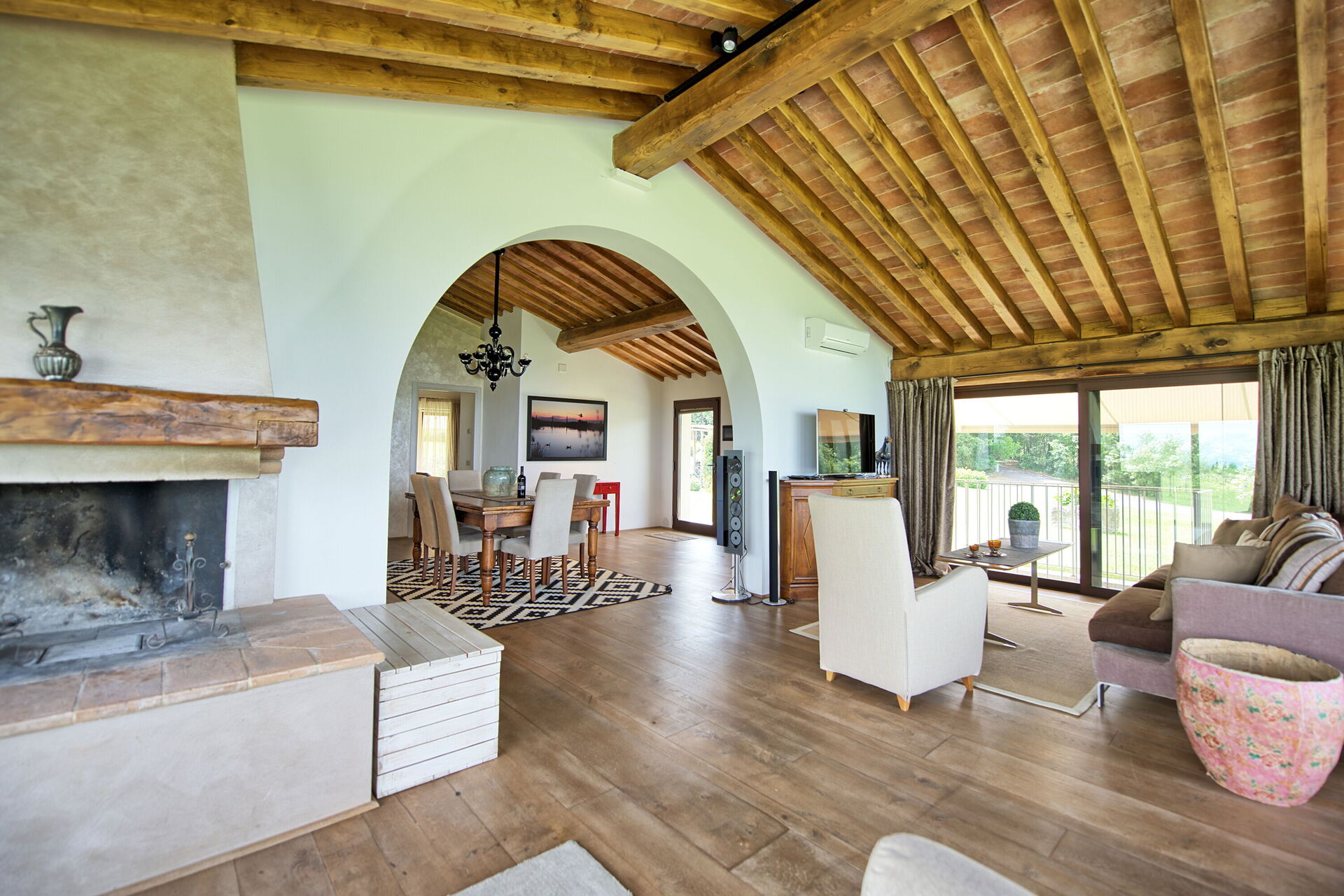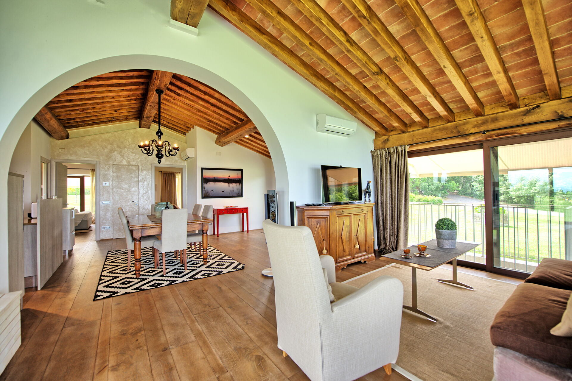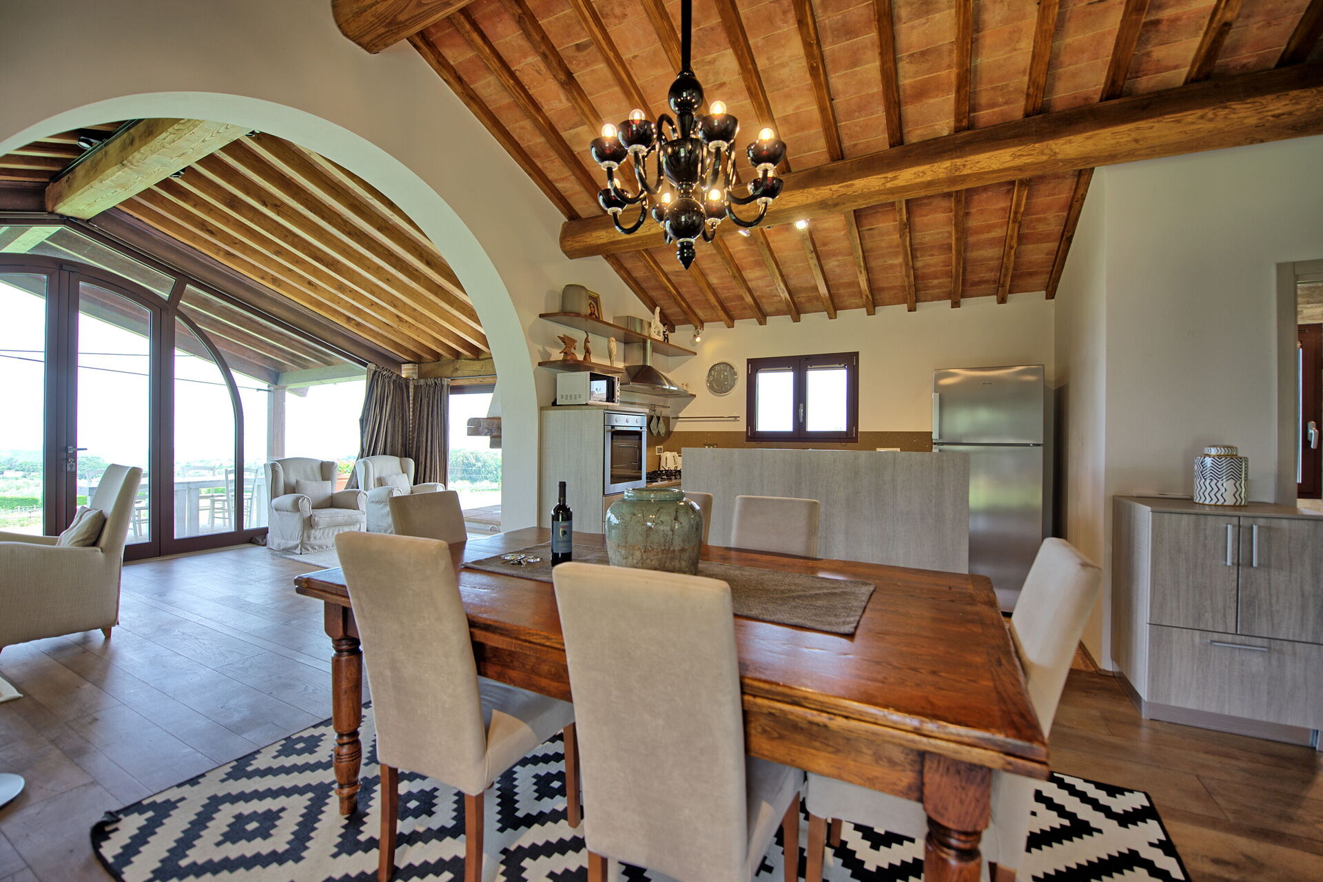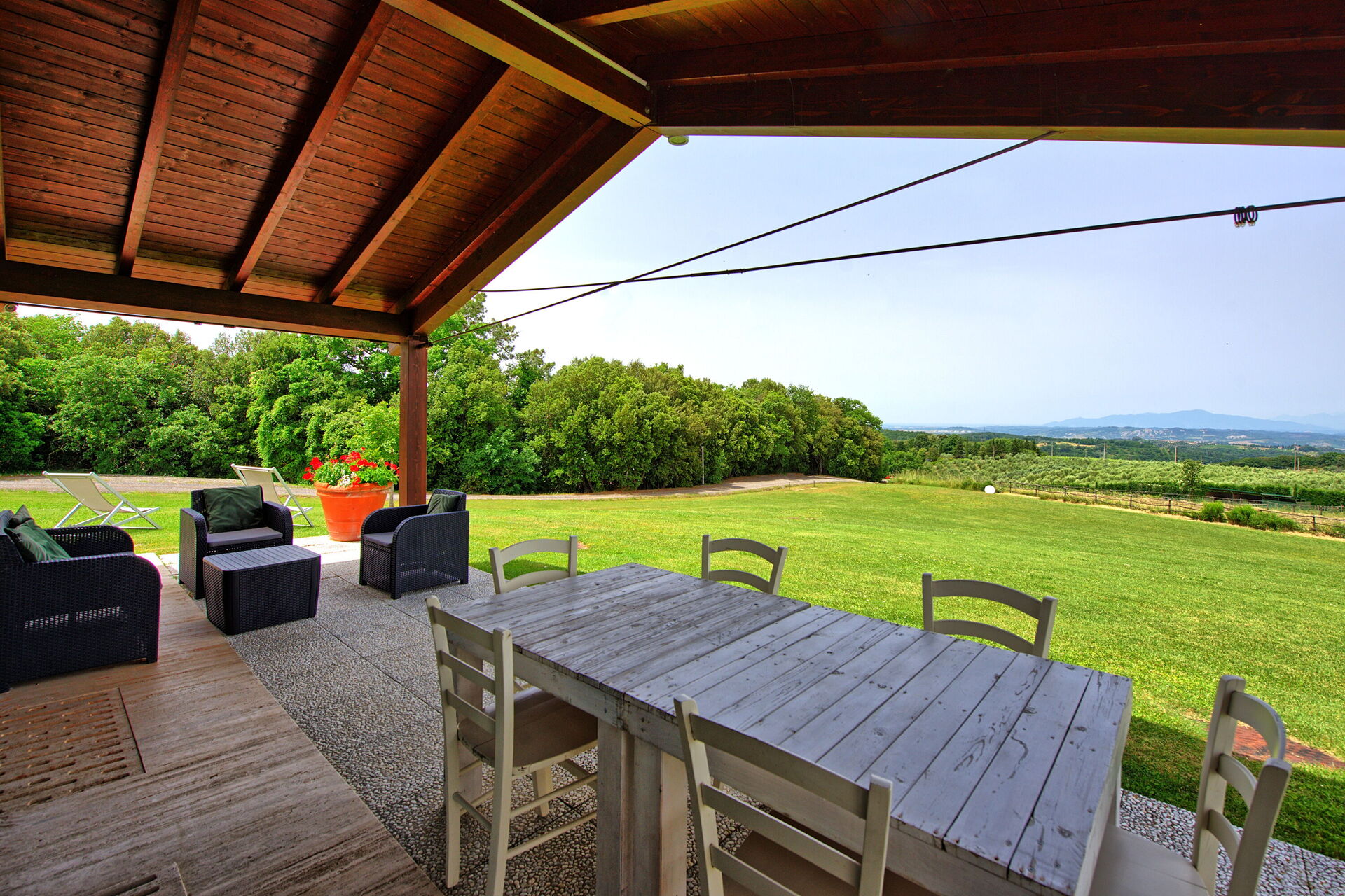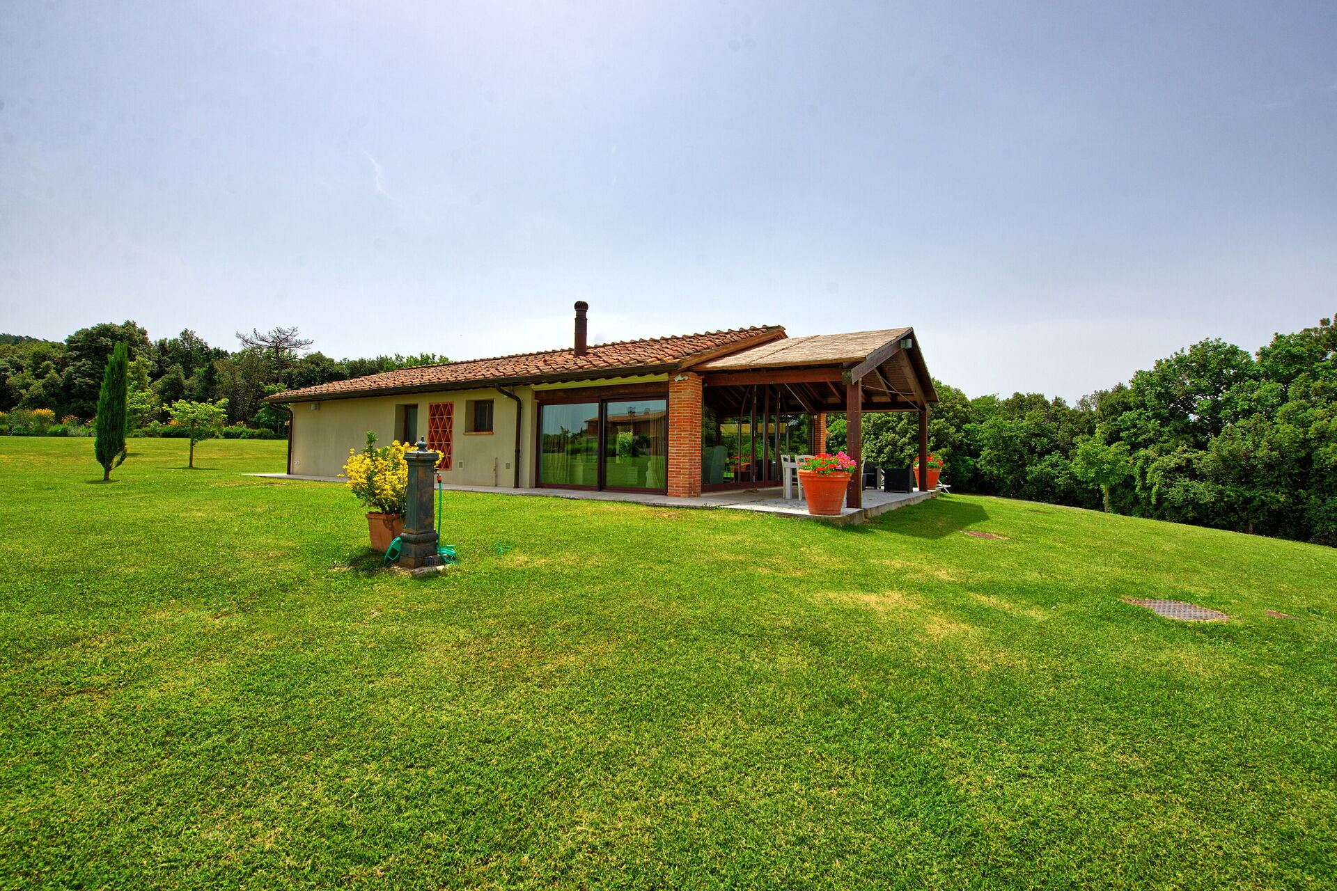 Vanuit de woonkamer is er toegang tot een panoramische veranda ingericht met tafel en stoelen om buiten te eten; barbecue en grote tuin.