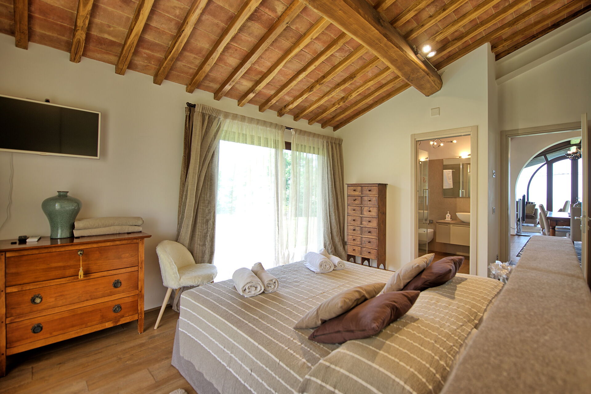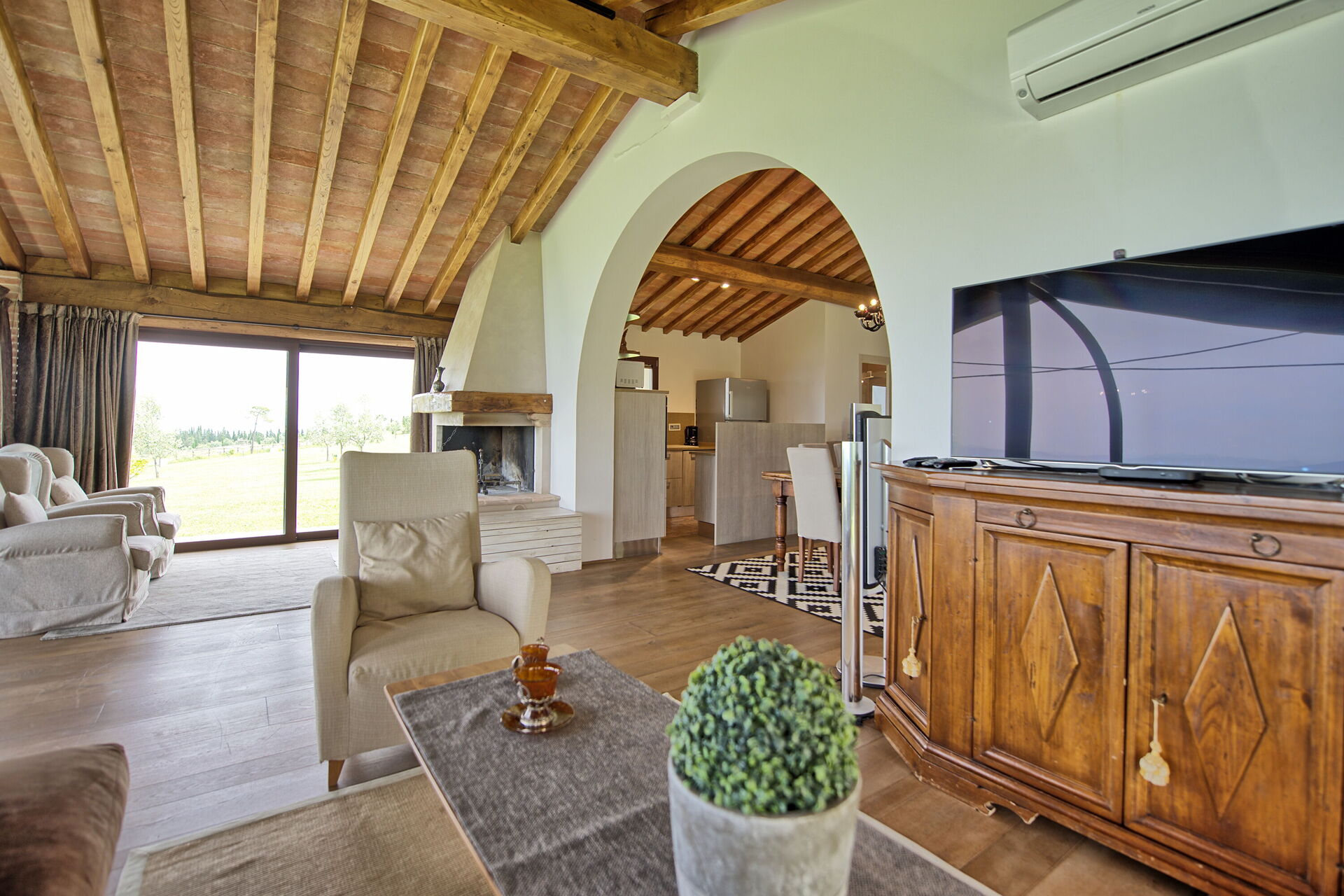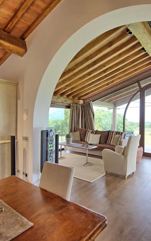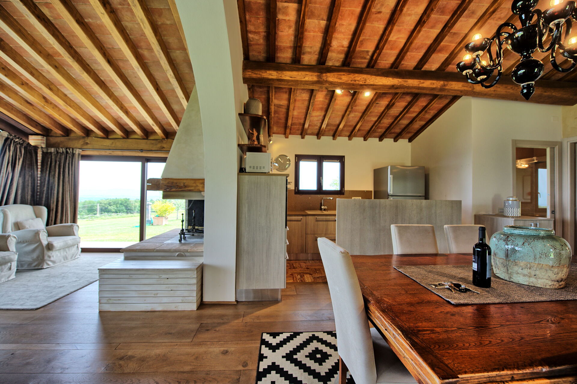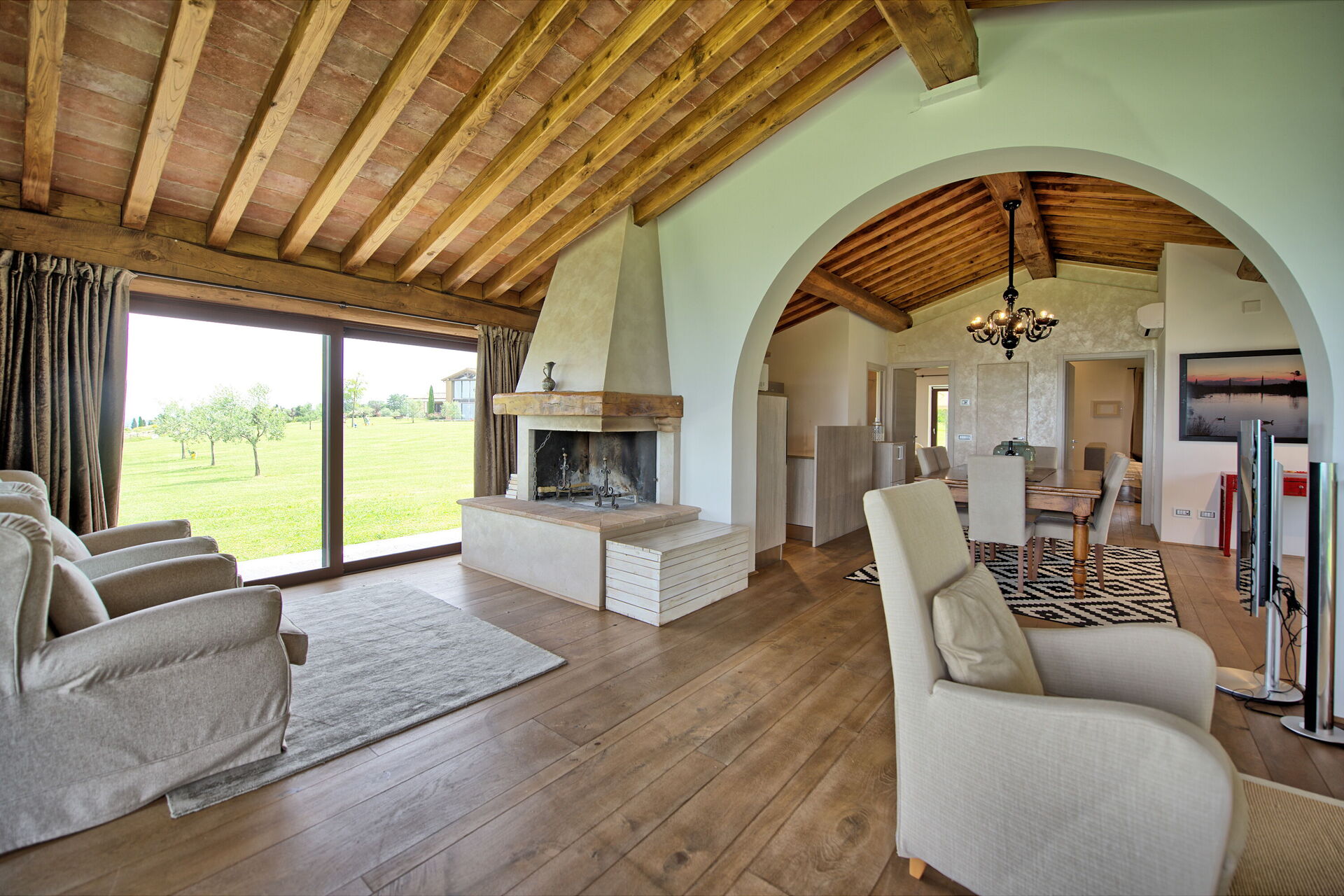 Vanuit de woonkamer is er toegang tot een panoramische veranda ingericht met tafel en stoelen om buiten te eten; barbecue en grote tuin.