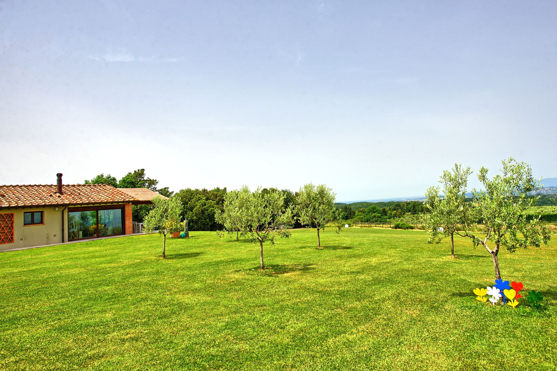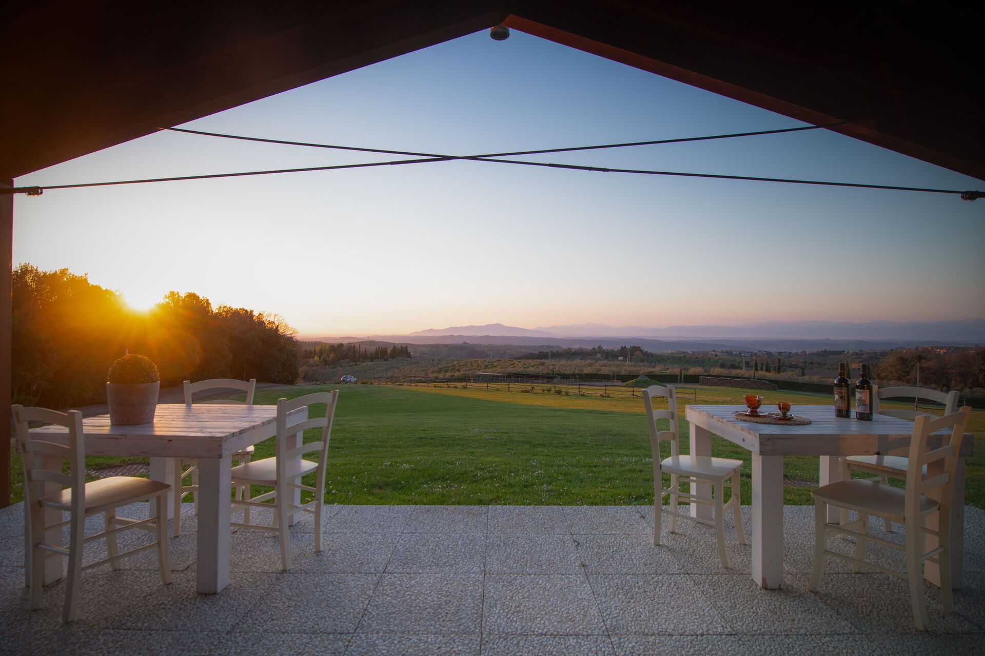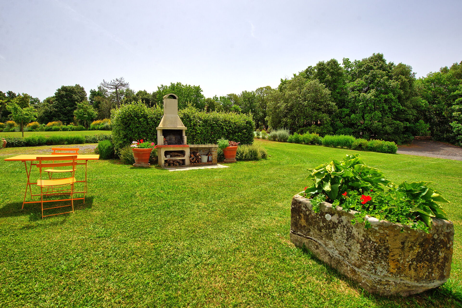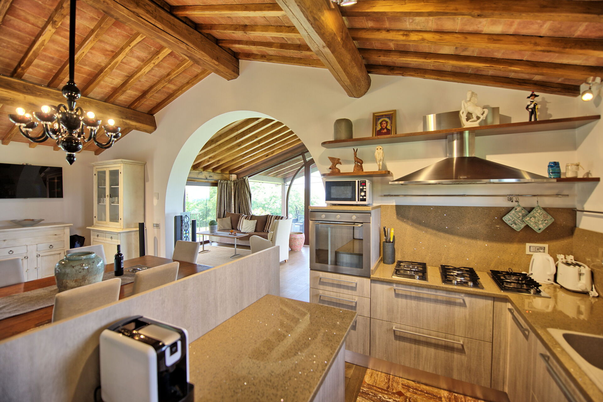Vanuit de woonkamer is er toegang tot een panoramische veranda ingericht met tafel en stoelen om buiten te eten; barbecue en grote tuin.