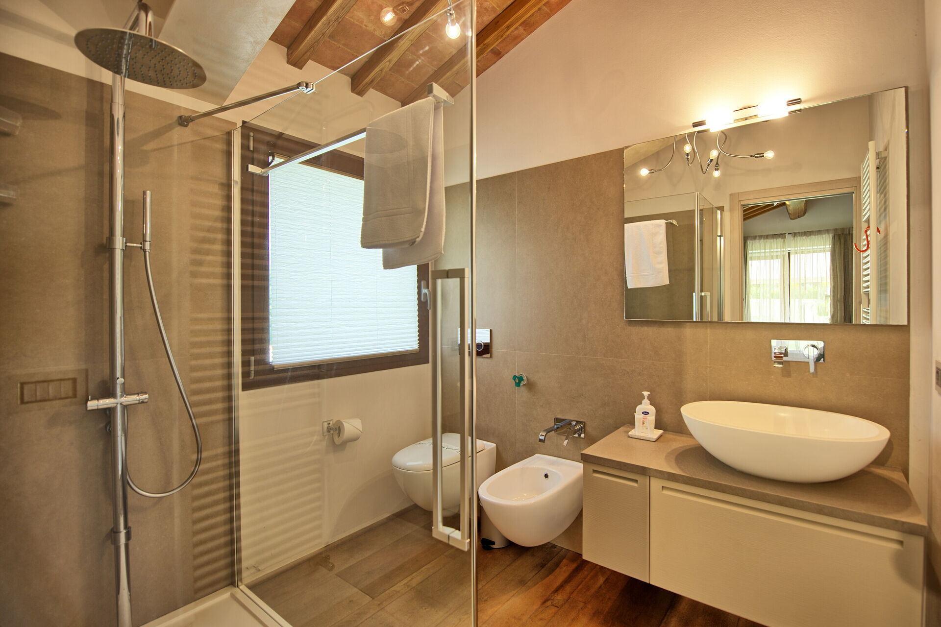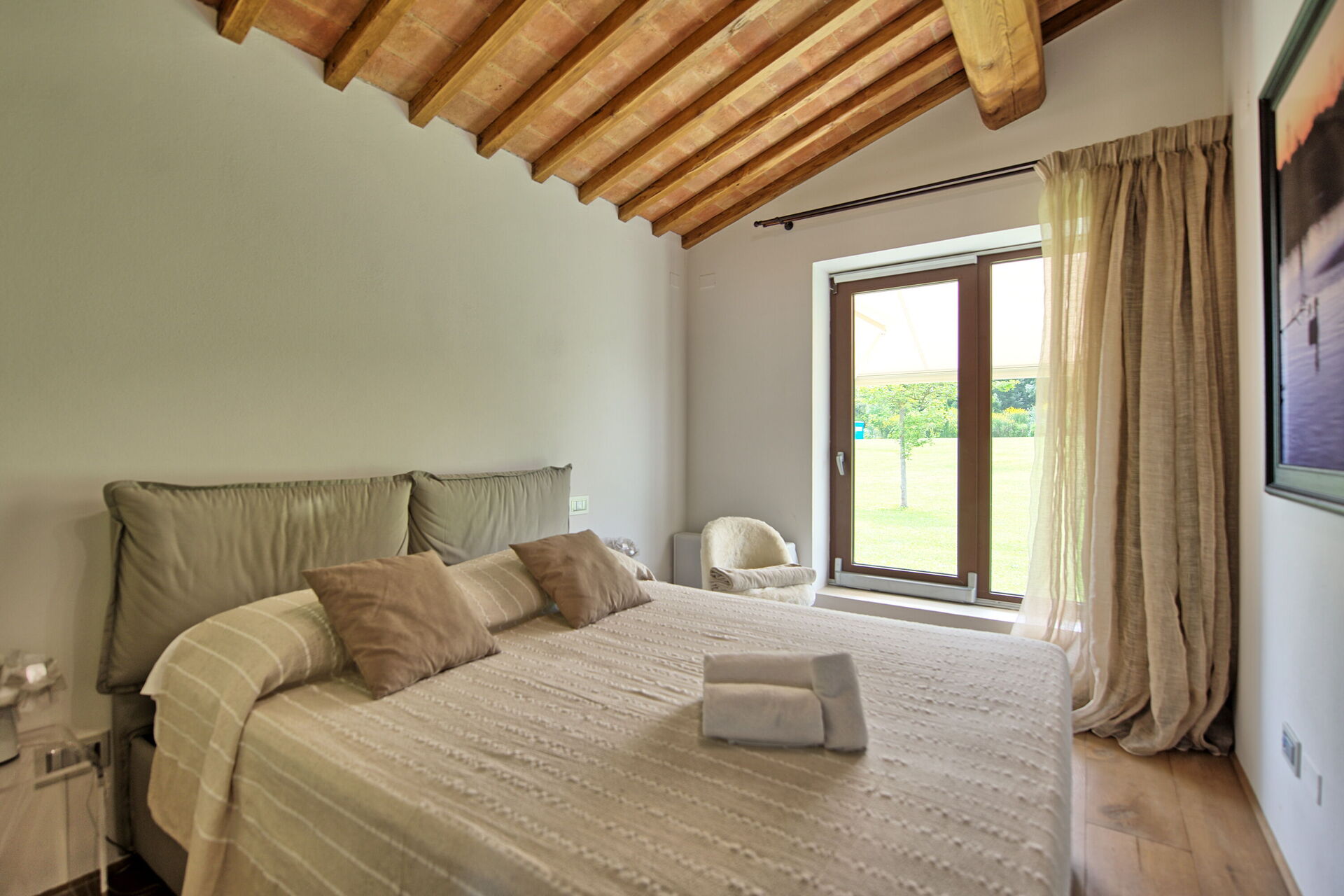 Begane grond: lichte en panoramische woonkamer met open haard, eethoek en keuken (oven, koelkast, vaatwasser, magnetron, broodrooster), 2 slaapkamers met tweepersoonsbedden met eigen badkamer met douche.