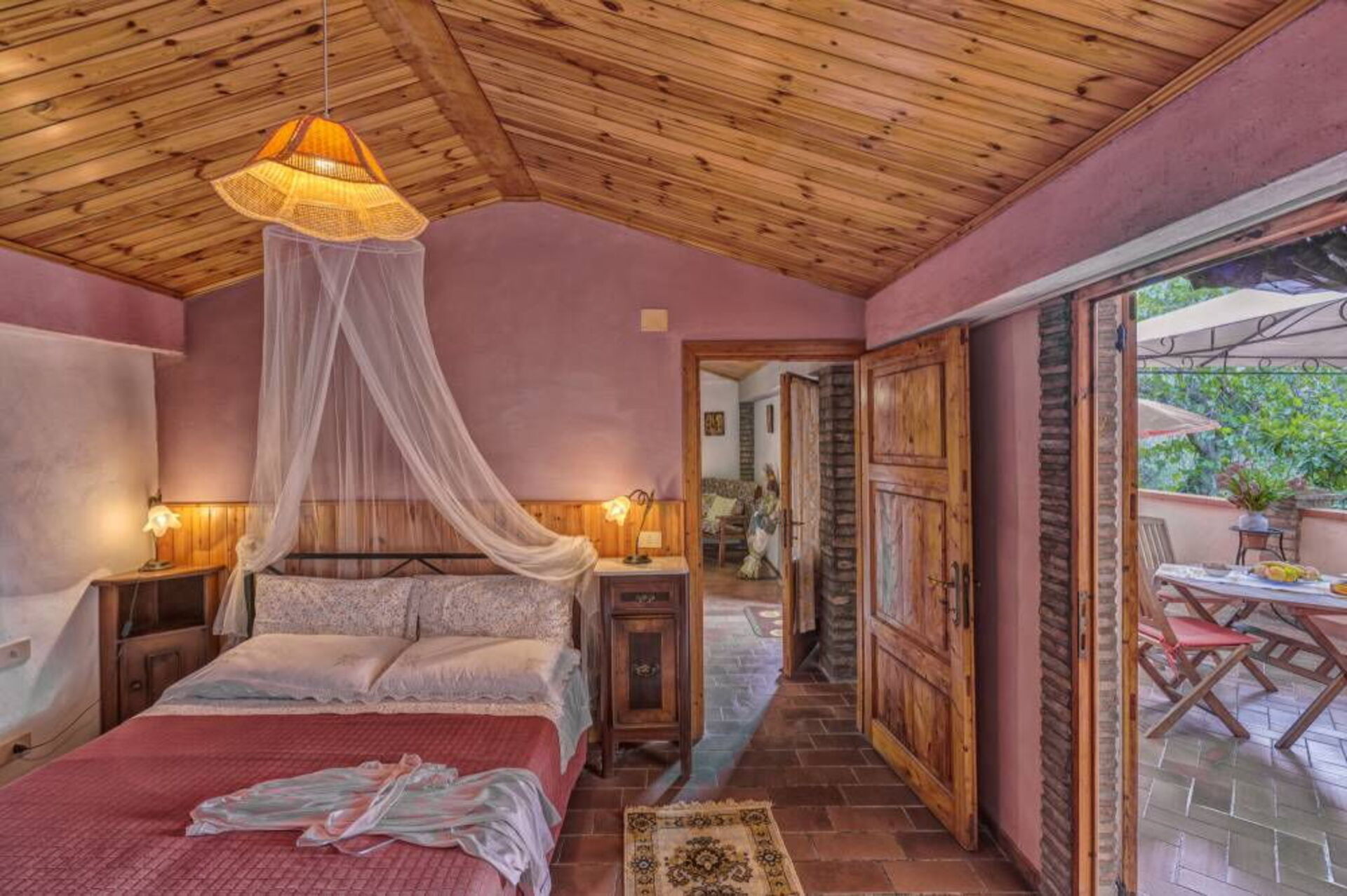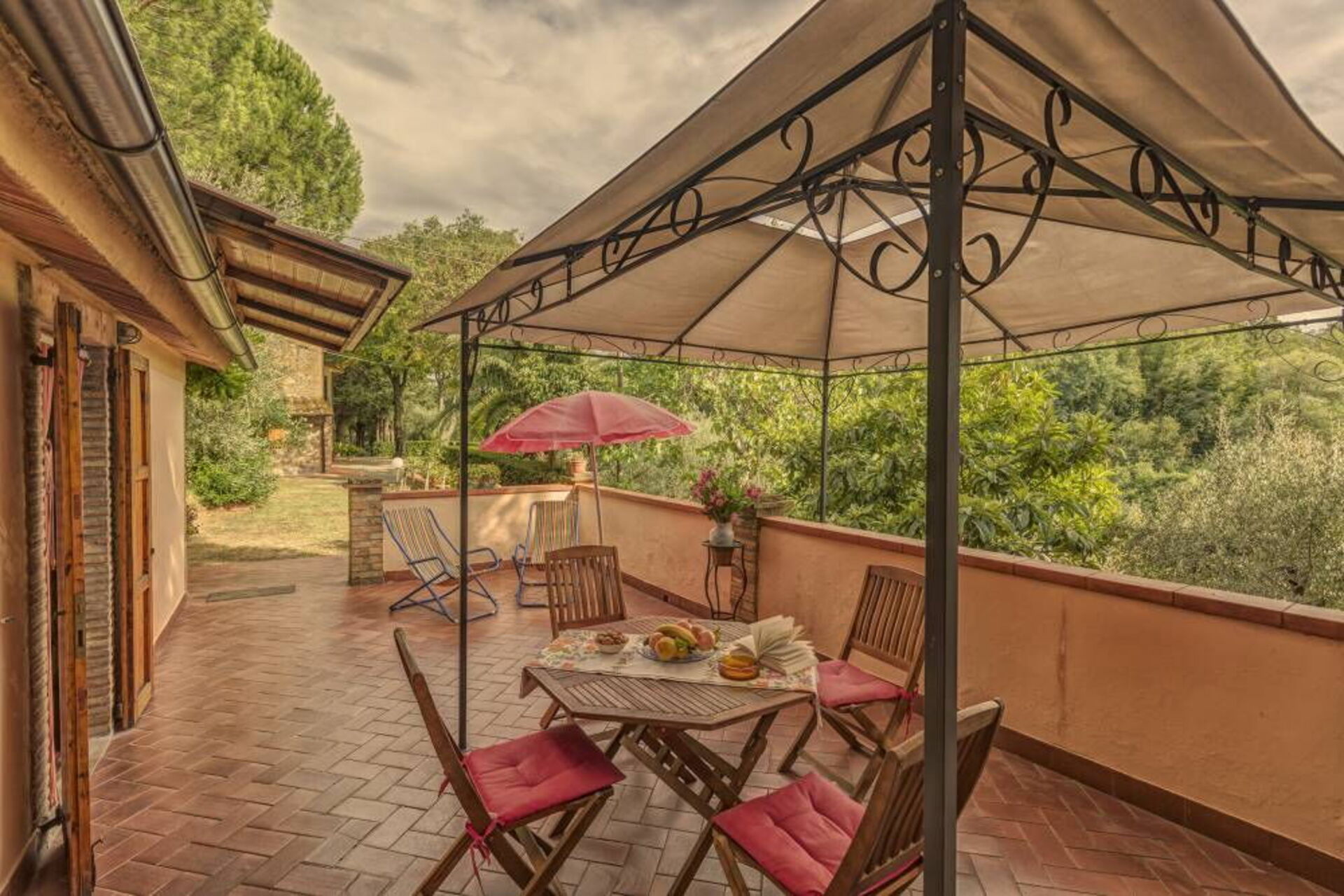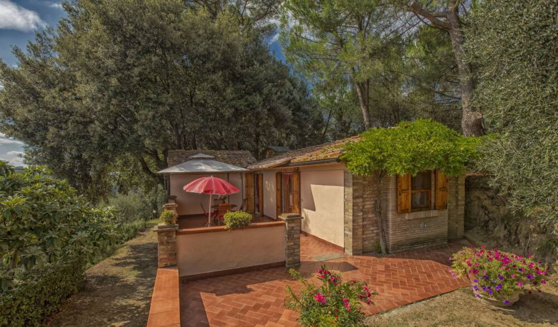 Schilderachtig zonneterras van 25 m2 ingericht met een tuinhuisje, tafel en stoelen.