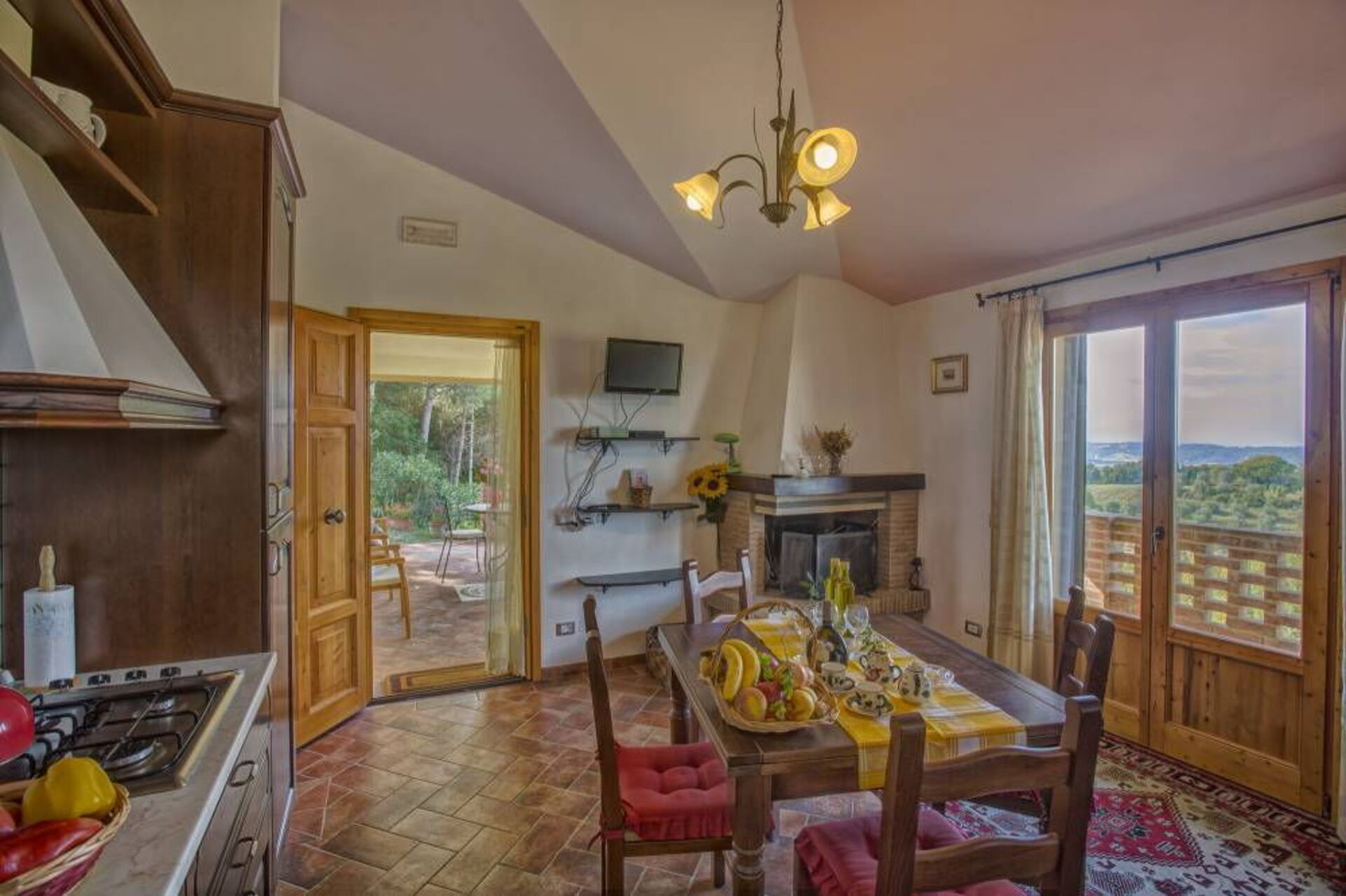 Overdekt terras van 20 m2 met mooi uitzicht en een tafel, stoelen en ligstoelen.