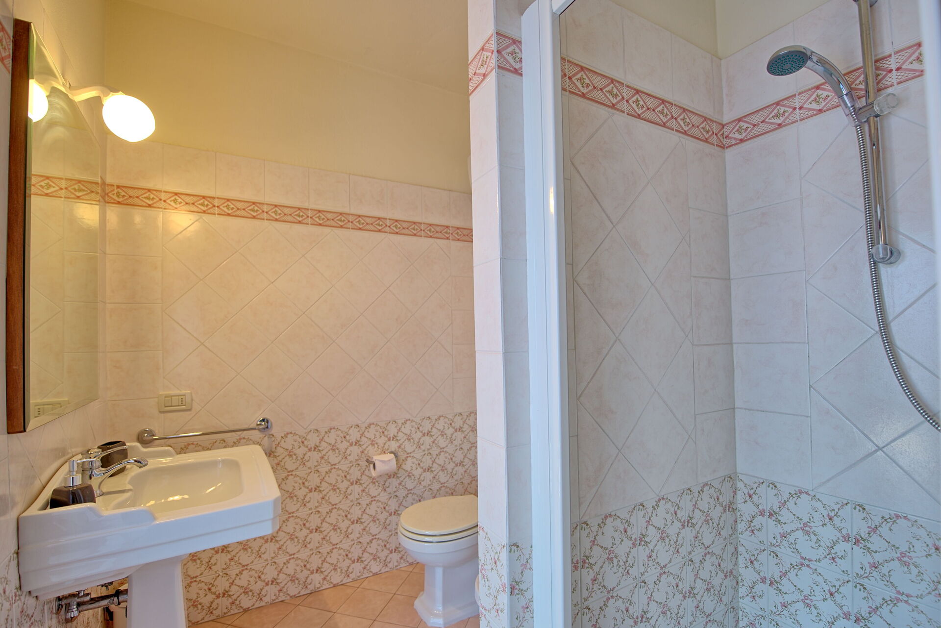 2 treden hoger: badkamer met douche, slaapkamer met tweepersoonsbed.