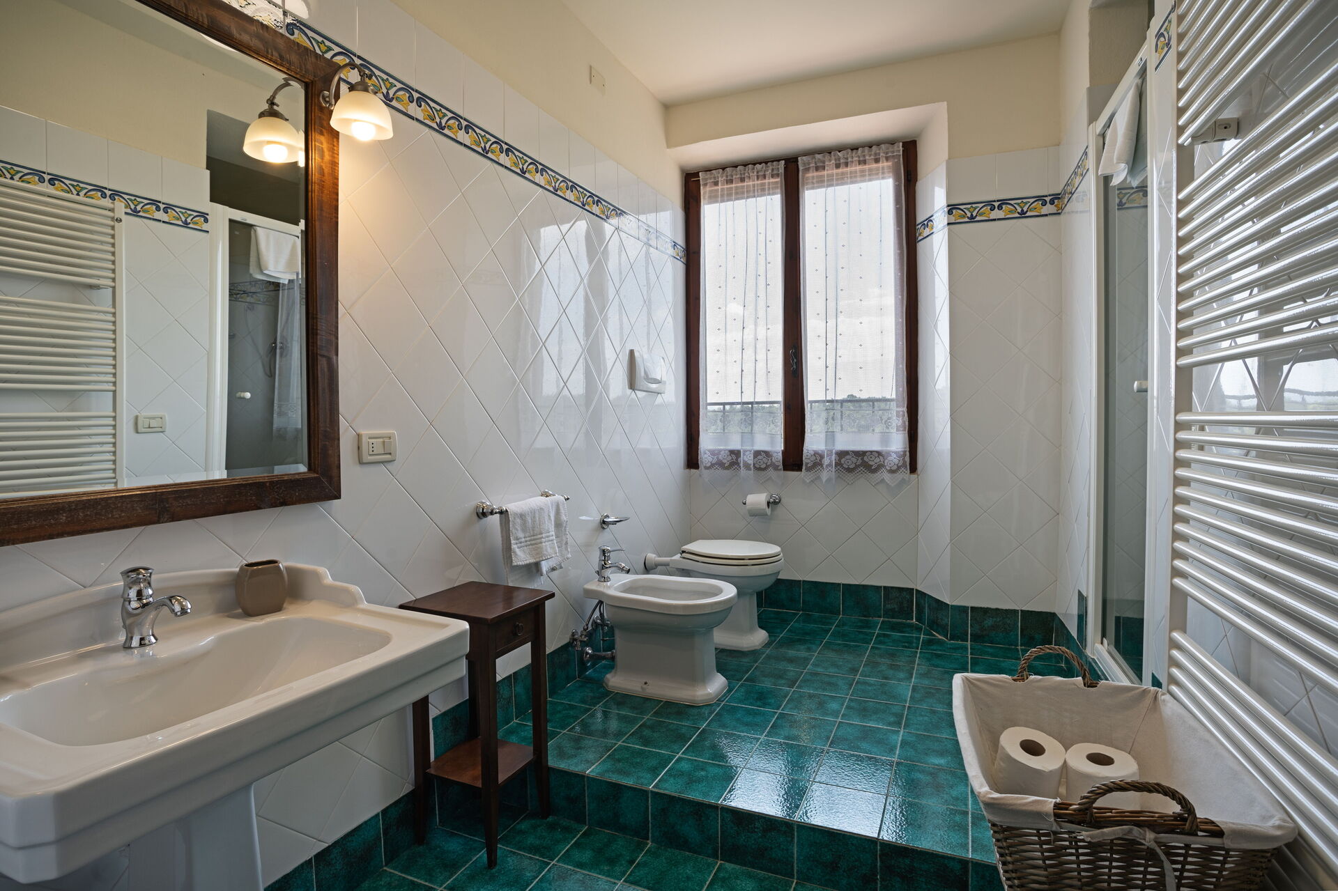 Tweede verdieping: keuken (4 pits kookplaat, koelkast, espressomachine, waterkoker) met eettafel, slaapkamer met tweepersoonsbed met eigen badkamer met douche, woonkamer, slaapkamer met tweepersoonsbed, badkamer met douche.