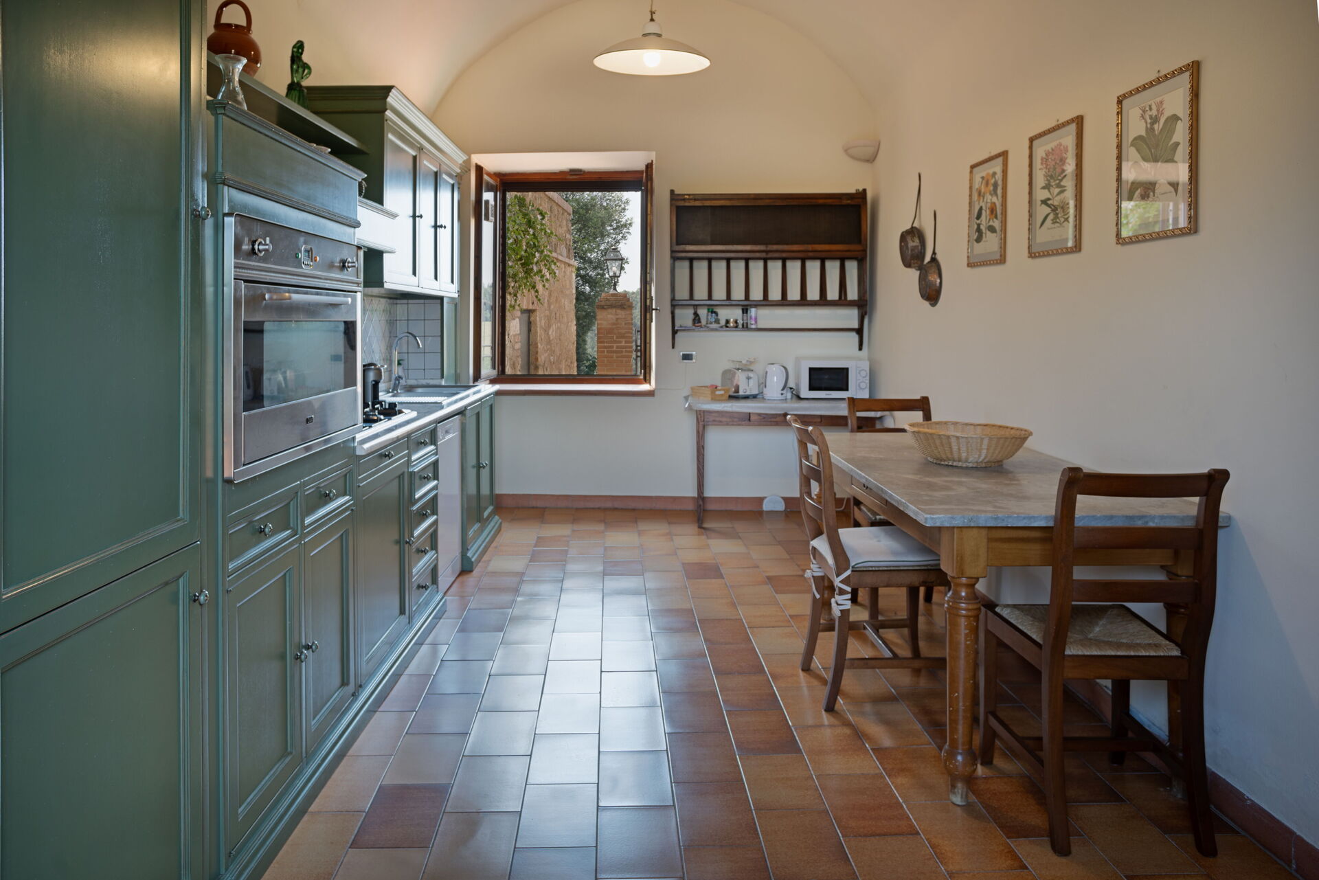 Begane grond: woonkamer (tv en open haard) met eethoek en toegang naar buiten, keuken (oven, vaatwasser, magnetron, waterkoker, broodrooster, espressomachine, koelkast, vriezer), toilet.