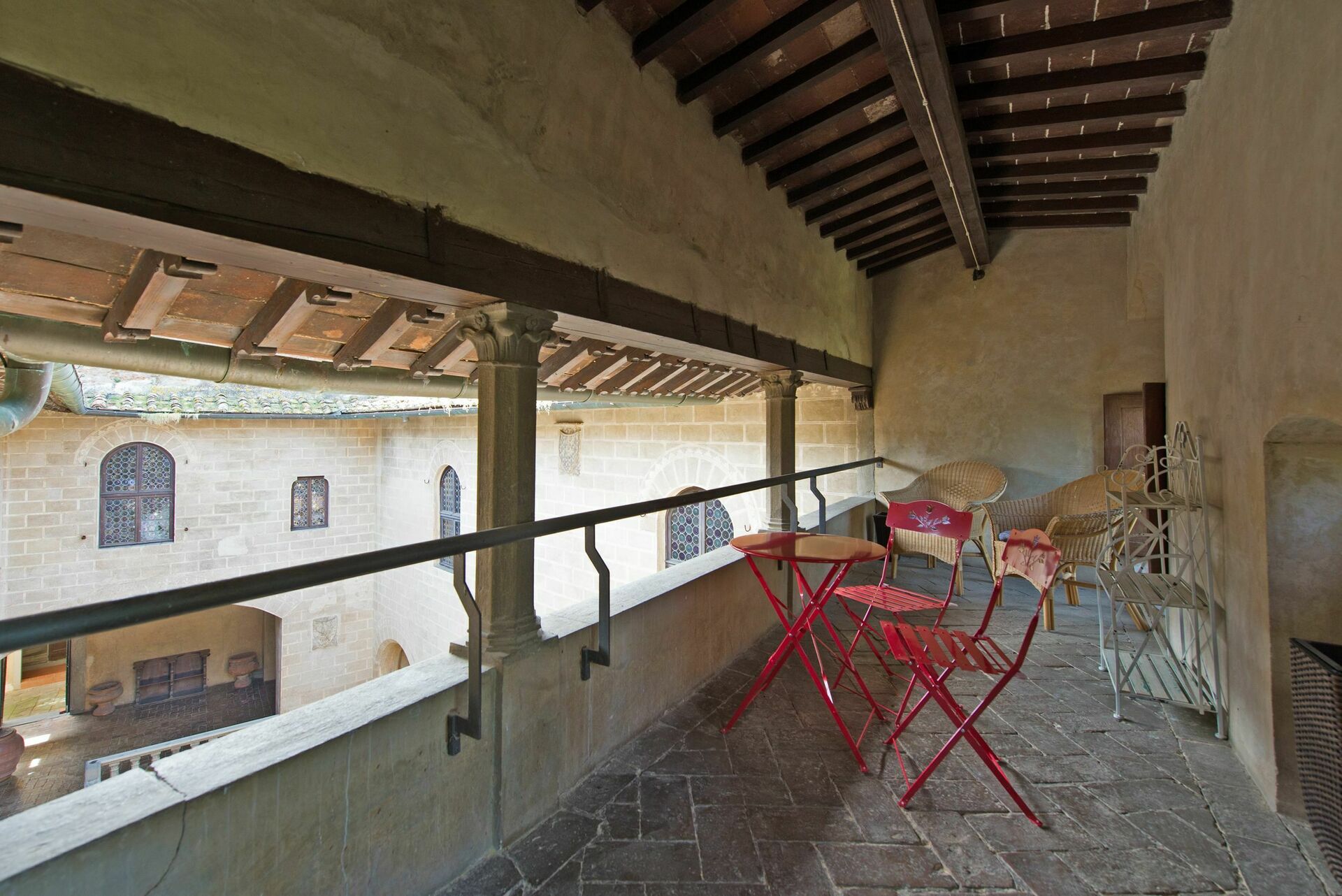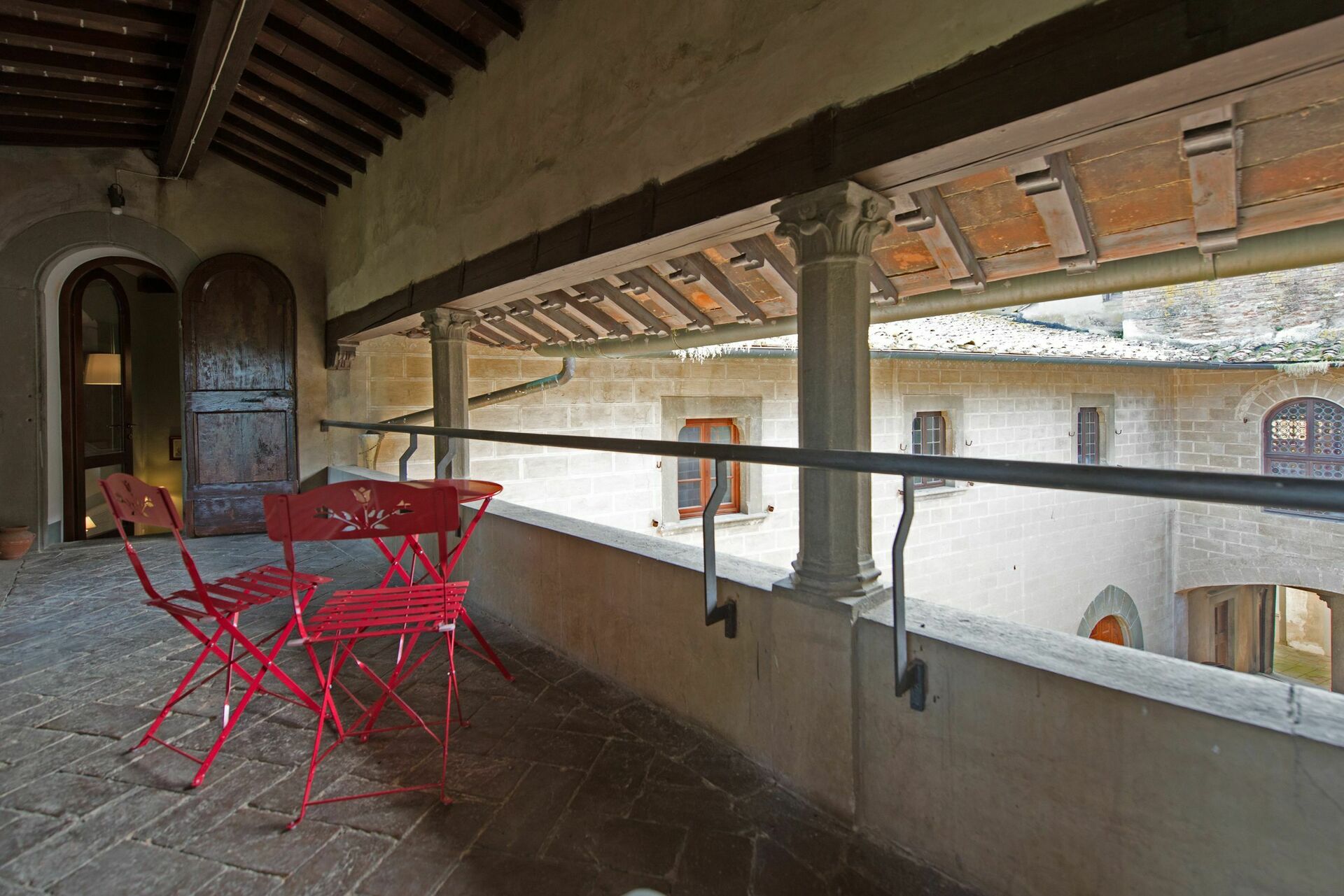 Gracieus terras met uitzicht over de binnenplaats uit de middeleeuwen.