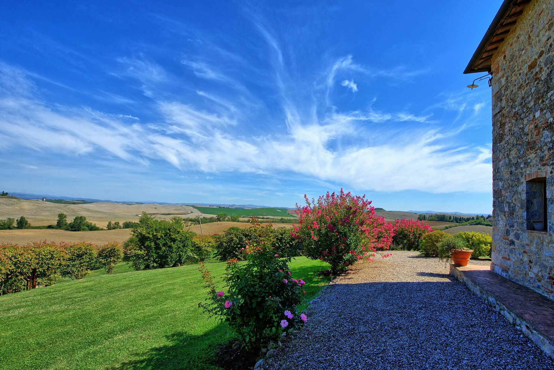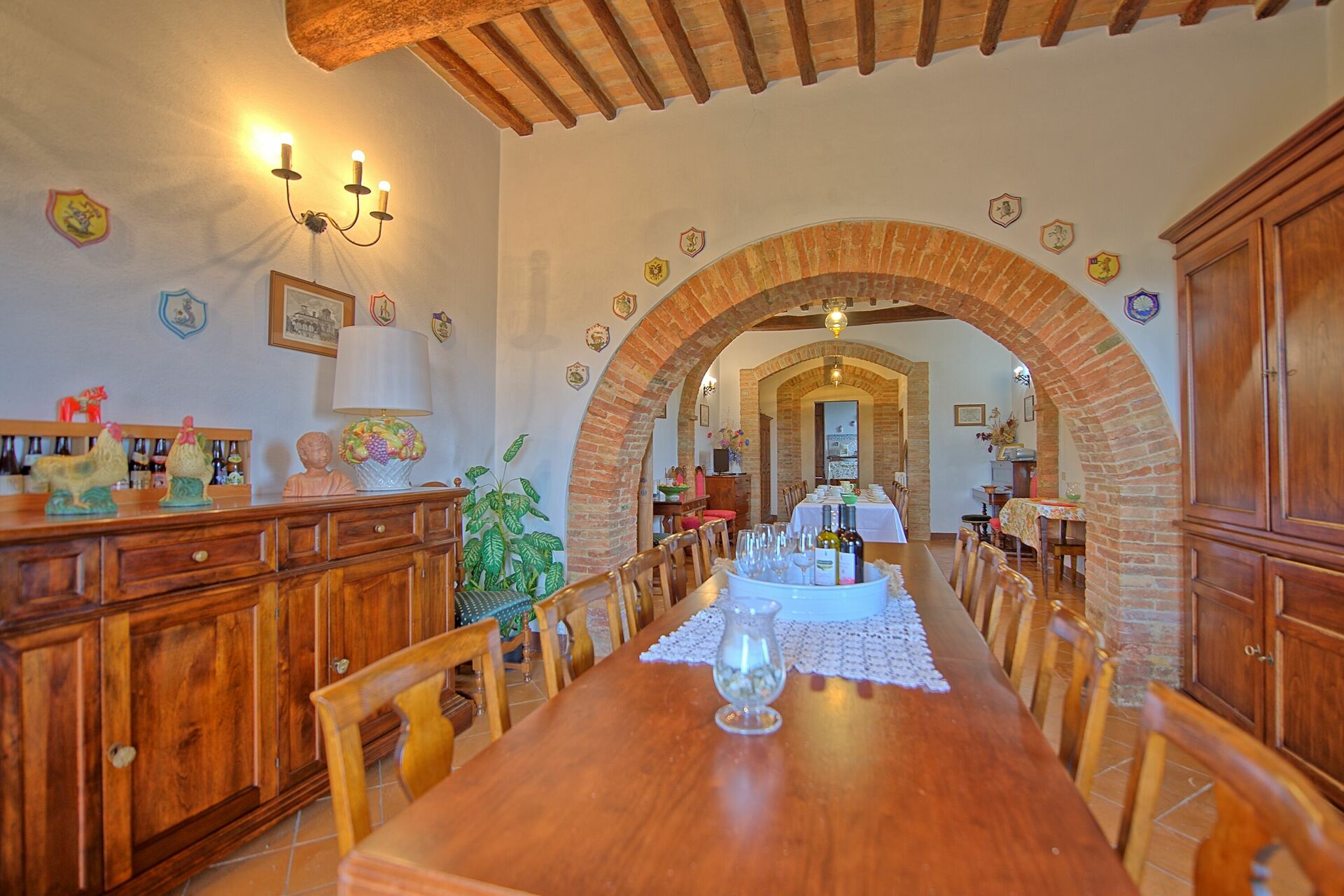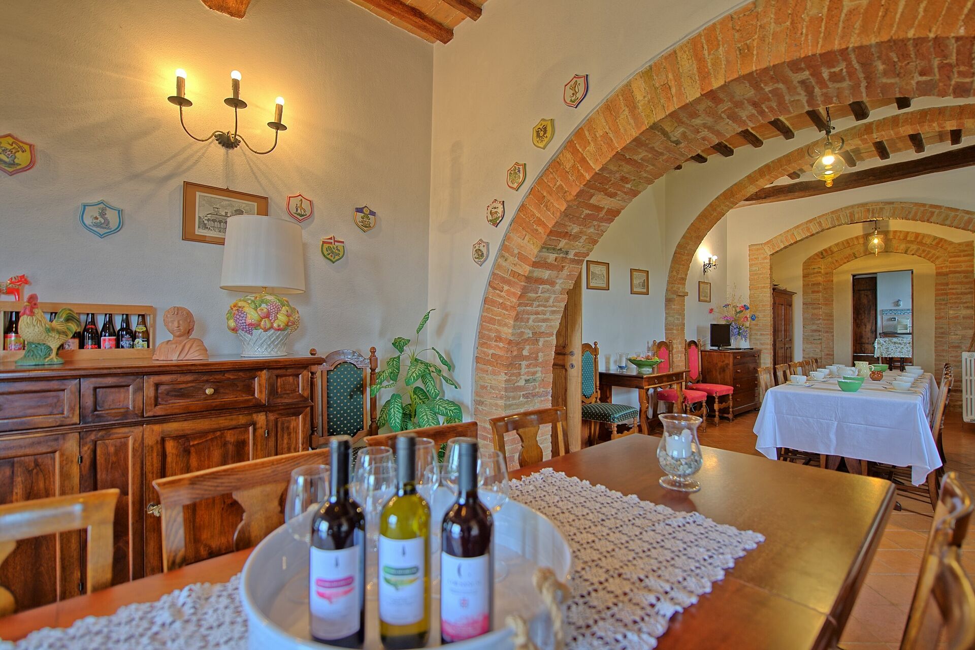 Zeven ruime en karakteristieke appartementen die zorgvuldig en met veel smaak gerestaureerd zijn, in een indrukwekkend boerenhuis dat in de Middeleeuwen een kerk geweest moet zijn. Het huis ligt om een mooie binnenplaats en op ong. 50 meter afstand ligt nog een gracieus bijgebouw dat tevens geheel gerestaureerd is. Rustig en hoog gelegen op een heuvel, ten zuiden van Siena op de grens met de zogenaamde ”Crete Senesi”, op een groot boerenbedrijf (400 hectaren) waar olijfolie en wijn geproduceerd worden. Schitterend uitzicht over een landschap met glooiende heuvels van de Orcia vallei en de stad Siena aan de horizon. De appartementen zijn comfortabel ingericht in landelijke stijl. Buiten kunnen de gasten gebruik maken van een mooi gedeeltelijk overdekt terras (110m2) met schitterend uitzicht.