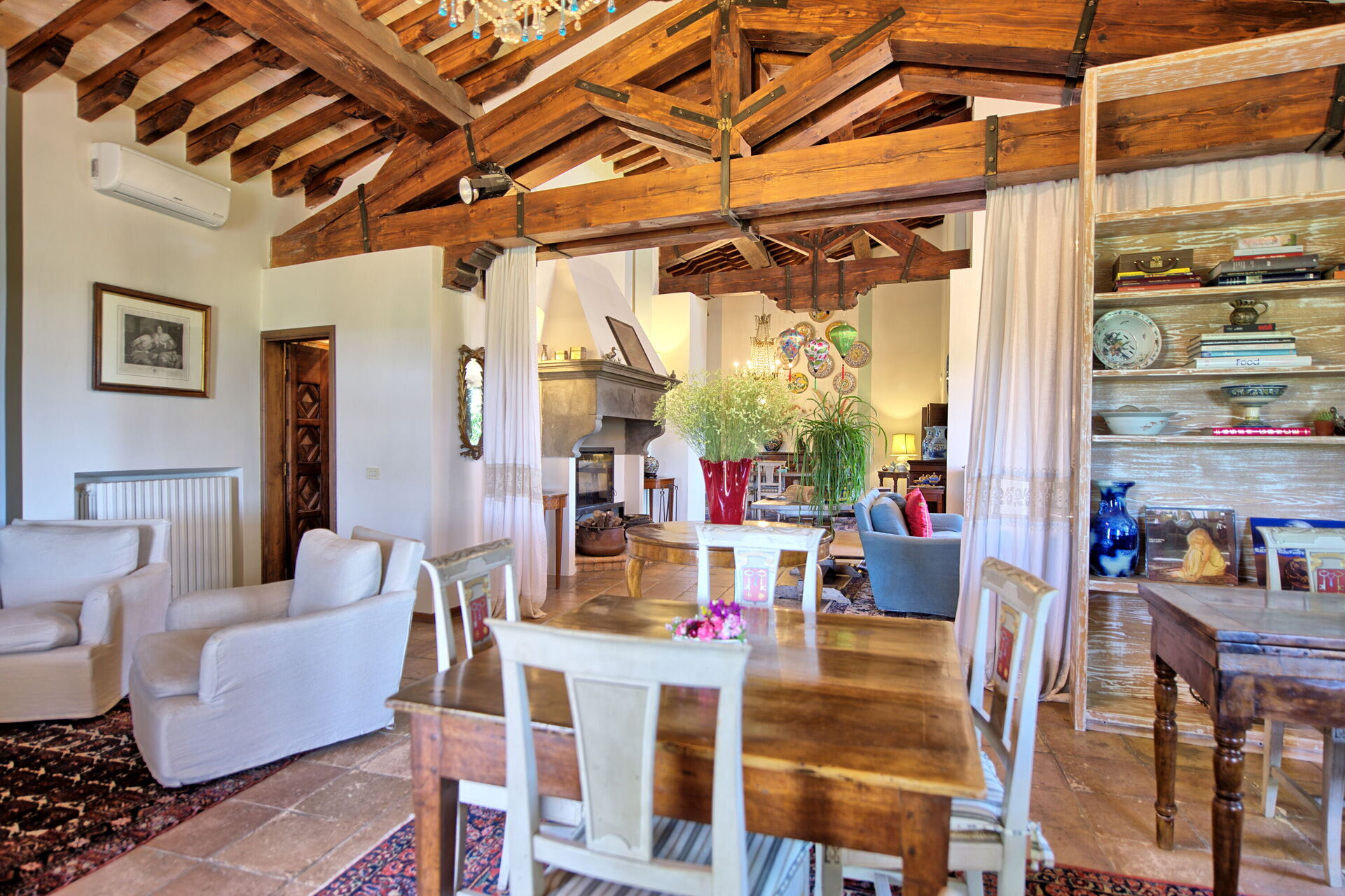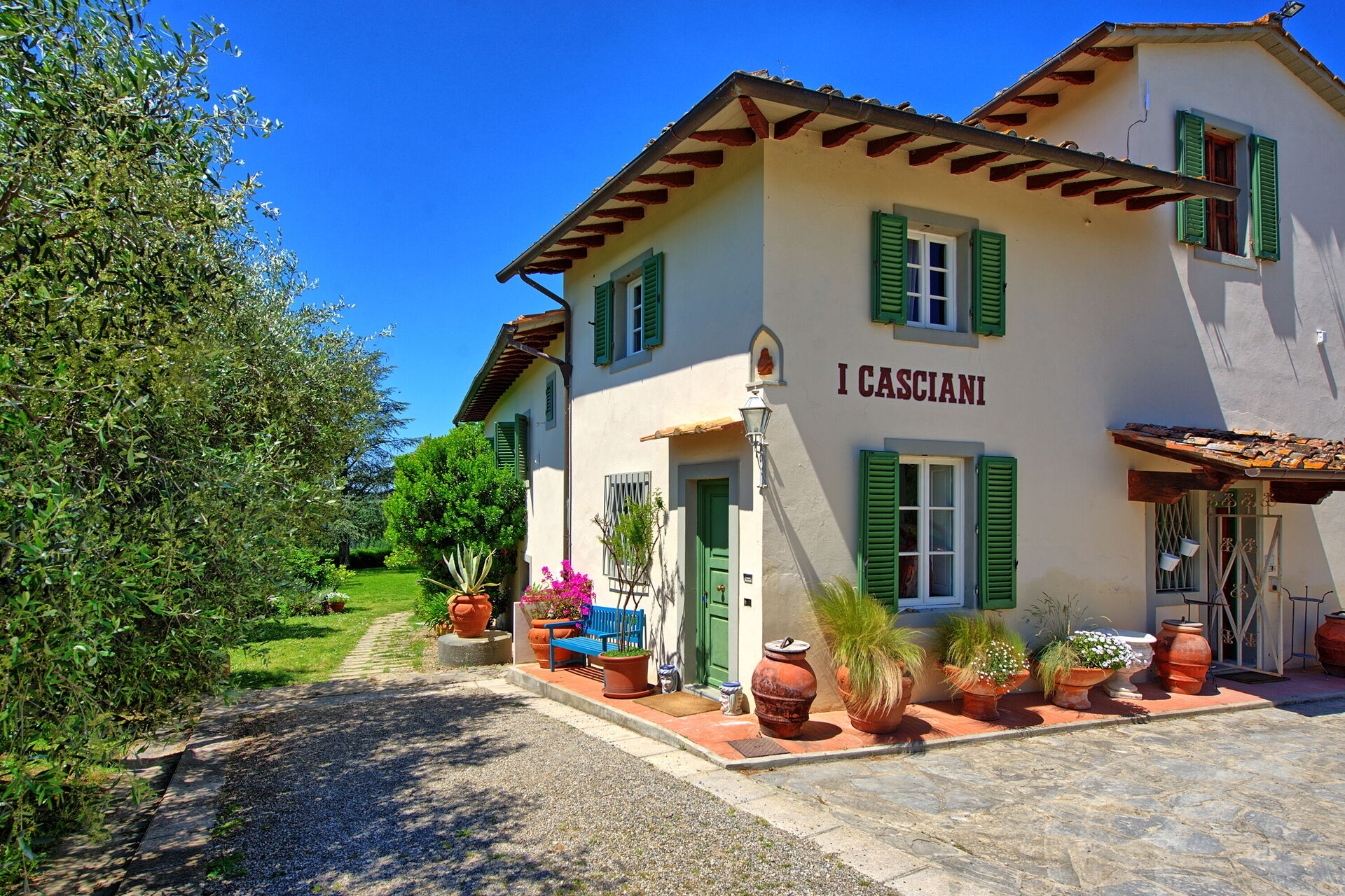 Villa Casciani is nestled in a farm among vineyards and olive groves. It is an old farmhouse that was renovated to preserve the original architectural features and create elegant, comfortable interiors. The farm produces extra virgin olive oil, wine, vegetables and honey.