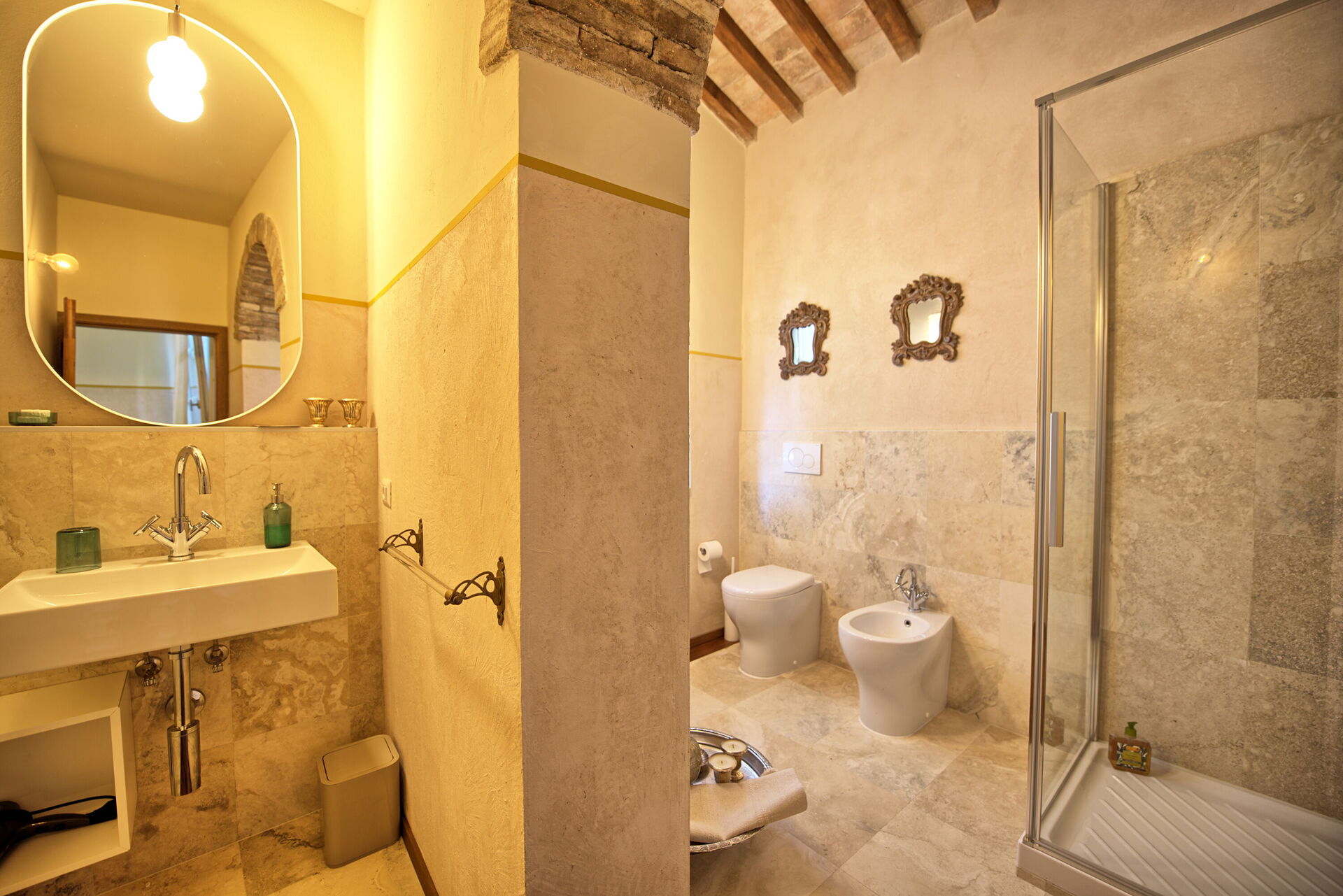 Distances: Montespertoli (shops of all kinds) 4 km, Certaldo 16 km, Montelupo Fiorentino (train station, city of ceramics) 18 km, Empoli (train station) 20 km, San Gimignano 28 km, Vinci 32 km, Florence (airport) 32 km, Volterra 52 km, Siena 55 km, Pisa (airport) 77 km, Lucca 78 km, Tyrrhenian coast with beach clubs 85 km.