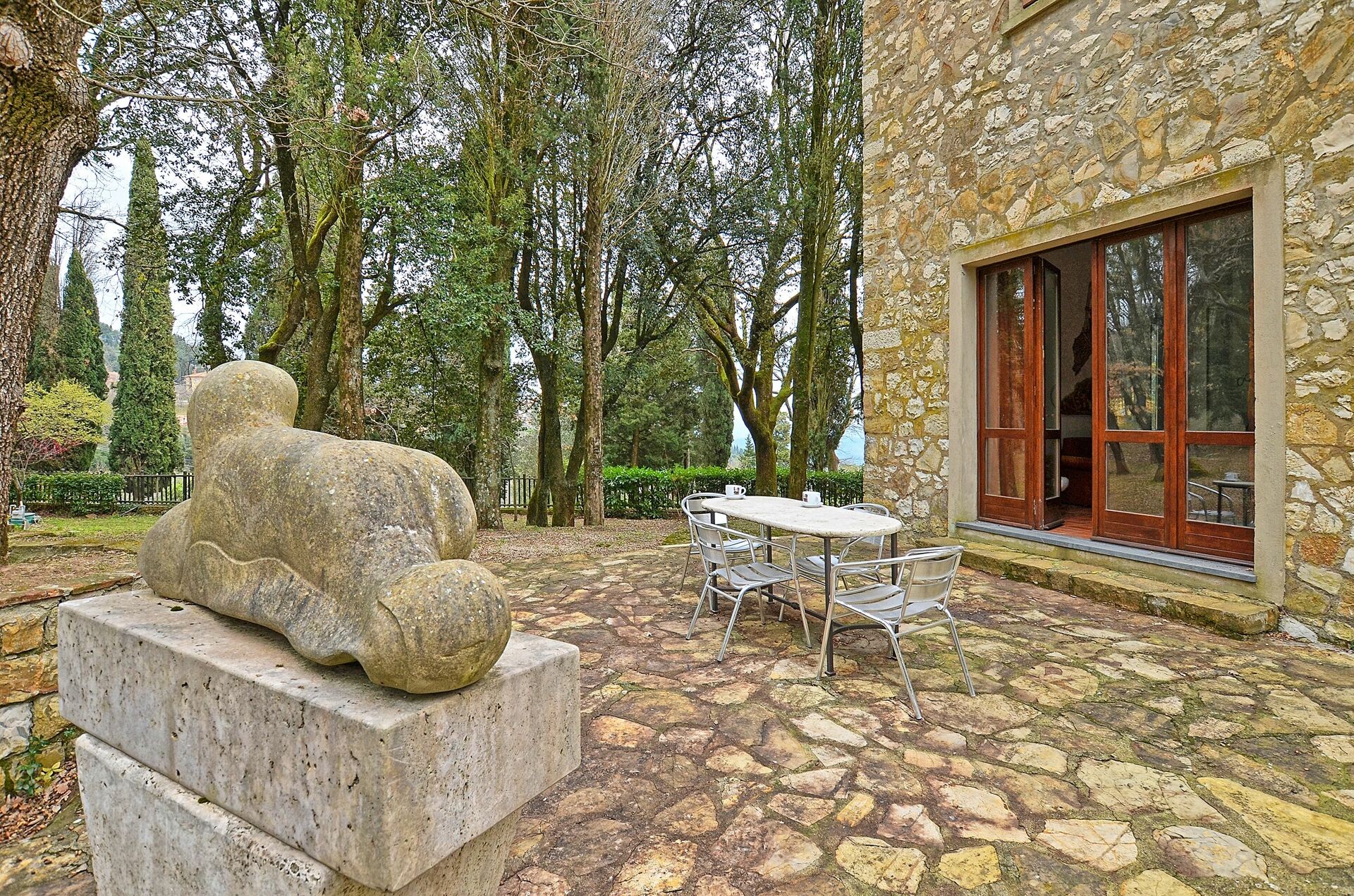 Rondom het huis ligt een grote, deels schaduwrijke privébuitenruimte, ingericht met tafel, stoelen en ligstoelen.