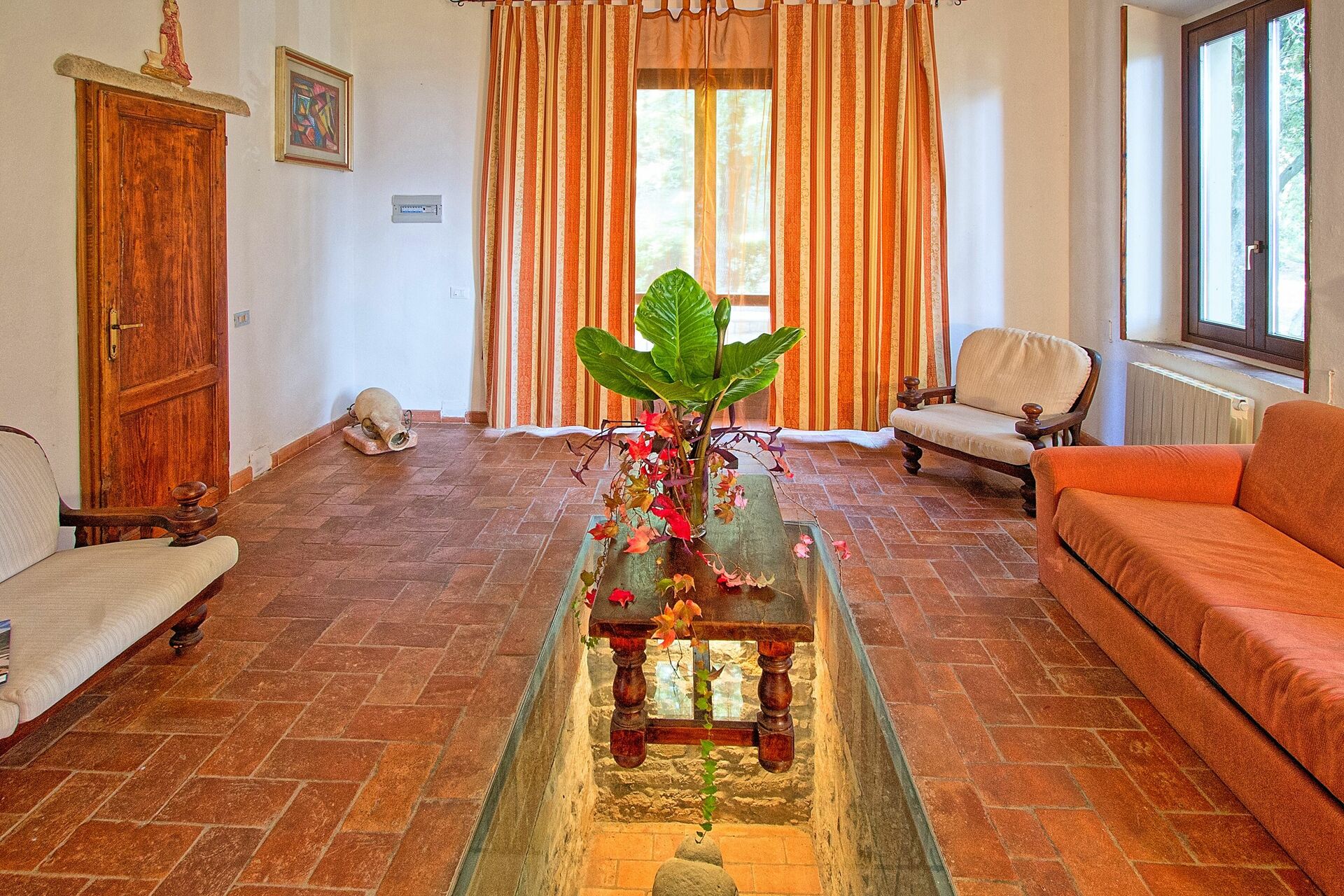Begane grond (toegang via 3 treden): grote woonkamer met 2-persoonsslaapbank en toegang tot buiten, eetgedeelte met oude houtoven, toegang naar buiten en kitchenette (oven, vriezer, vaatwasser, Amerikaanse koffiezetter), badkamer met douche.