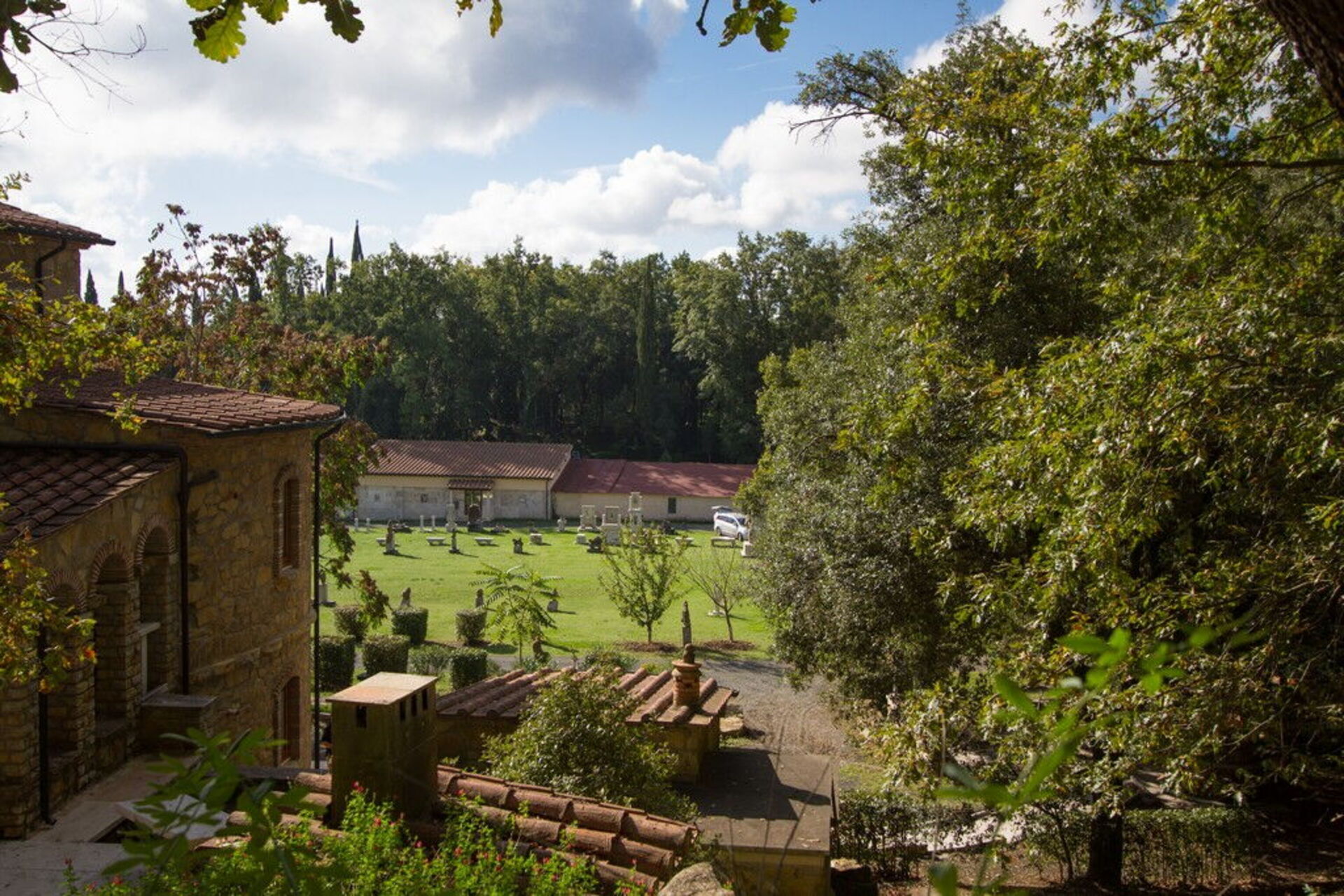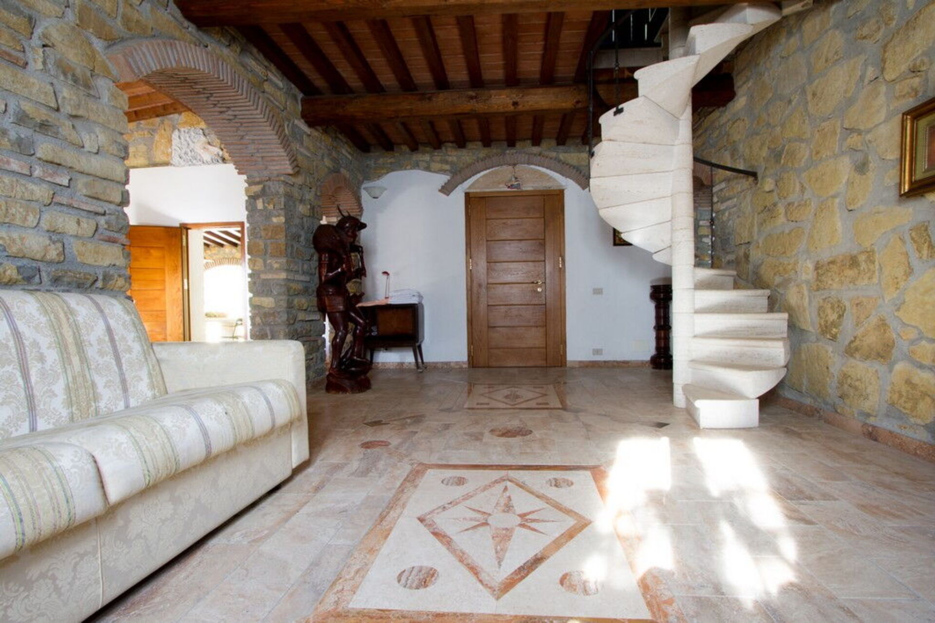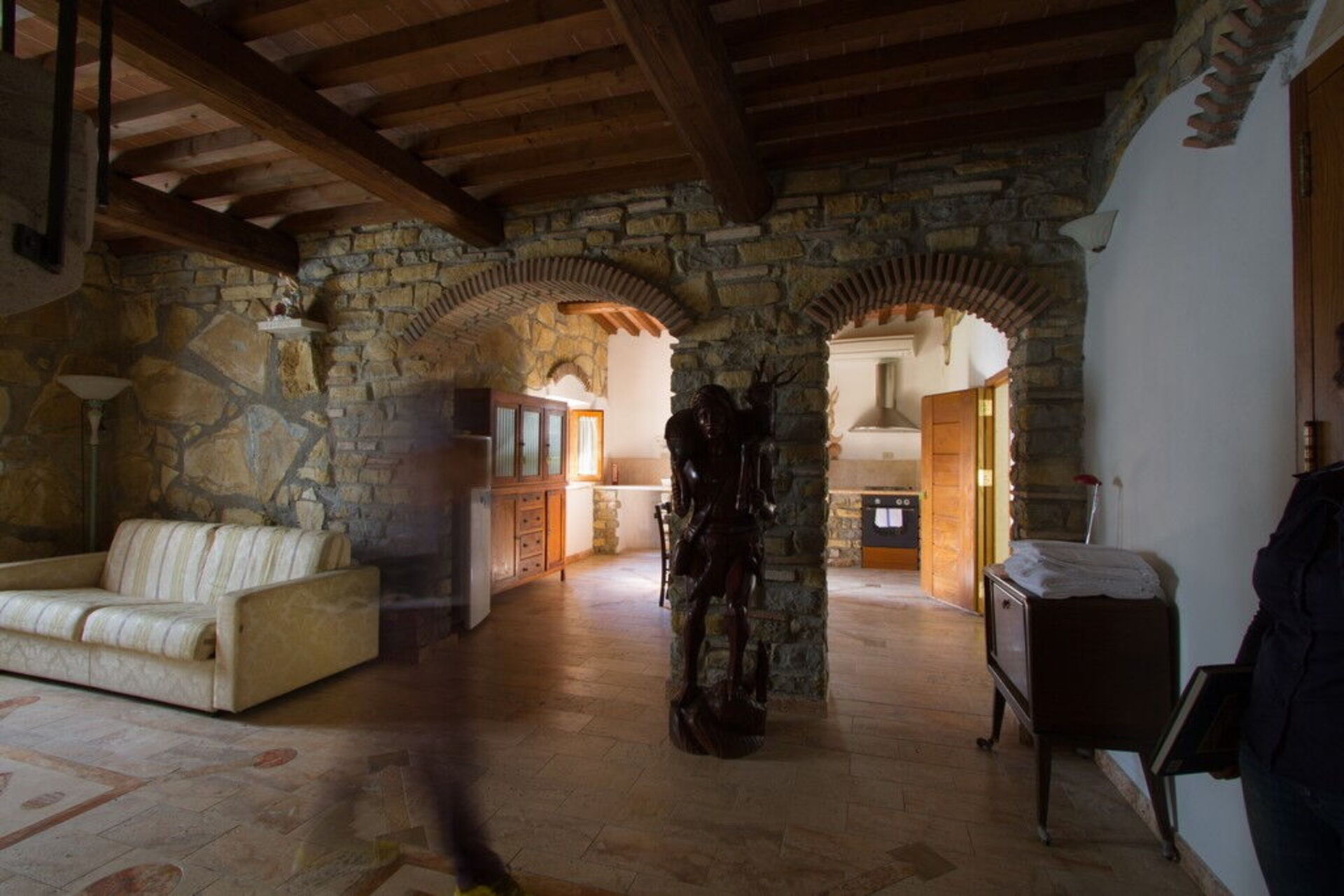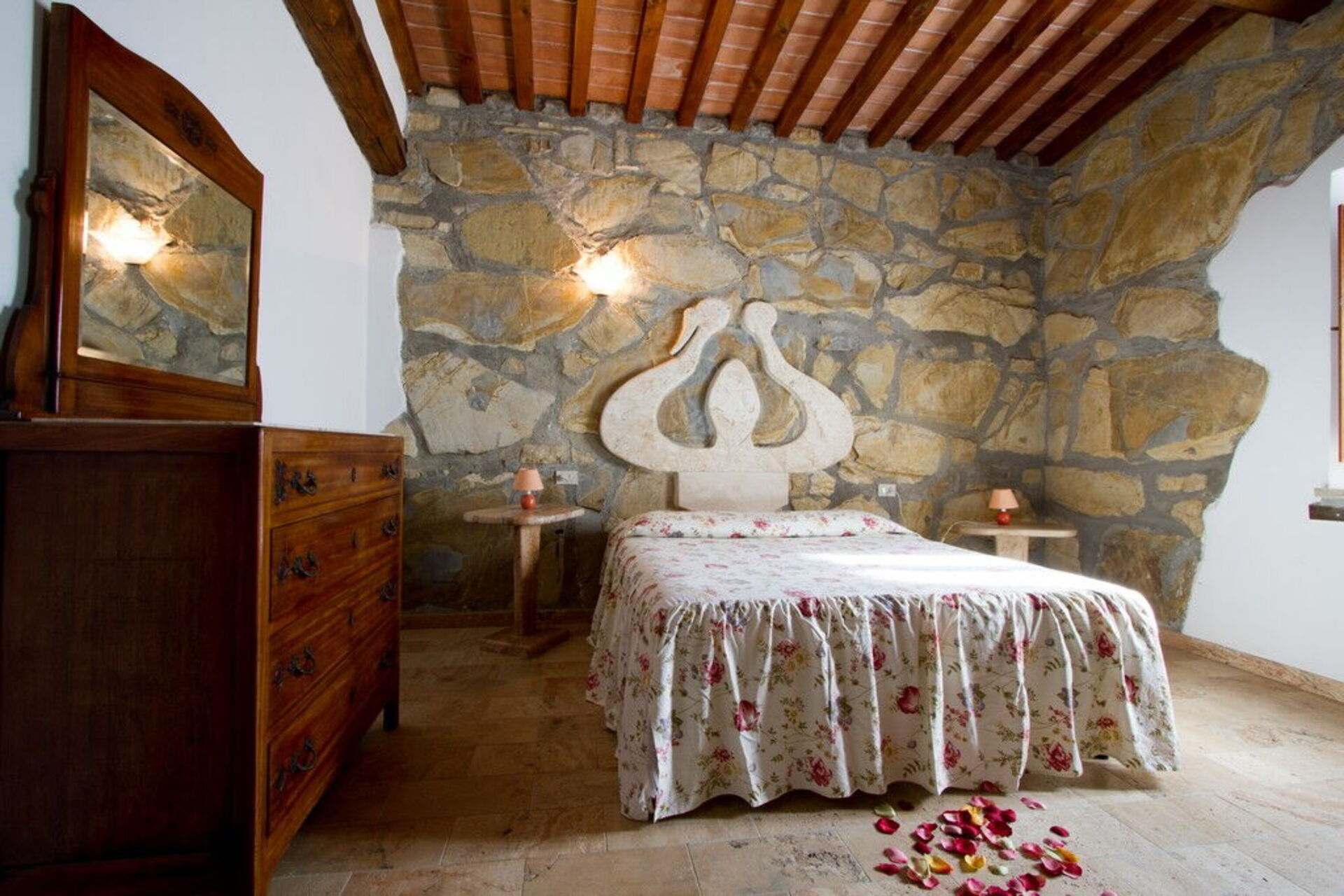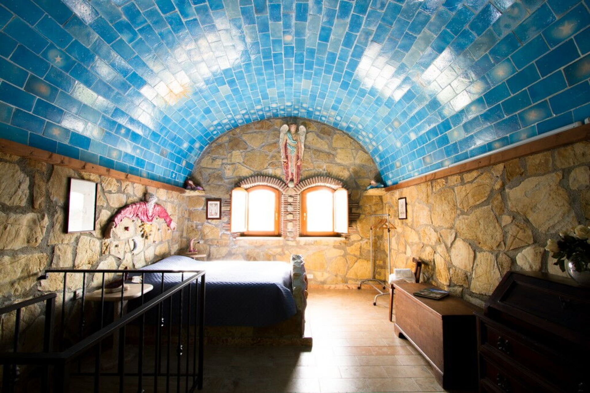Eerste verdieping in de toren: (toegang via een travertijnen spiltrap): slaapkamer met stenen tweepersoonsbed en gewelfde plafonds met keramische tegels gemaakt door de kunstenaar.