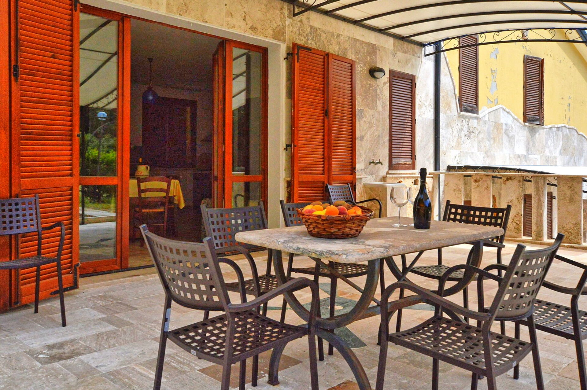 Privé, gemeubileerde buitenruimte met tafel en stoelen.
