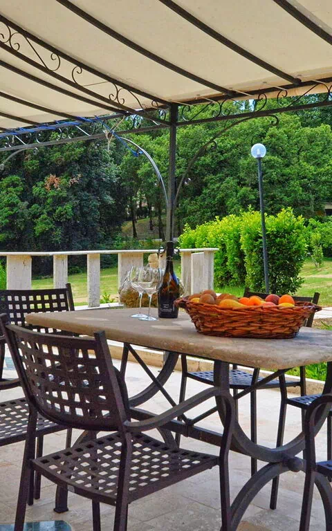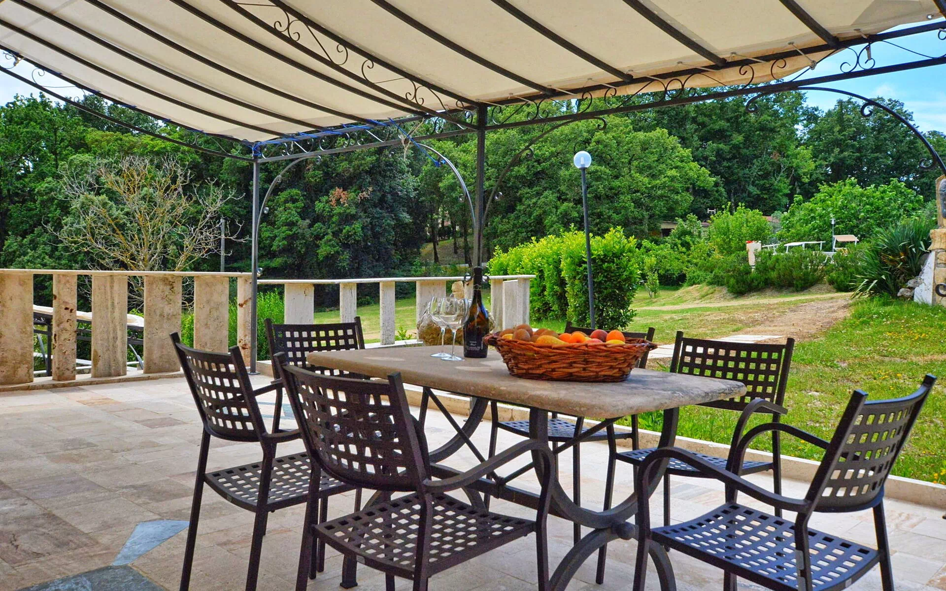 Privé, gemeubileerde buitenruimte met tafel en stoelen.