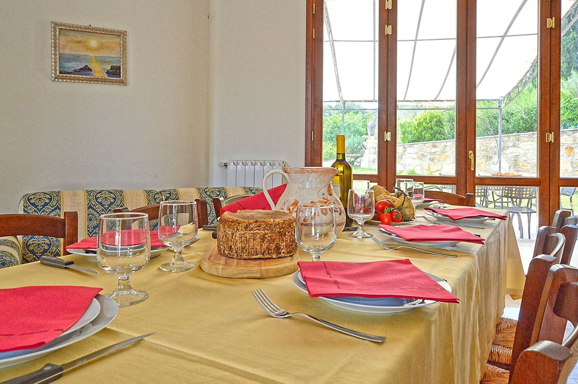 Begane grond: ruime woonkamer met een tweepersoons sofa-bed en eetruimte, overgaand in een groot, gedeeltelijk overdekt terras, open kitchenette, badkamer met douche.