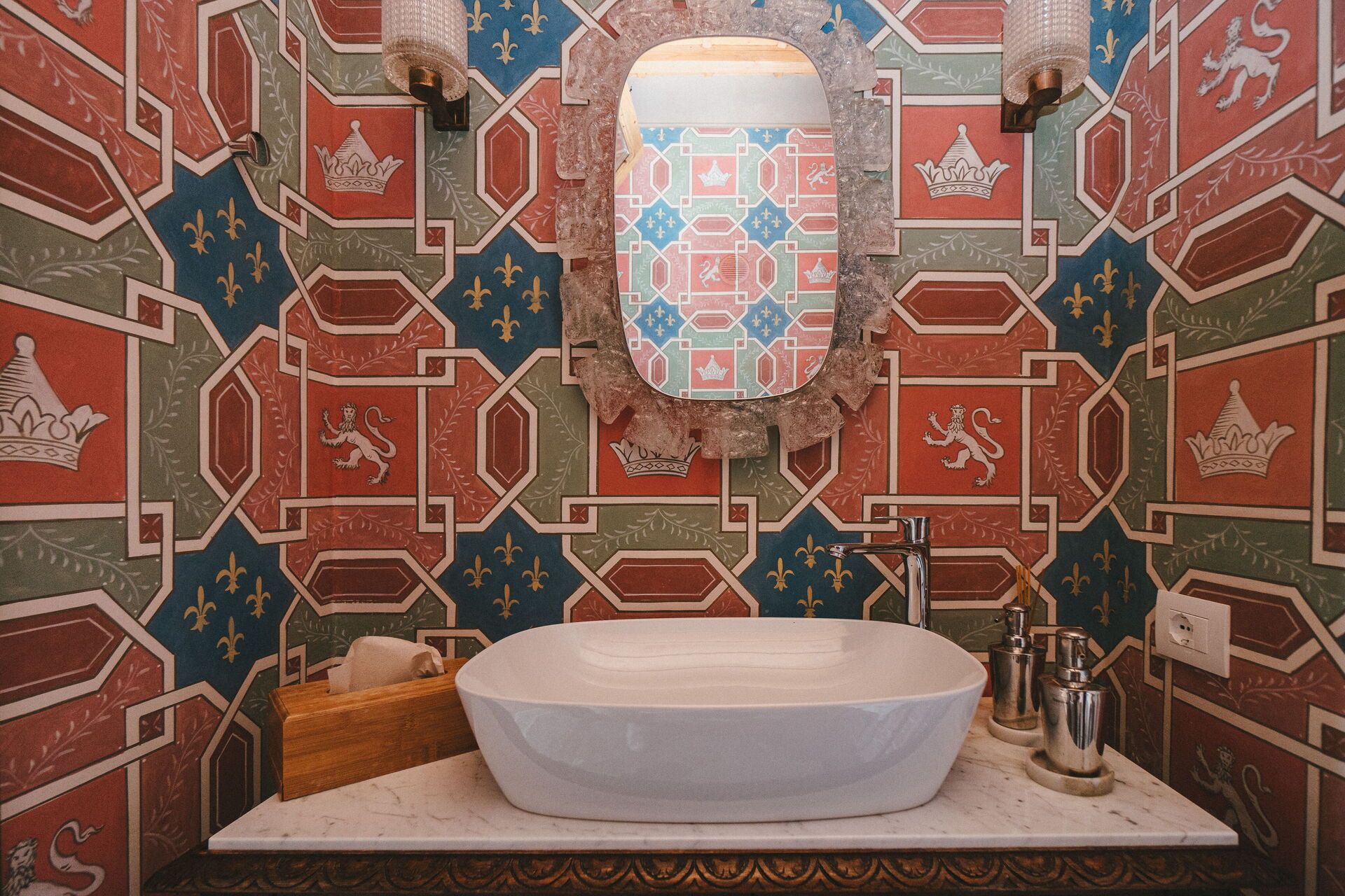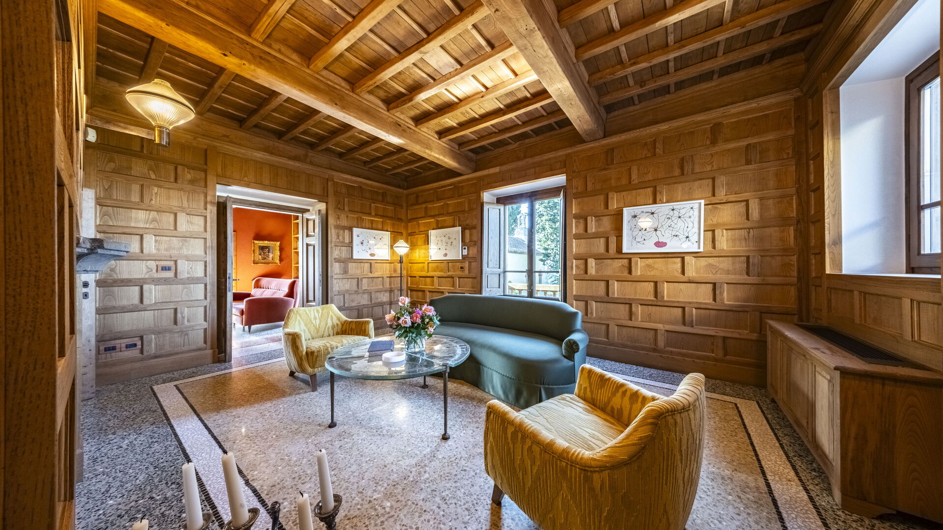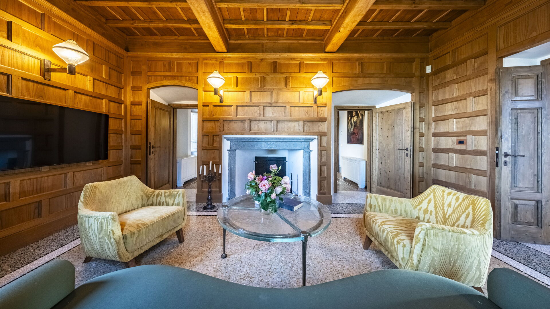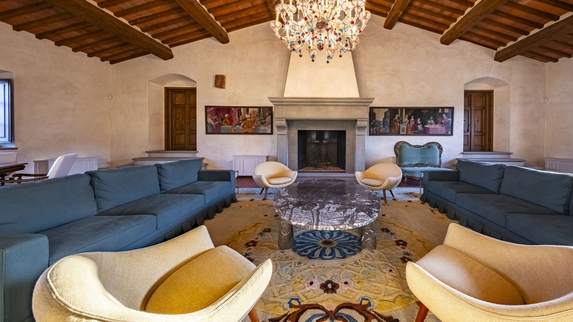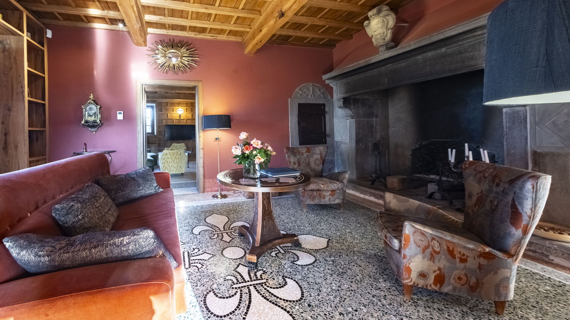 Begane grond: entree en hoofdwoonkamer, kamer met open haard en smart-tv, bibliotheek met open haard (niet bruikbaar), eetkamer met fresco’s, wc.