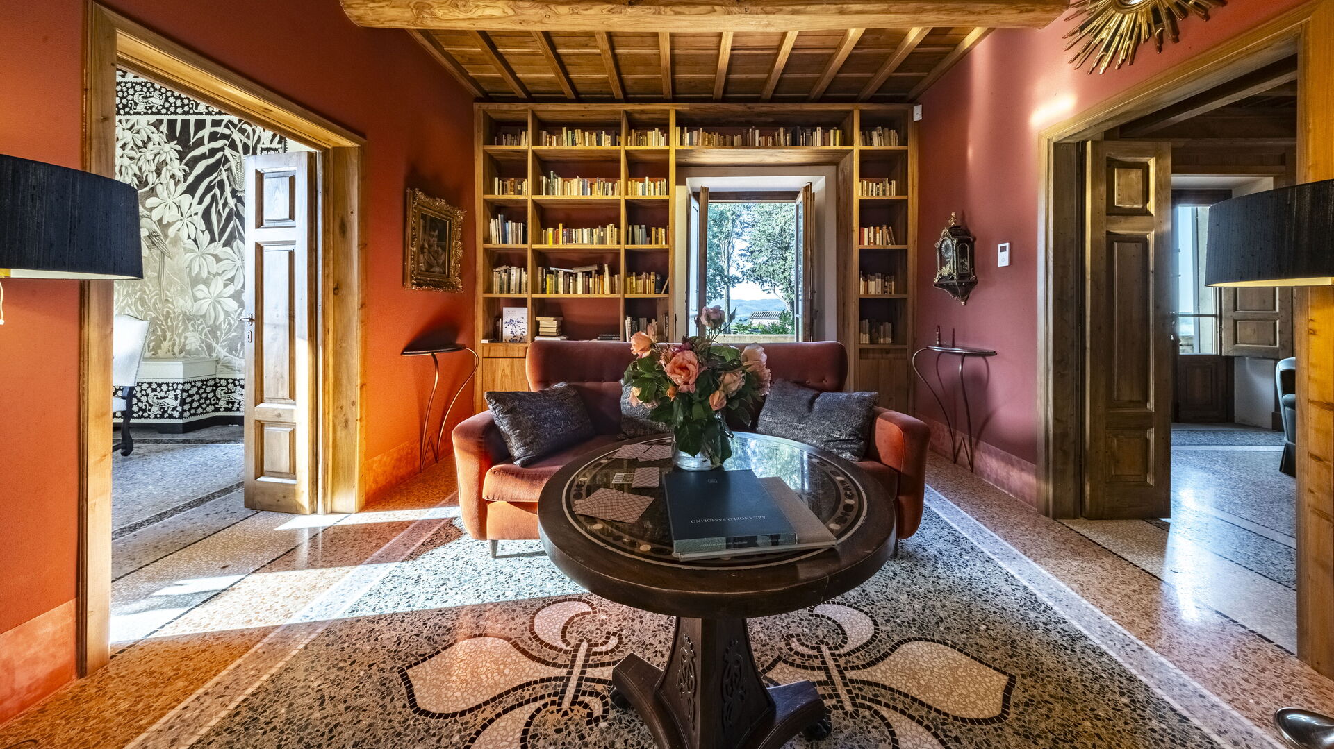 De eetkamer, bibliotheek en de kamer met open haard hebben toegang tot een privéterras met uitzicht op de tuin.