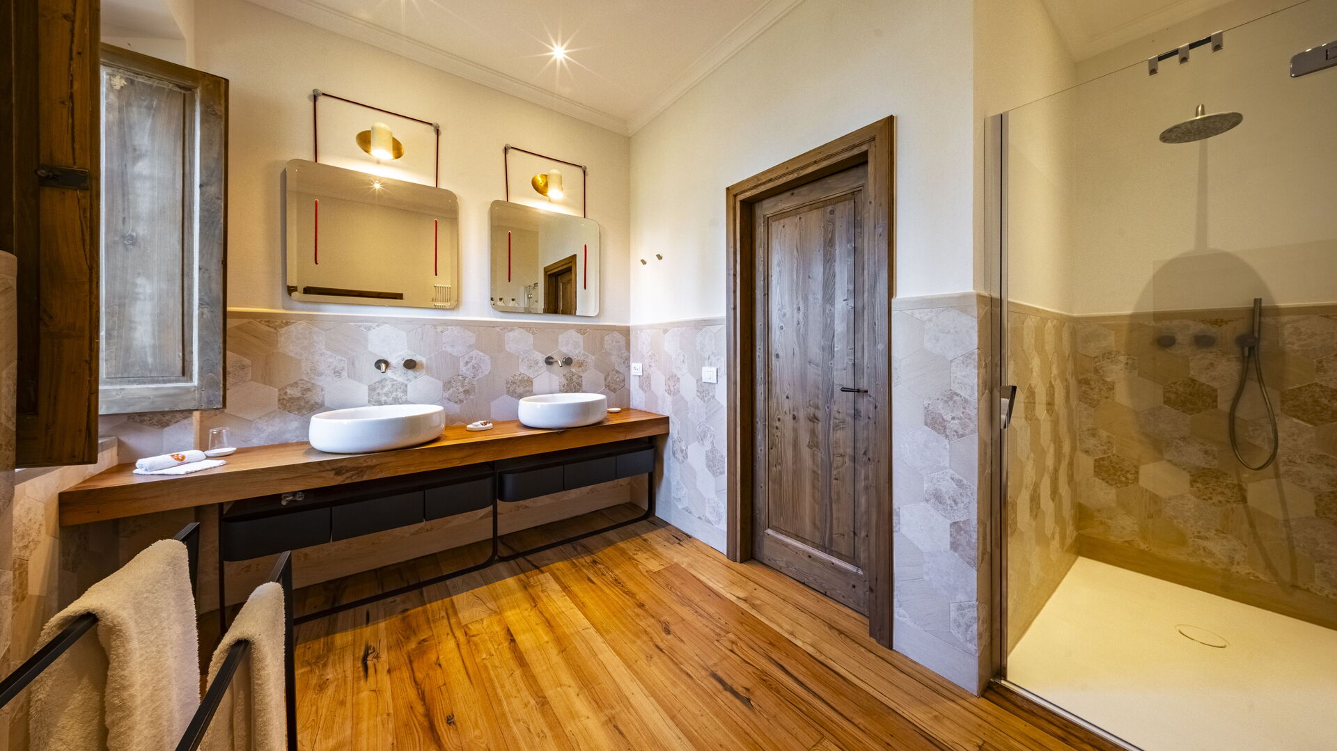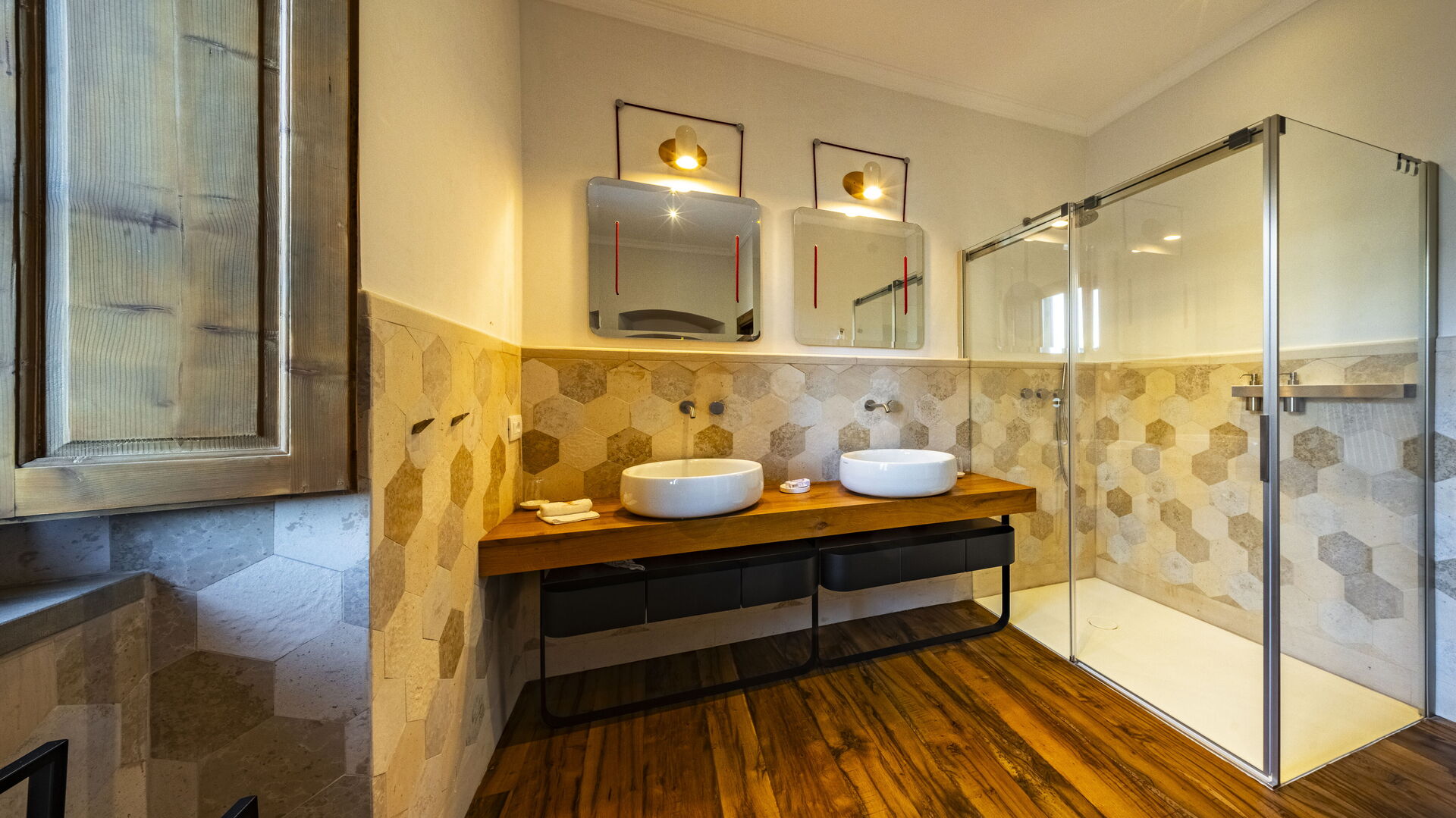 Eerste verdieping: 4 tweepersoonsslaapkamers, elk met een eigen badkamer met douche; 1 suite met kleine woonkamer, slaapkamer (1 trede omhoog) met tweepersoonsbed en eigen badkamer met douche.