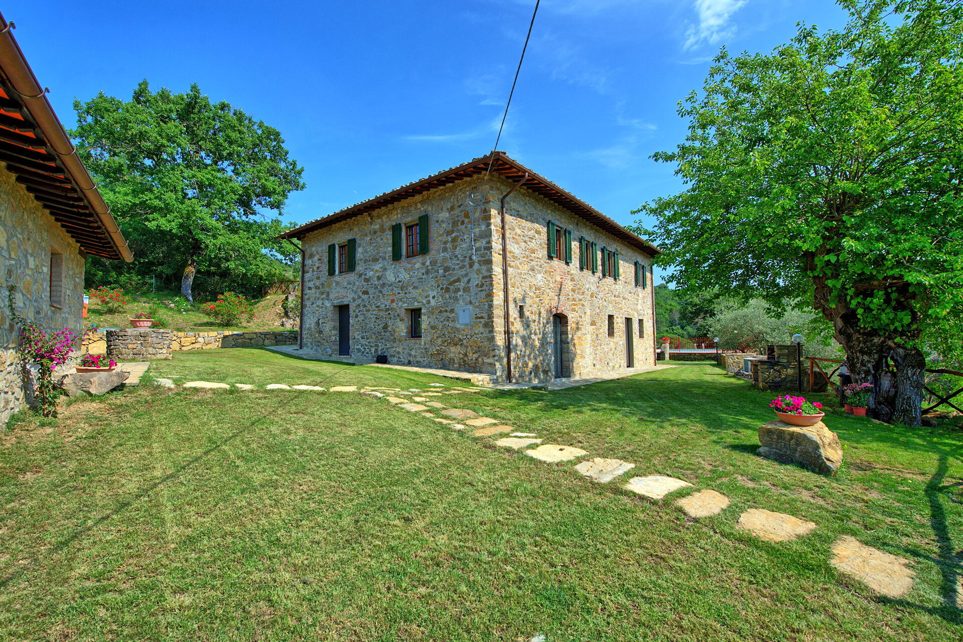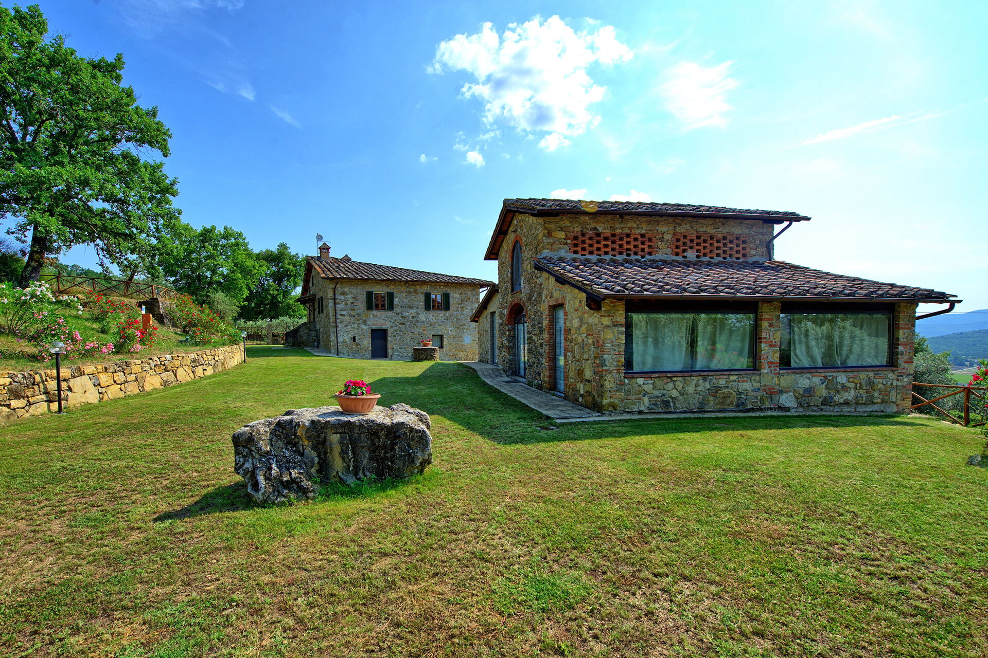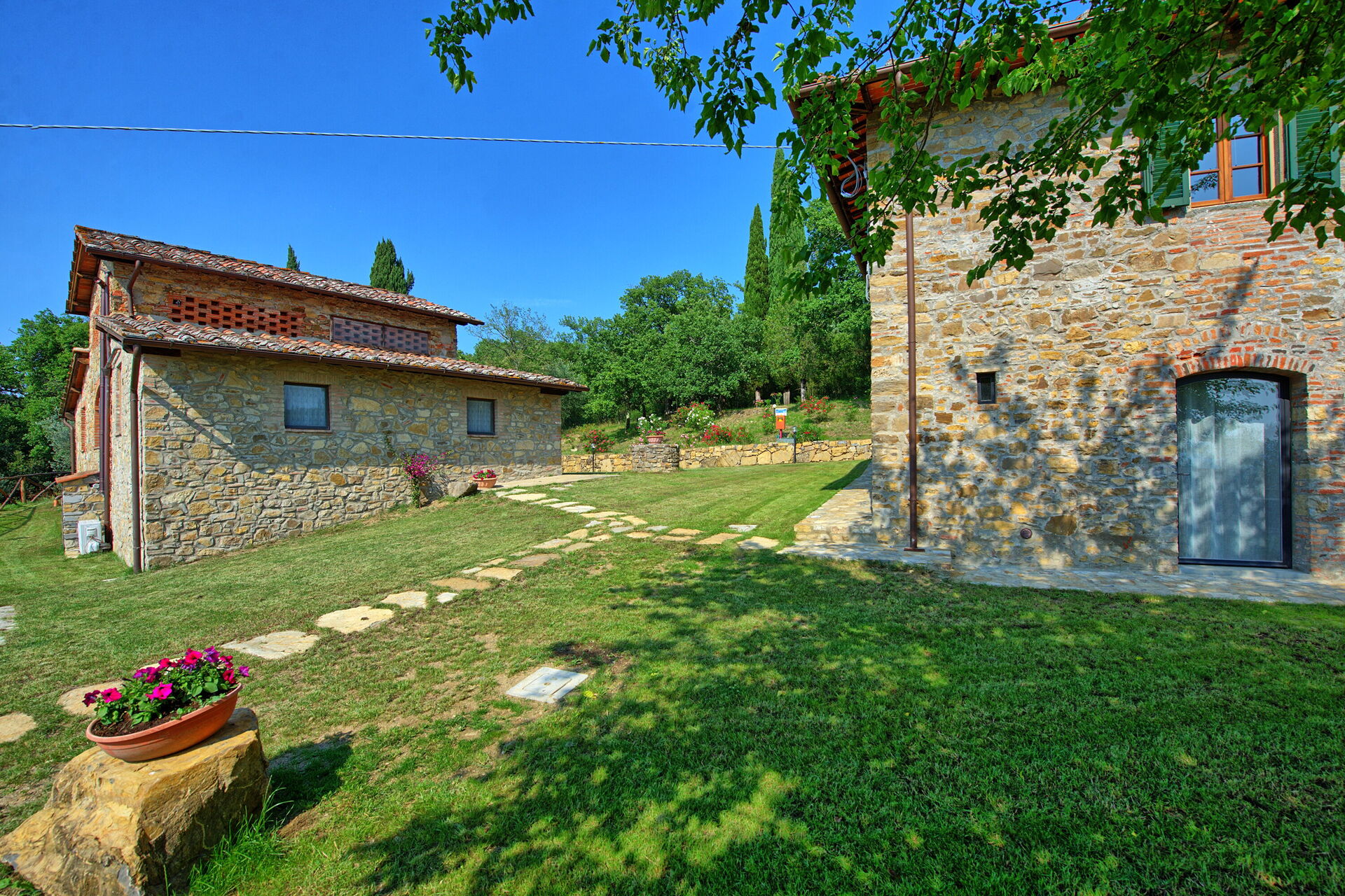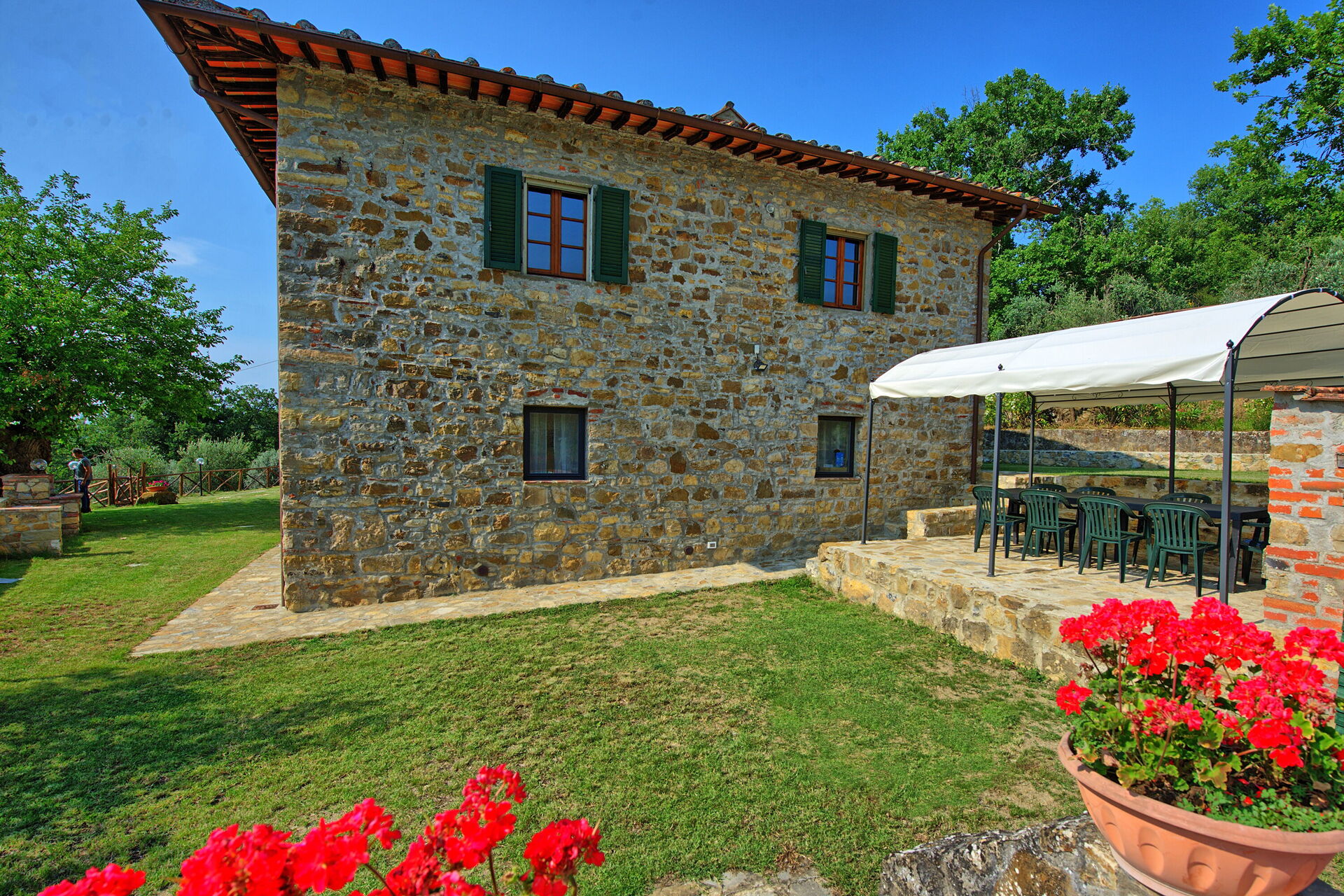 Querciolaia ligt tussen de glooiende heuvels van Chianti en Arezzo en biedt een prachtig uitzicht op wijngaarden, bossen en open velden. De woning bestaat uit een hoofdgebouw met vier slaapkamers en twee badkamers, samen met een aparte gastenverblijf op slechts een paar meter afstand, met twee extra slaapkamers en badkamers - ideaal voor gezinnen en groepen op zoek naar ruimte en privacy.