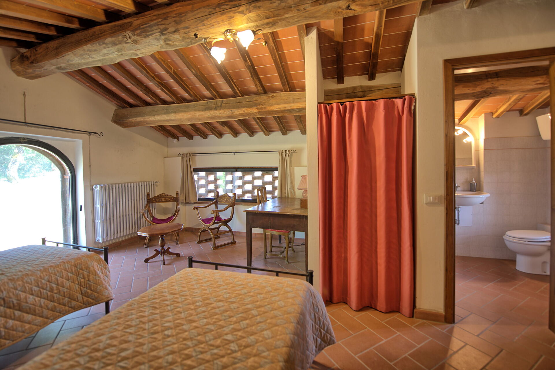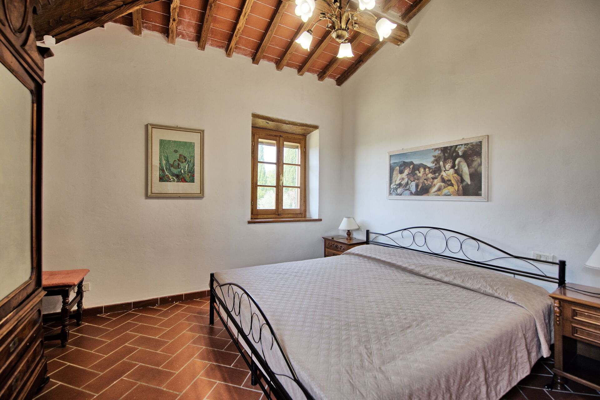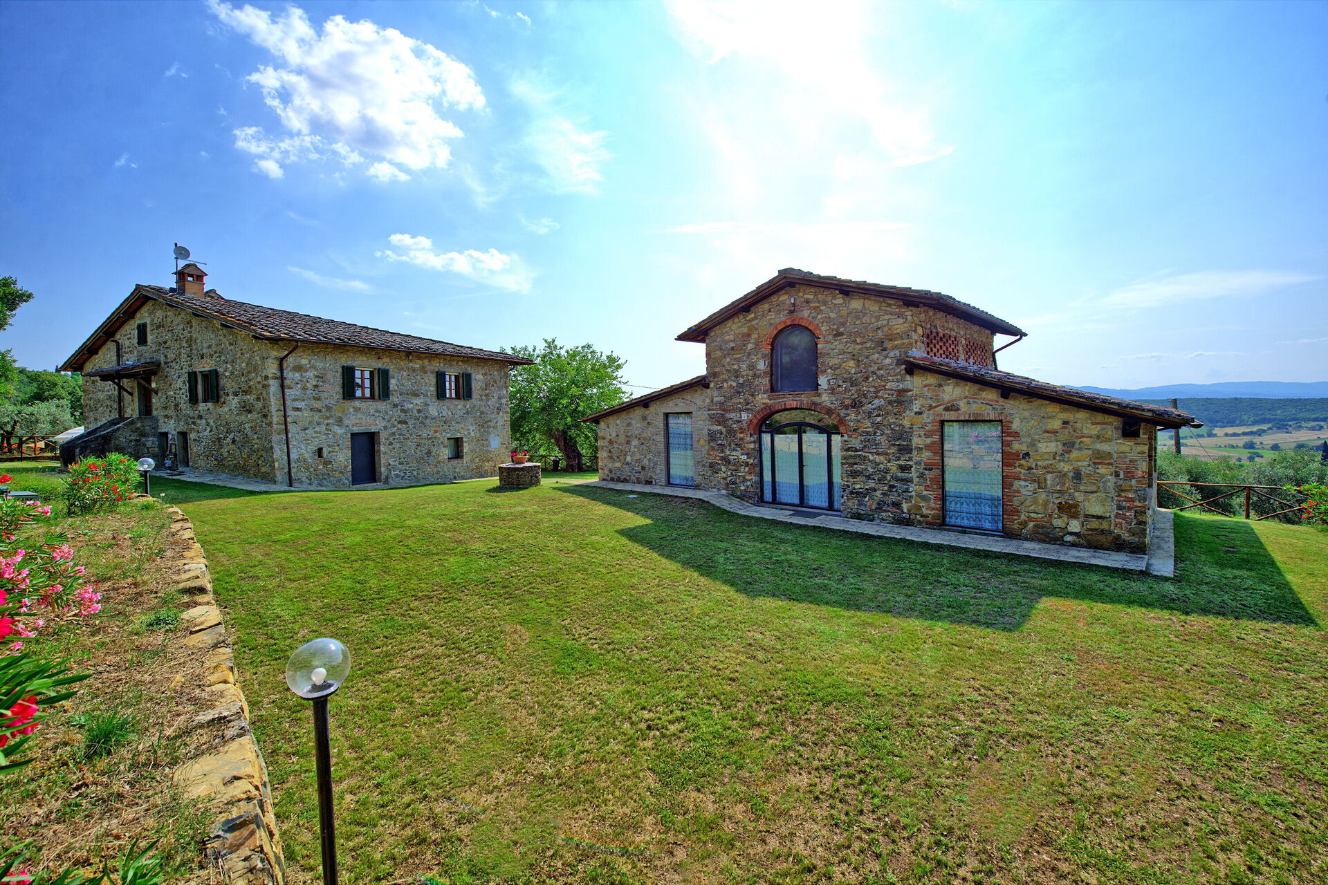 Querciolaia ligt tussen de glooiende heuvels van Chianti en Arezzo en biedt een prachtig uitzicht op wijngaarden, bossen en open velden. De woning bestaat uit een hoofdgebouw met vier slaapkamers en twee badkamers, samen met een aparte gastenverblijf op slechts een paar meter afstand, met twee extra slaapkamers en badkamers - ideaal voor gezinnen en groepen op zoek naar ruimte en privacy.