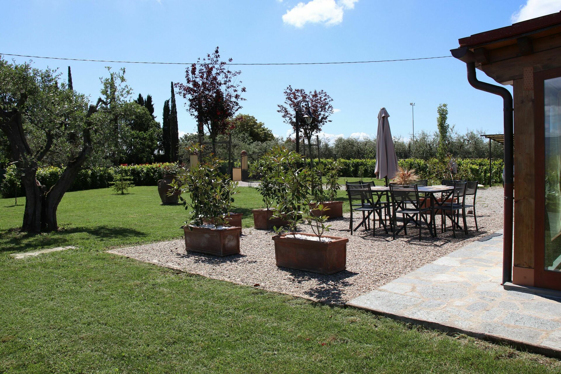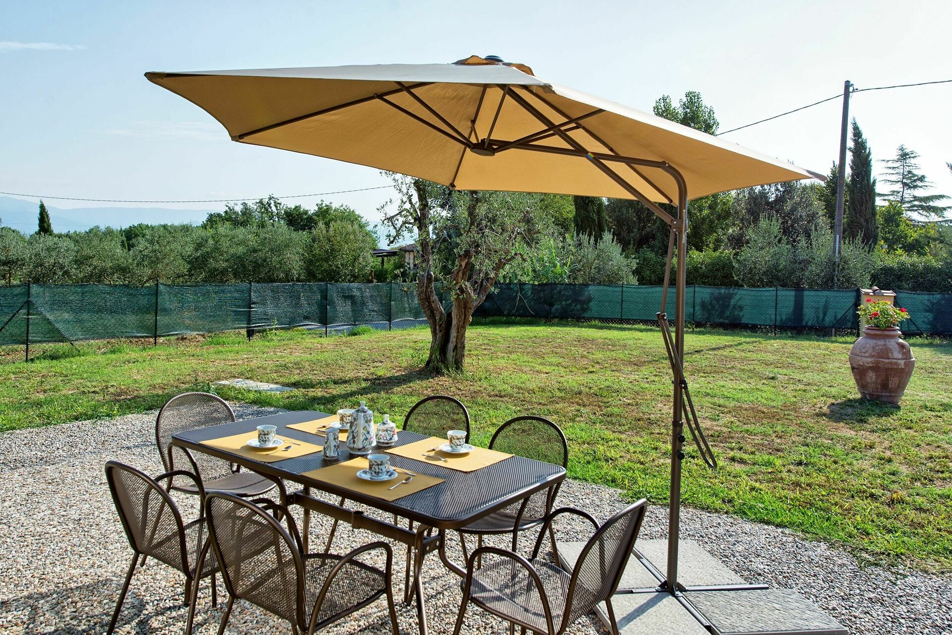 • ruimte waar men buiten kan eten met parasol, tafel en stoelen