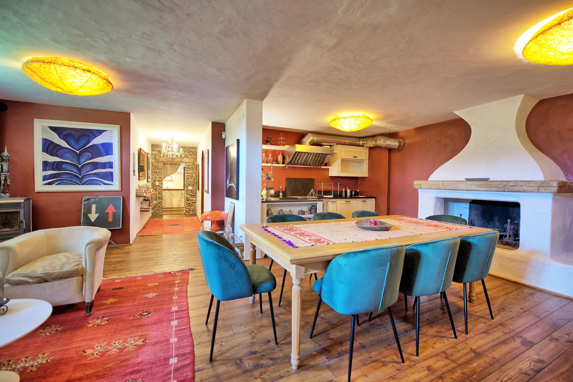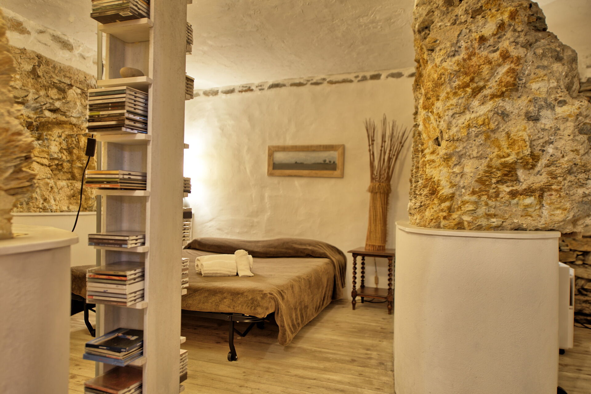 Souterrain: grote eetkeuken (industrieel design) (oven, diepvriezer, vaatwasser, magnetron, broodrooster) met open haard (sat-TV), slaapkamer met tweepersoonsbed met badkamer met douche, kamertje gemaakt uit de rots met tweepersoonsbedbank (geschikt voor tieners of huishoudelijk personeel).